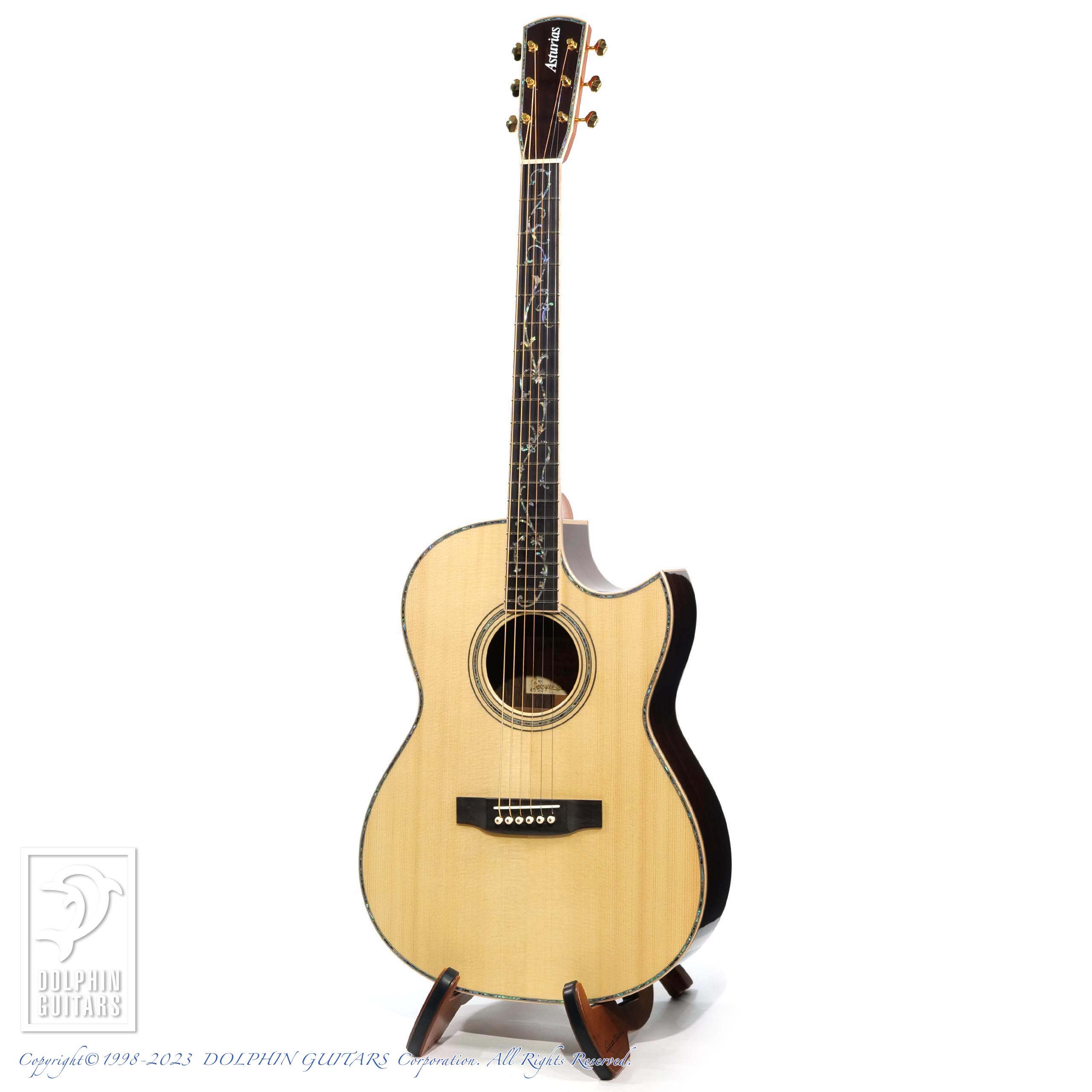 アストリアスの数あるラインナップの中でも一際華やかなモデル。色白のジャーマンスプルーストップに、ボディ、ロゼッタを囲うアバロンインレイ、そしてモデル名にもなっている"ツリー・オブライフ・インレイ"が指板に美しく輝いております。