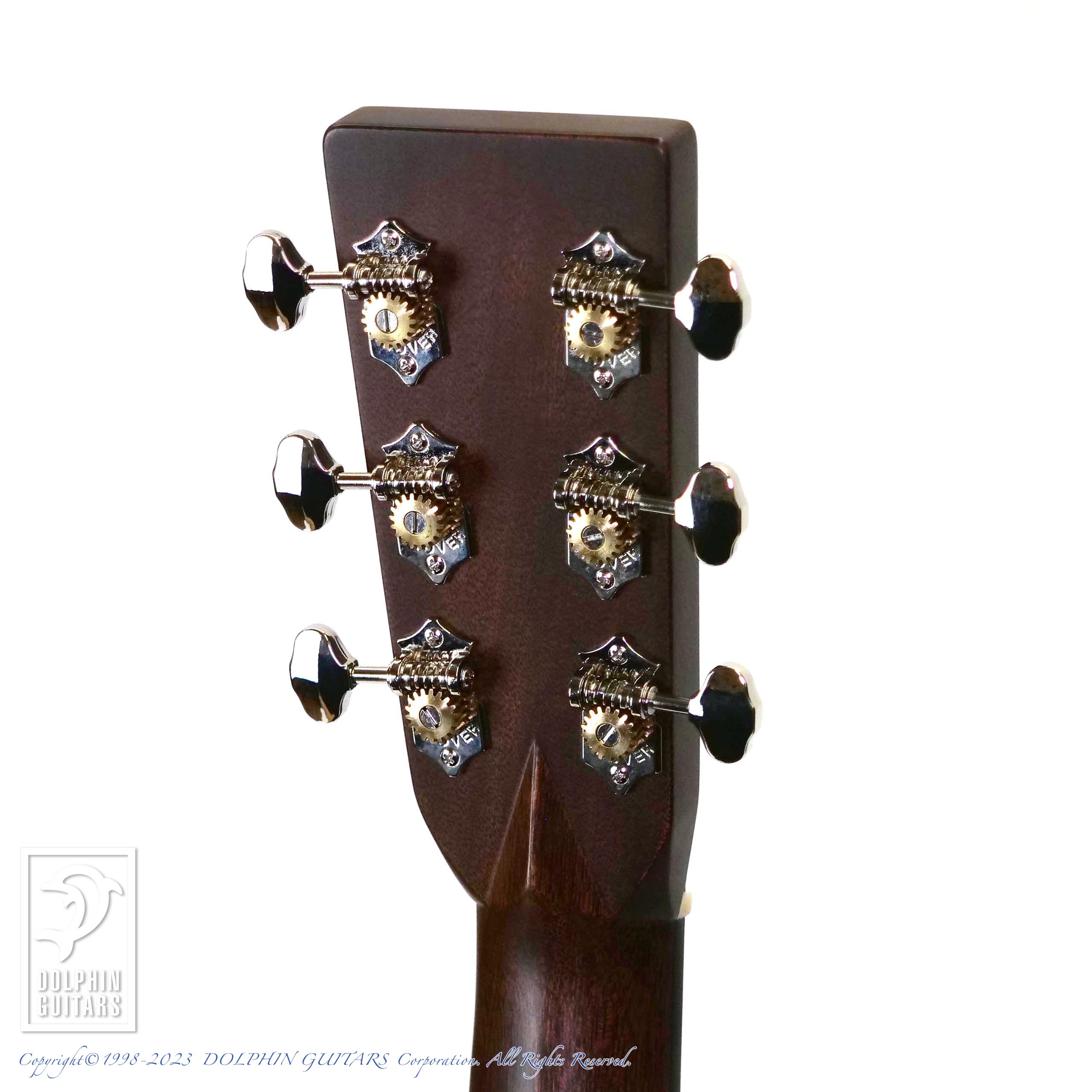 ヘリングボーントリム、ダイヤモンドインレイ、オープンギアチューナー、エイジングトナー・フィニッシュ、べっ甲柄のピックガード、デカールロゴなどのビンテージディテール、44.5mm幅のネックはローポジションからハイポジションにかけてテーパーが少ない、スリムなロープロファイルネックを採用、フィンガーピッキングに最適な形状とも言えます。