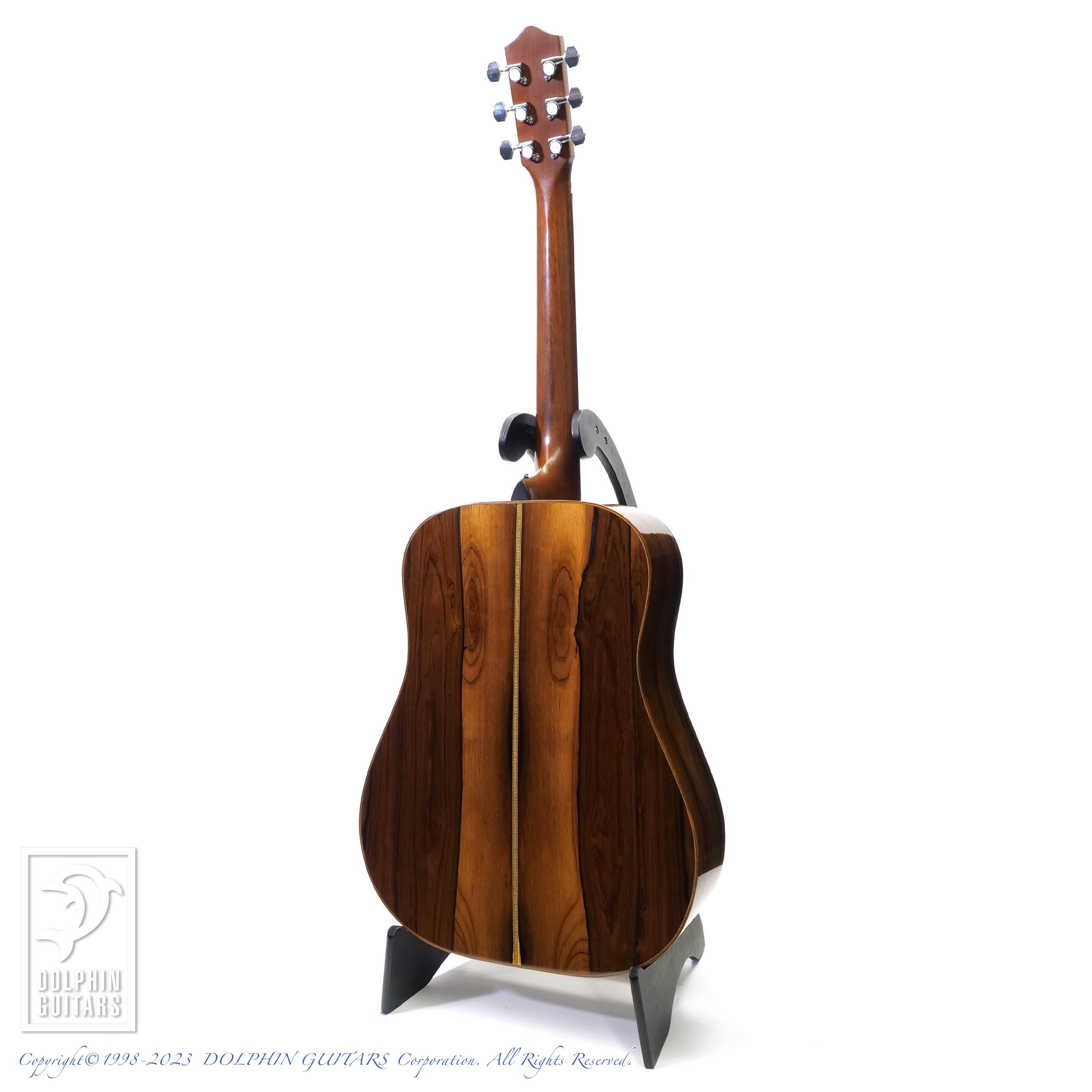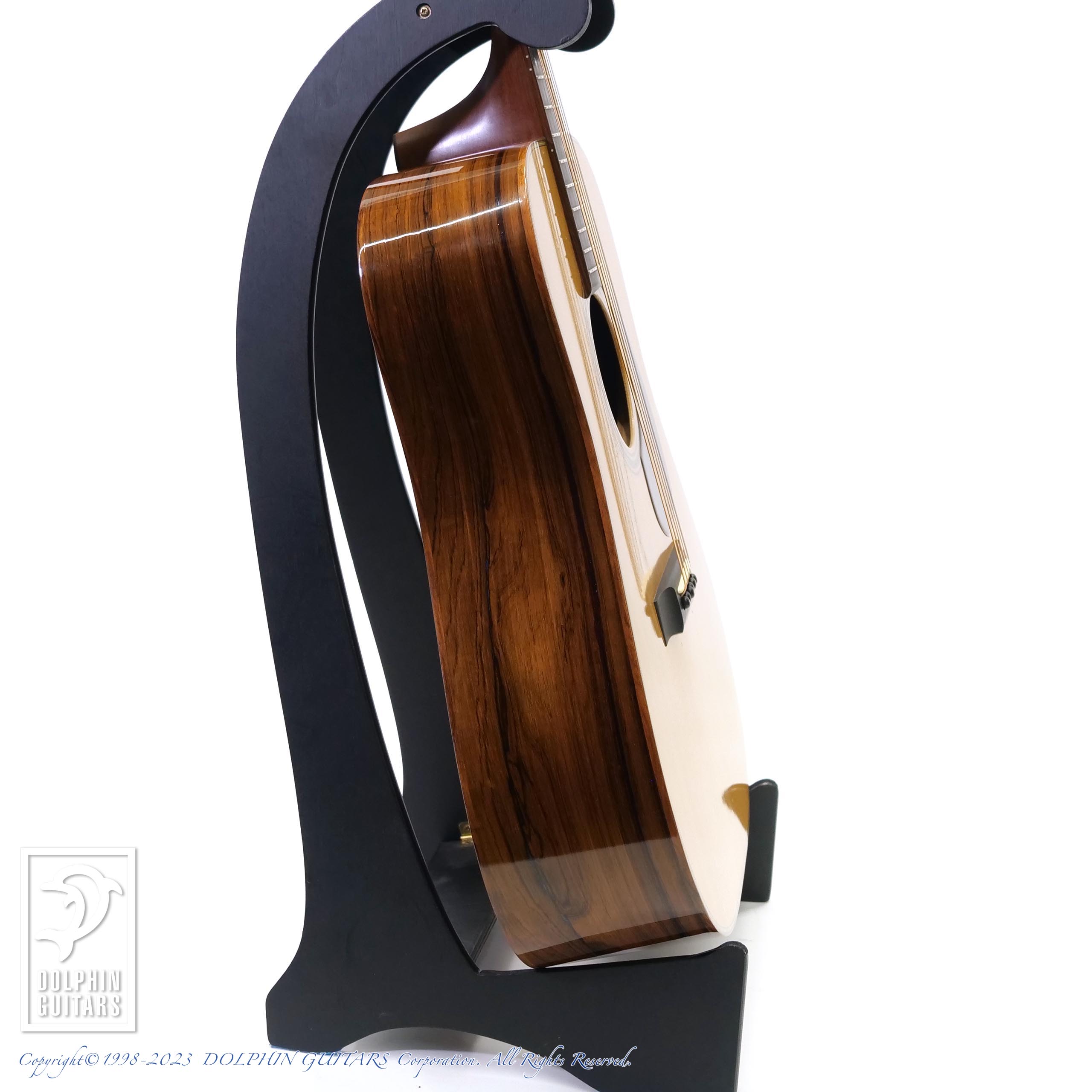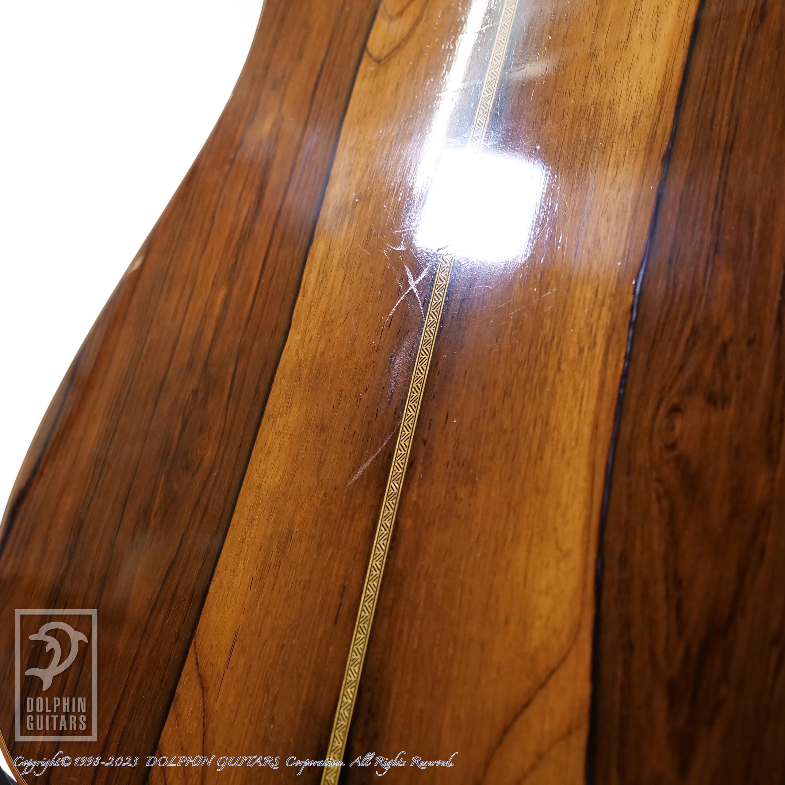 シンプルにヘリンボーントリムで飾られた渋い一本。トラディショナルなドレッドノートシェイプながらも一目見てグレーベン氏の作品と分かるオーラがございます。渋く焼けたトップは木目の質感からおそらくグレーベン氏お気に入りのルッツスプルースかと思われます。サイド&バックはワイルドな 木目のハカランダが使用されており、木目を楽しむ方も納得の佇まいです。