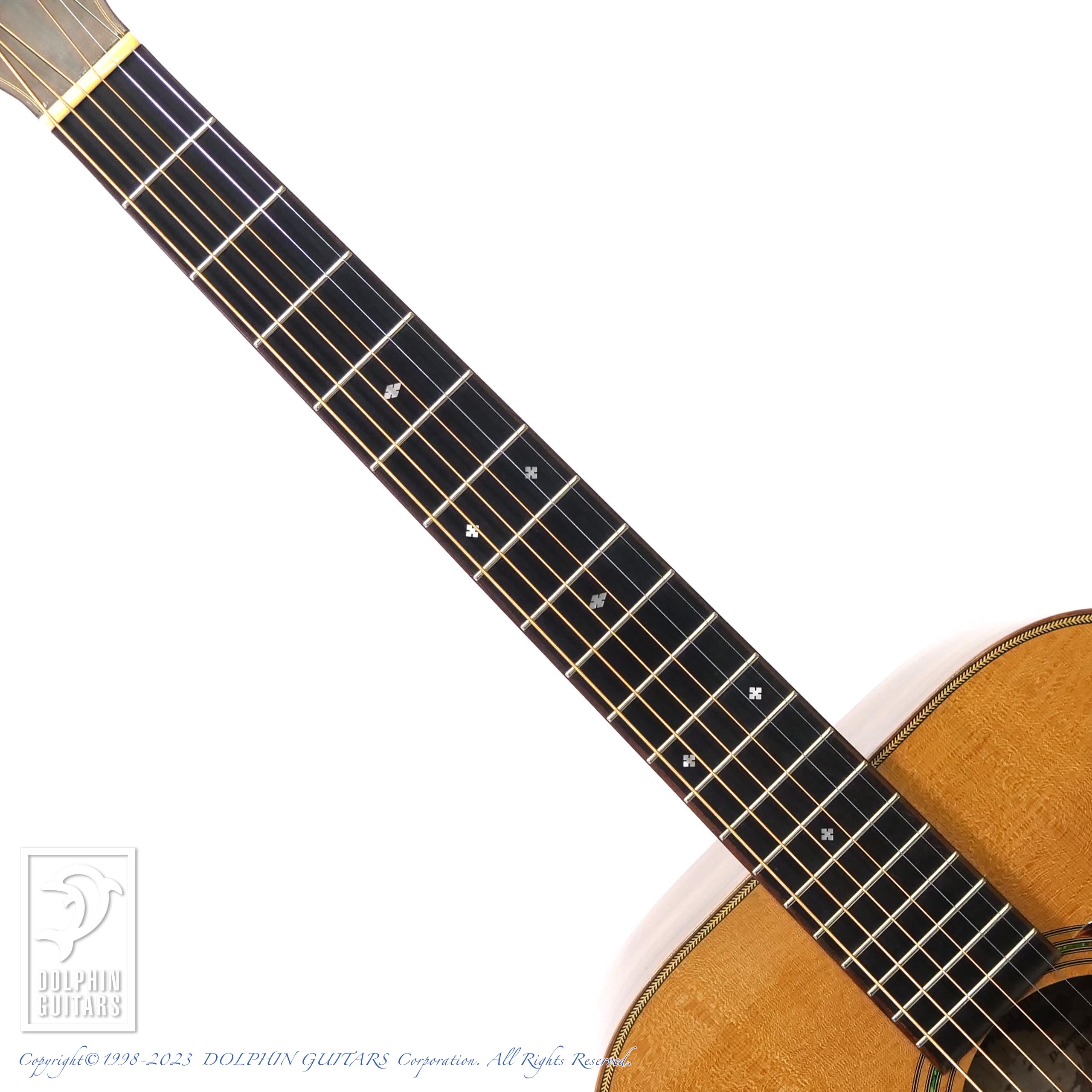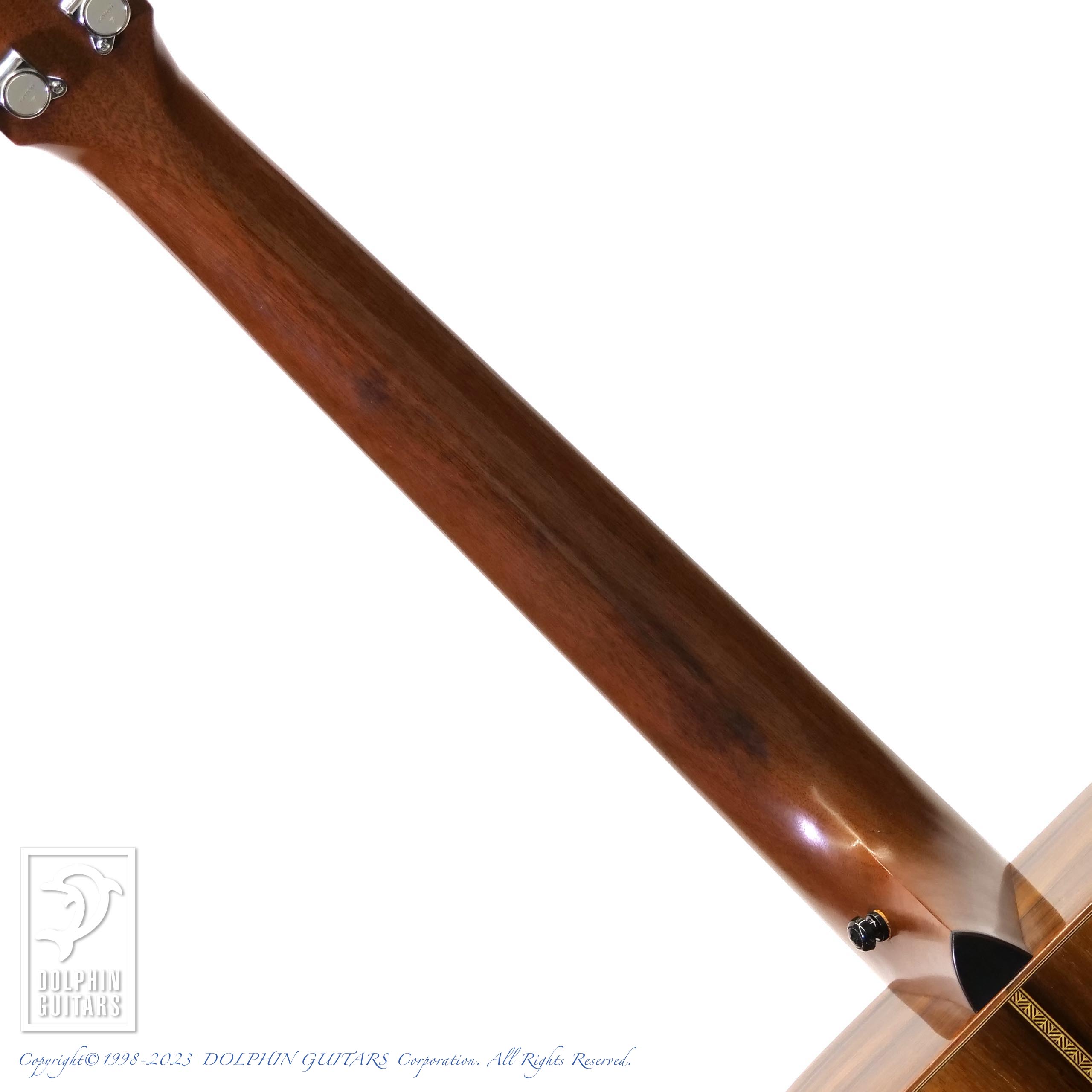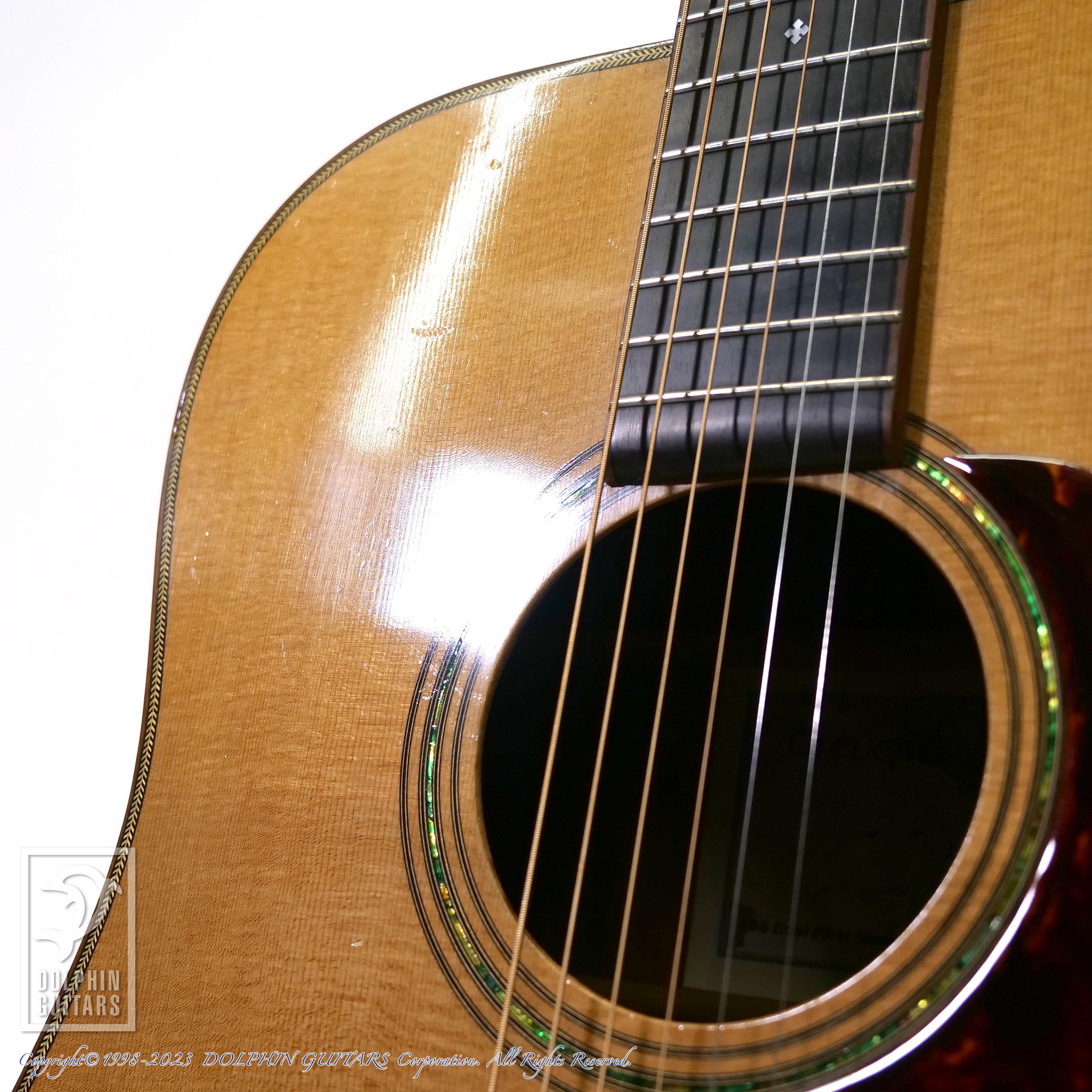 シンプルにヘリンボーントリムで飾られた渋い一本。トラディショナルなドレッドノートシェイプながらも一目見てグレーベン氏の作品と分かるオーラがございます。渋く焼けたトップは木目の質感からおそらくグレーベン氏お気に入りのルッツスプルースかと思われます。サイド&バックはワイルドな 木目のハカランダが使用されており、木目を楽しむ方も納得の佇まいです。