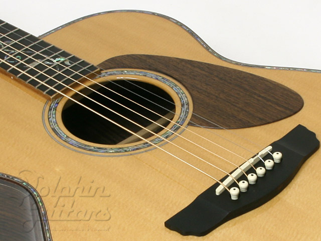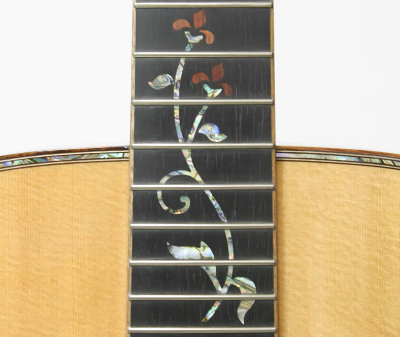 指板には花のインレイ、ピックガードは木製、サウンド・ホール・ロゼッタはアバロンの2重巻き等手の込んだ仕様は、ステージでも栄える事間違い有りません。