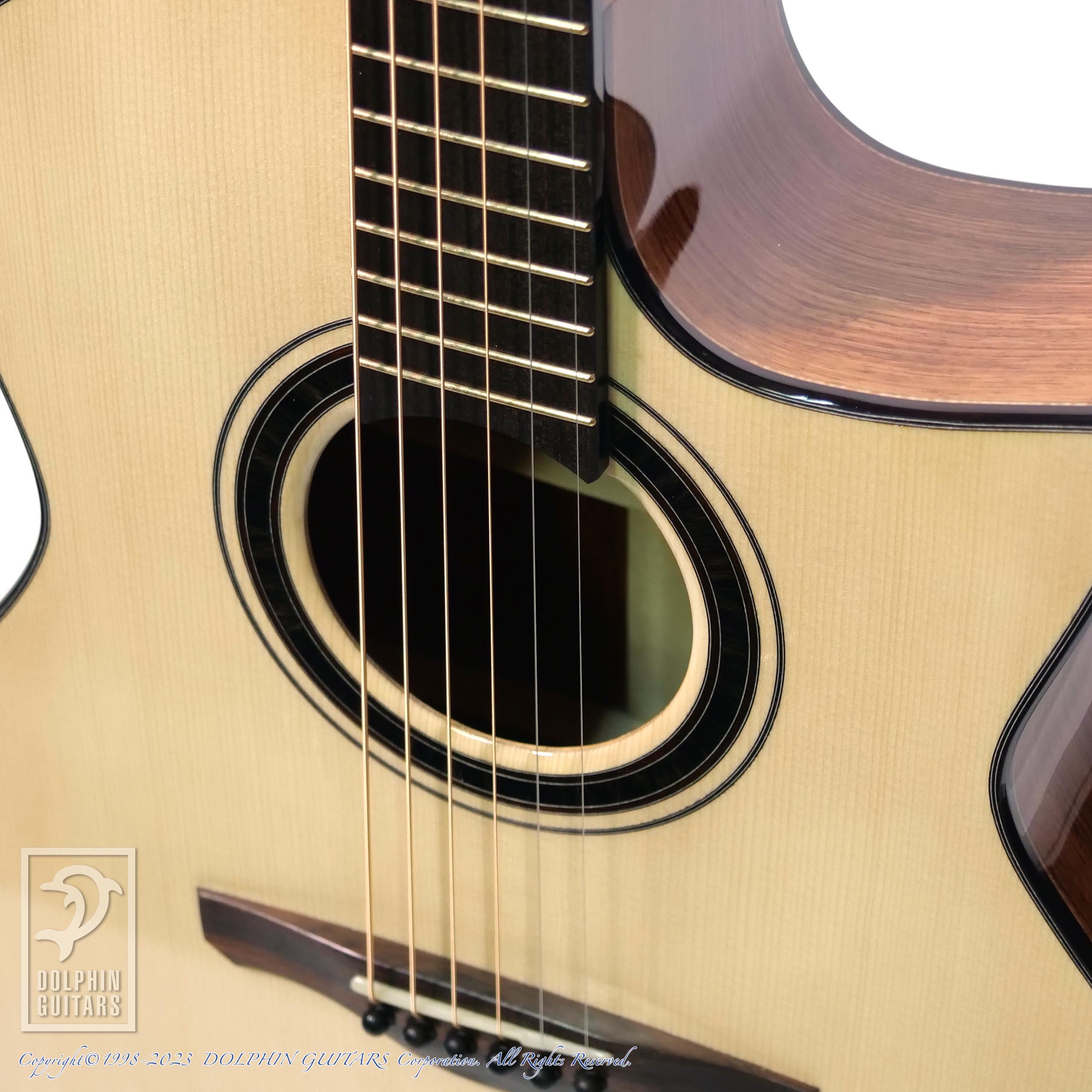 見るからに剛性の高そうなローズから放たれるサウンドは、想像通りの重厚な低音と、繊細で美しいトーンの高音が合わさり、非常に華やかな印象です。現在のNISHIHARA GUITARSは柔らかいタッチでもふくよかに響くようチューニングされ、よりリラックスして演奏に集中できるでしょう。ただそれは見誰が弾いても一律に鳴ってくれるギターではなく、入力に対するキャパが多く、弱く弾けば繊細に、しっかり弾くと漏らすことなく応えてくれる、プレイヤーの表現力に忠実に響きます。それゆえ初めはやや硬く感じるかもしれませんが、こういうギターは弾き込みによってどんどん変わってきますので、そこもお楽しみいただけると思います。