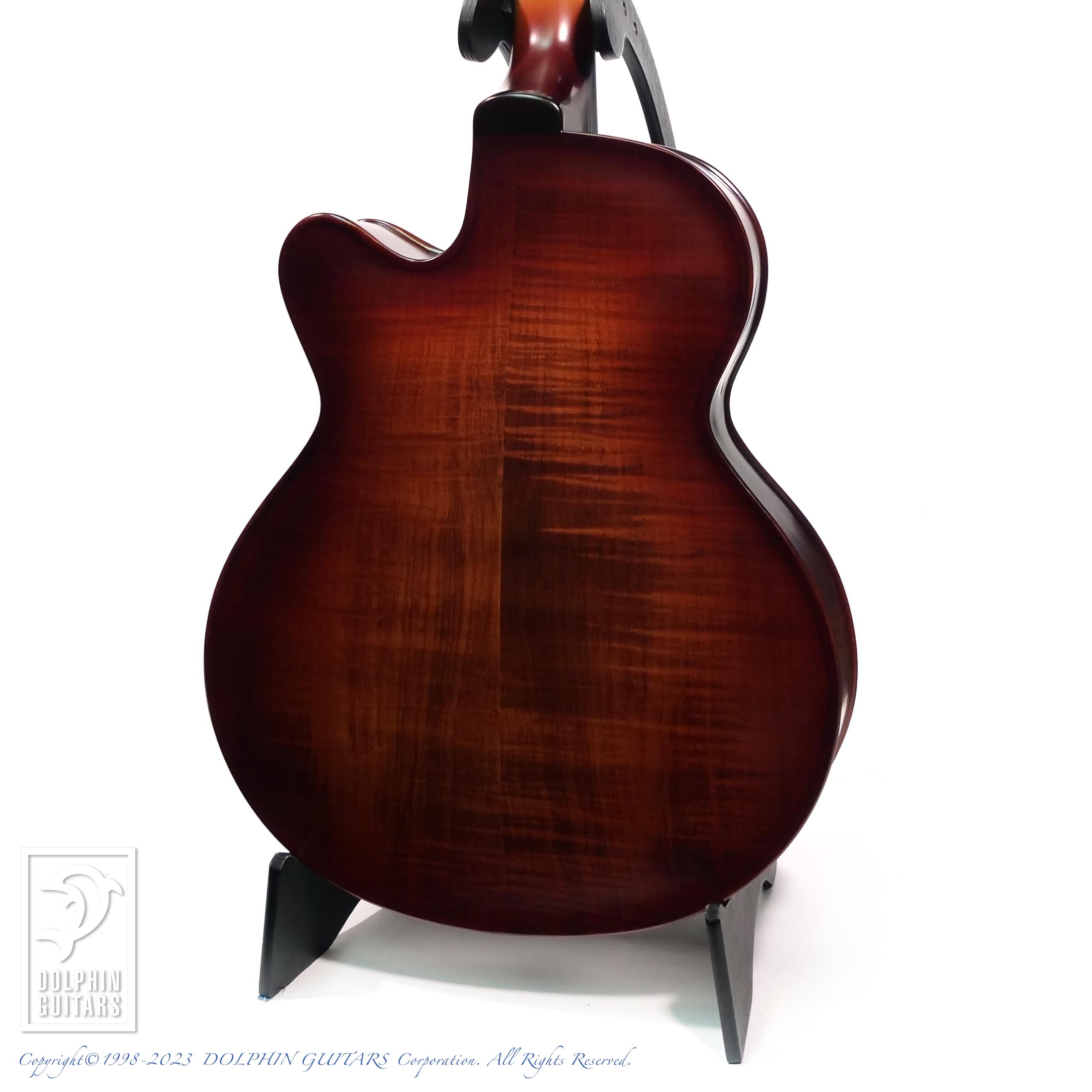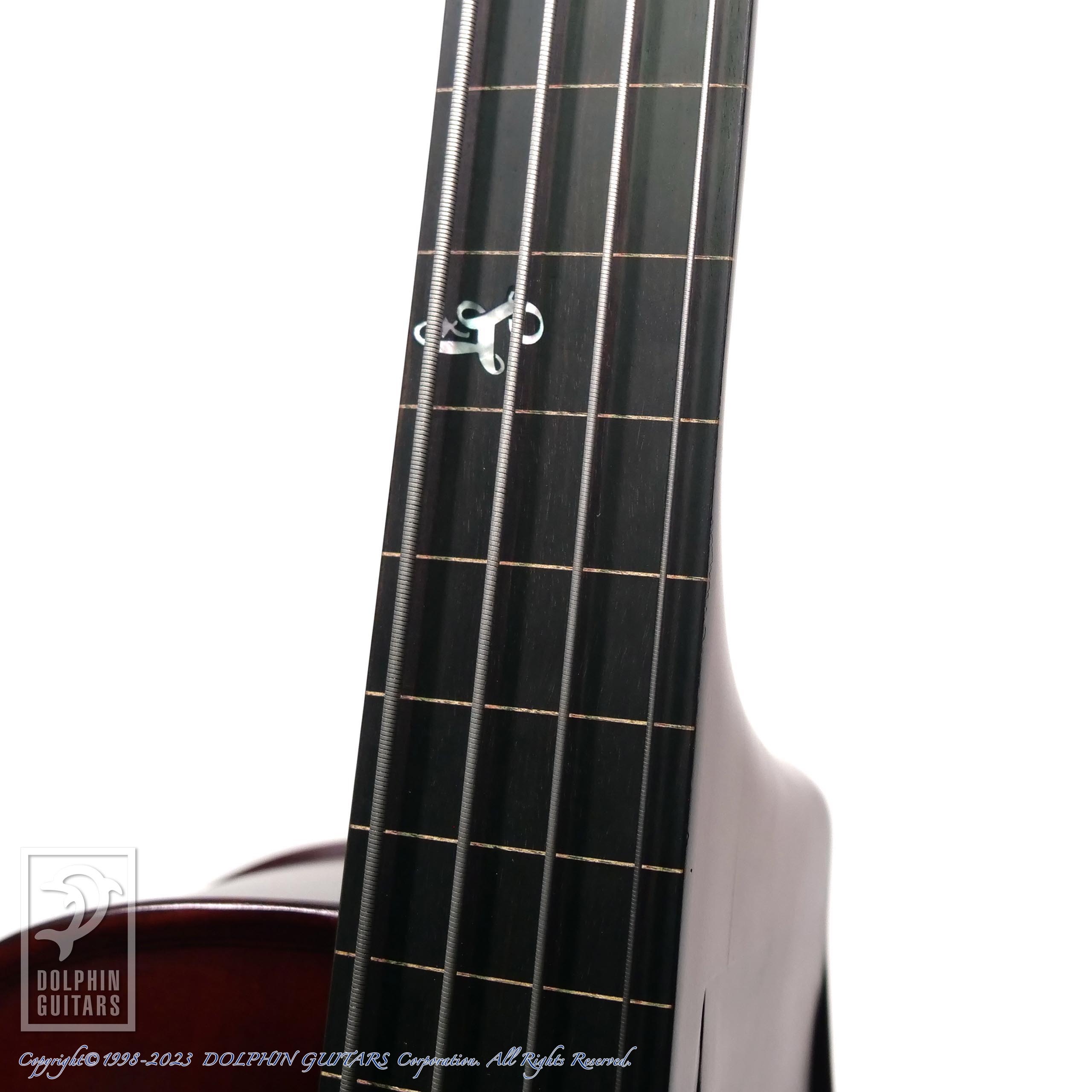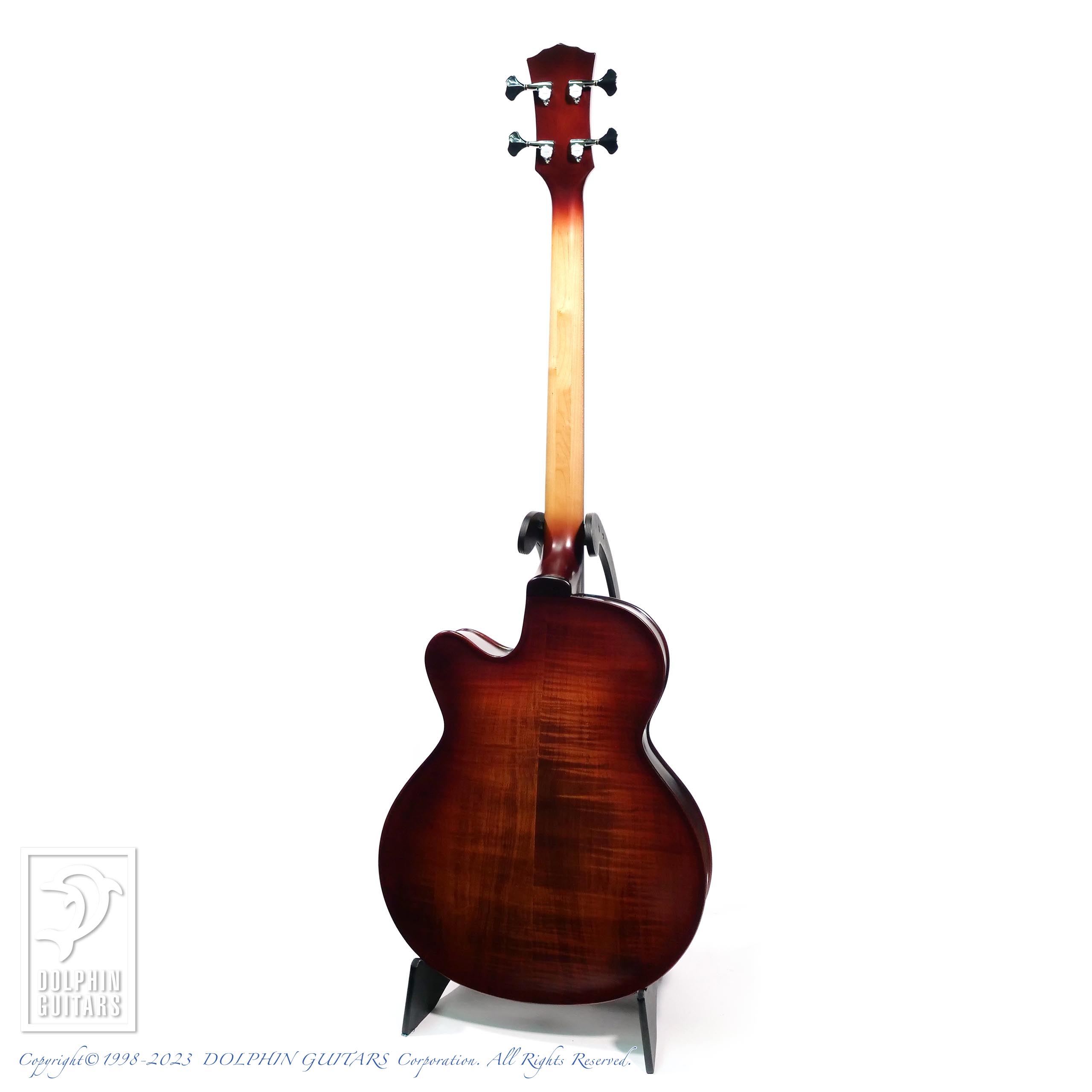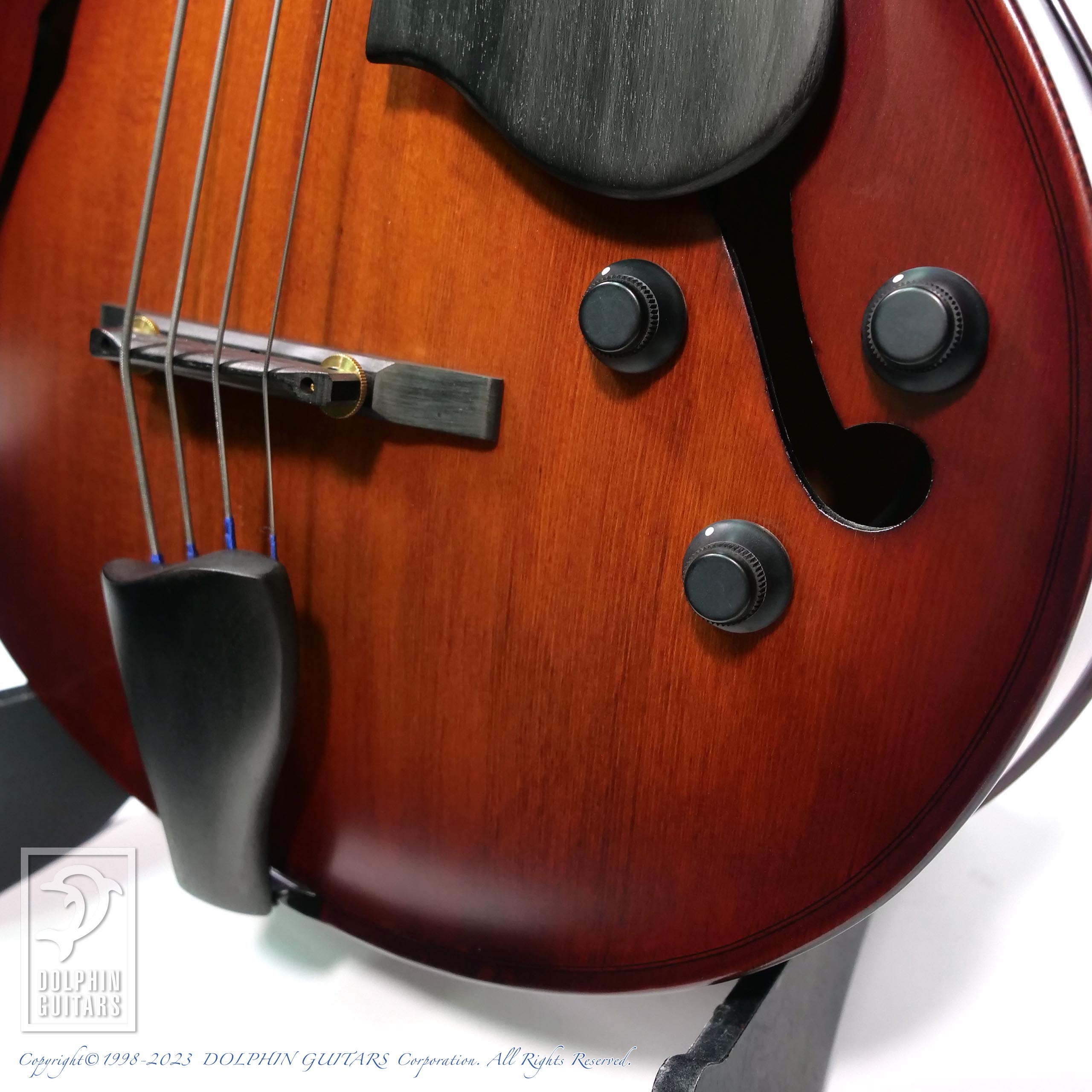 素材からくる木の箱なりを重要ポイントとしているが、通常のアコースティックとは違いジャズギターと同じコンセプトでつくられているので、大きい箱なりから誘発されるハウリングを軽減。ピックアップはネック側にマグネティックのフローティングタイプとブリッジに組み込んだピエゾピックアップをブレンドさせて音作りが可能です。弾き手のタッチの変化にきちっと反応してくれるので、アップライト方からソリッドなテイストまで幅広いニュアンスが楽しめる。弾きこむごとに鳴りが良くなっていく経年変化も楽しめます。