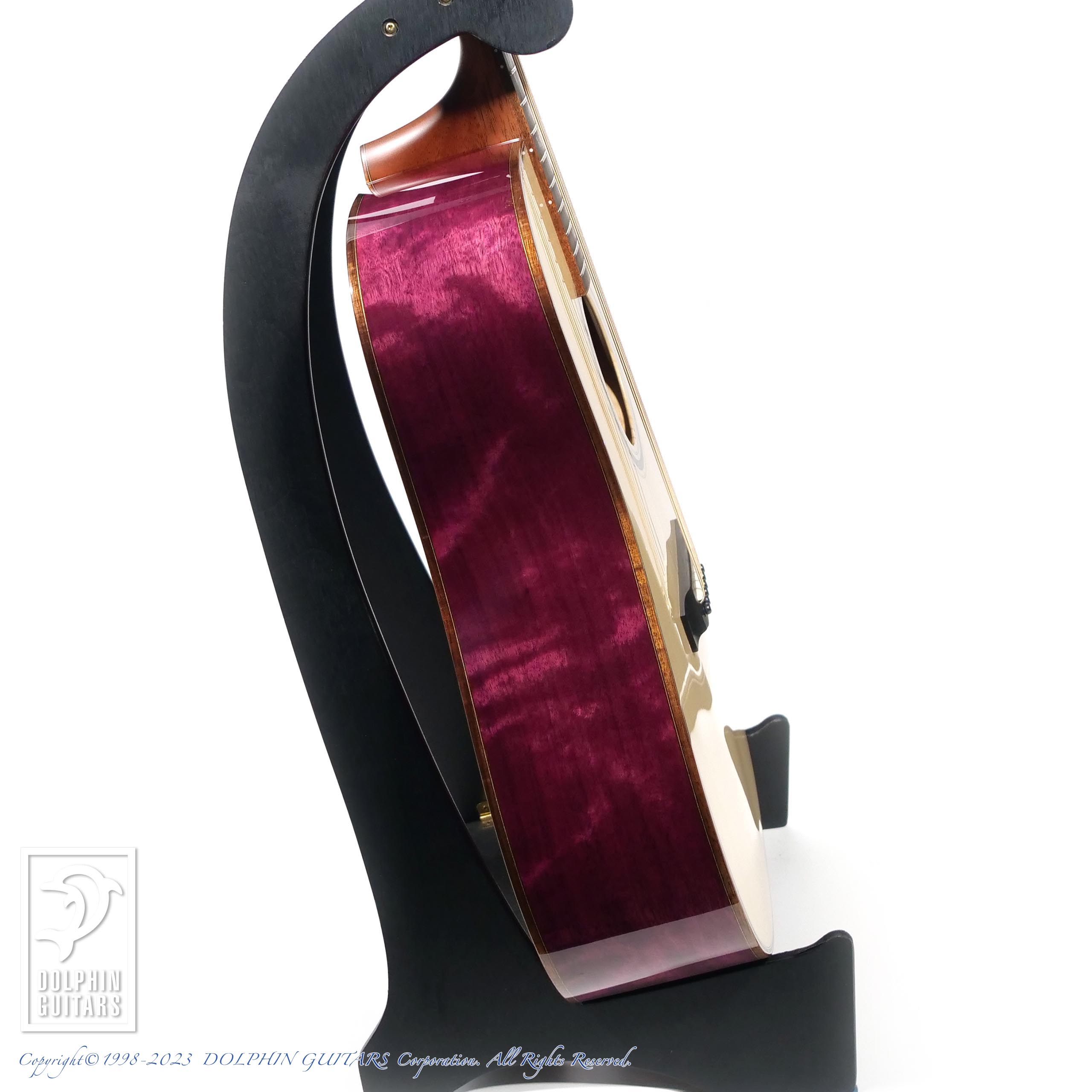 パープルハートは、硬質で加工が難しいため一般的には使用されにくい素材ですが、半世紀以上の歴史と経験があるMorrisだからこそ実現したギターです。鮮やかで美しい天然の紫色が最大の特徴です。コアバインディングなどの色合わせはなんとも独特で、エキゾチックで存在感のあるたたずまいです。