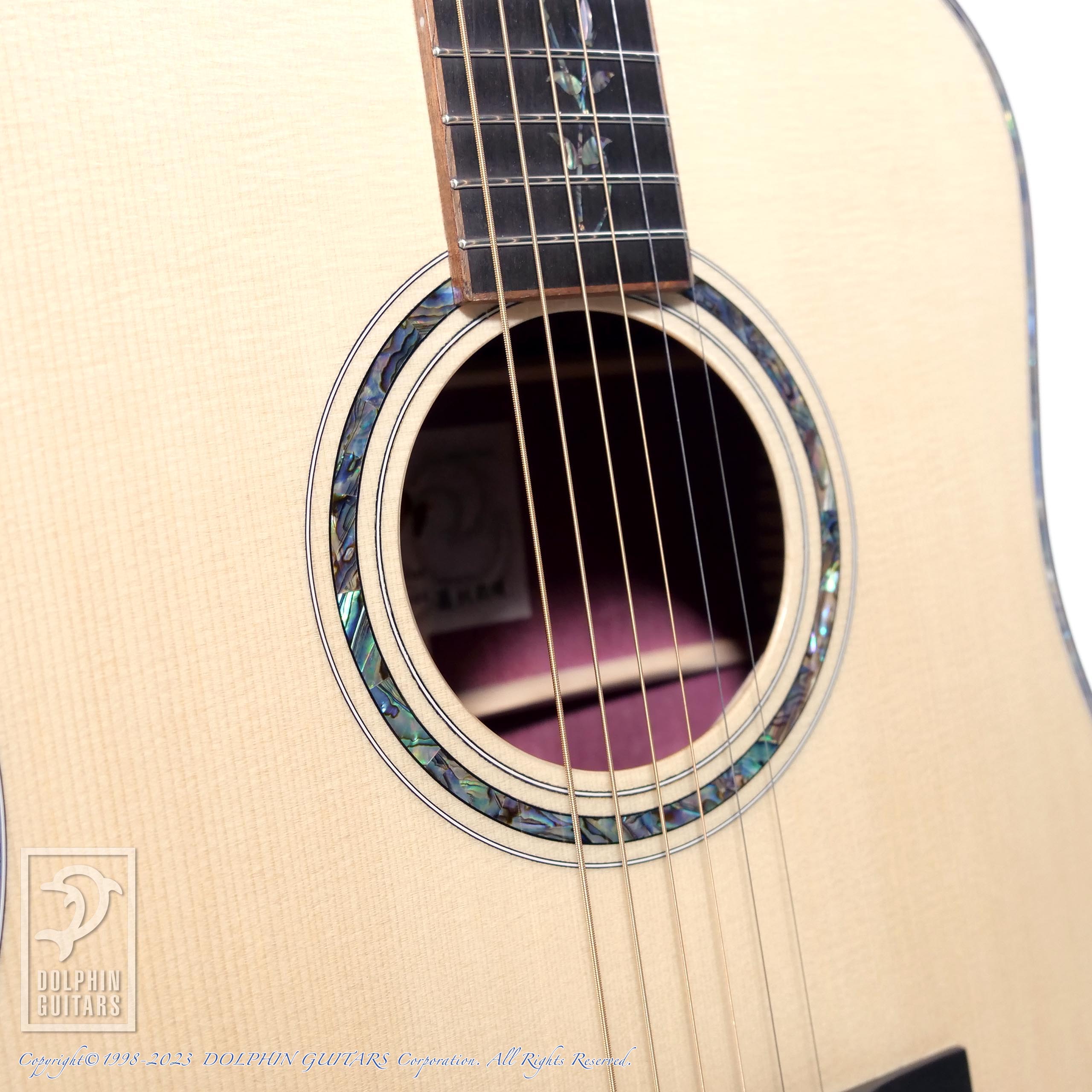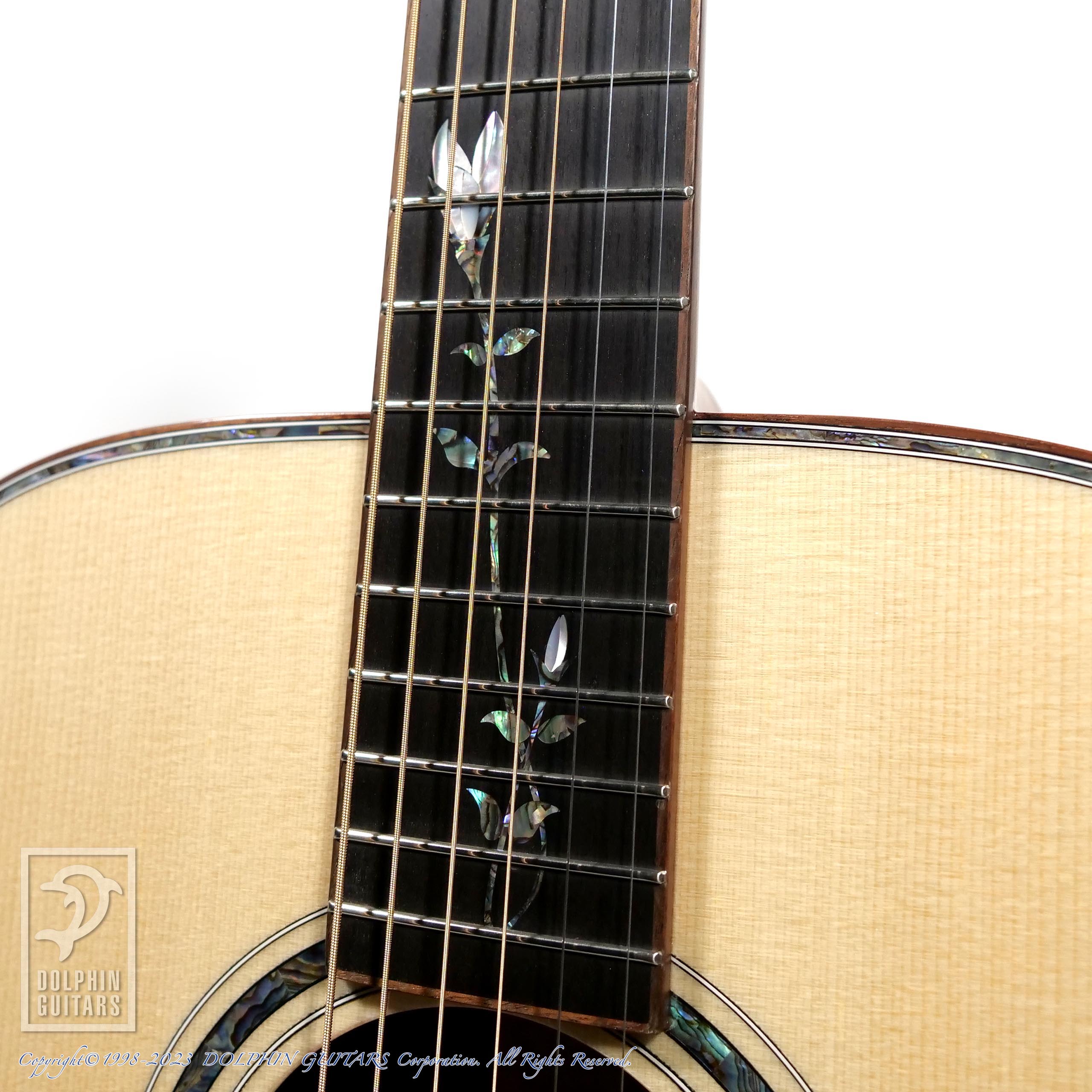 最高級のエボニーフィンガーボードにはリンドゥをモチーフにした美しいインレイ。ボディトリムやロゼッタには美しいアバロンシェルの飾りが光ります。