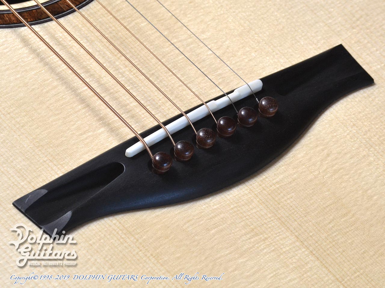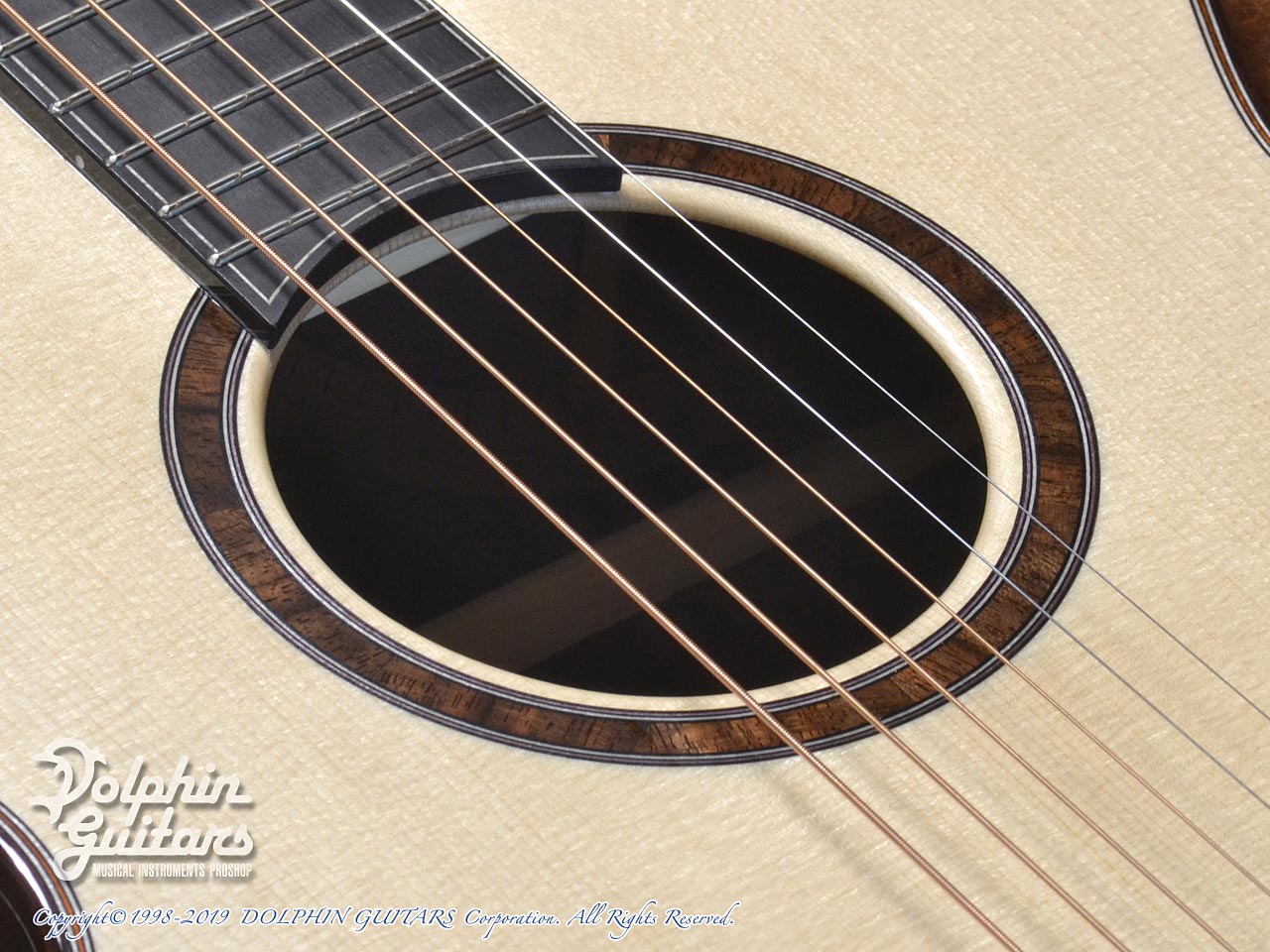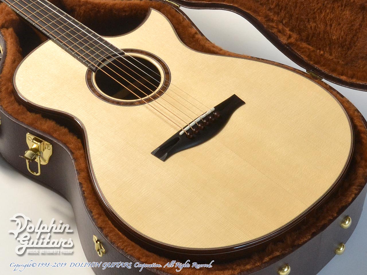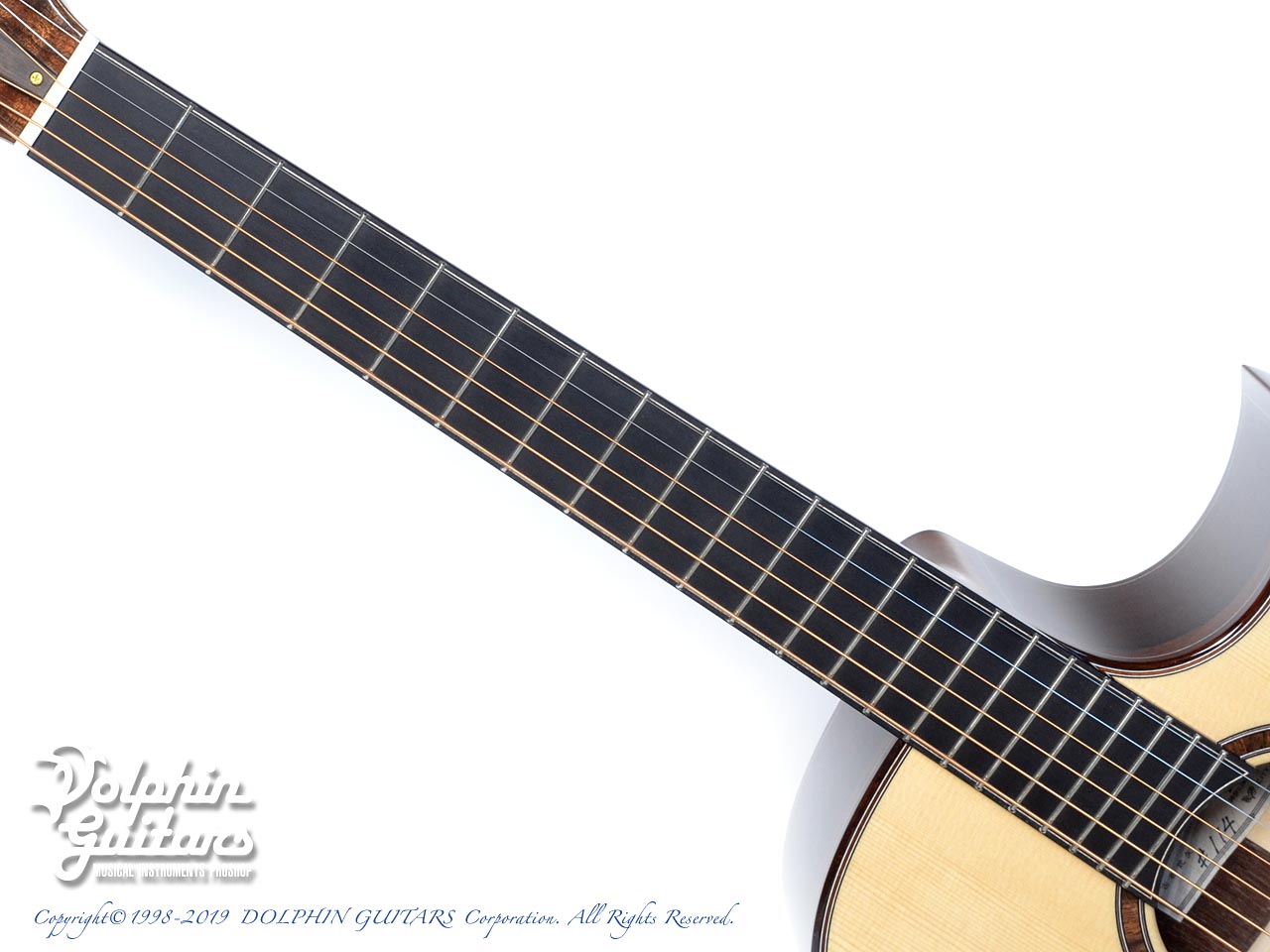 スイス・アルパイン・ムーンスプルース・トップ、マダガスカル・ローズウッド・サイド&バック、マホガニー・ネック、エボニー指板&駒、フローレンタイン・カッタウェイ、ニトロセルロース・ラッカー・フィニッシュ。