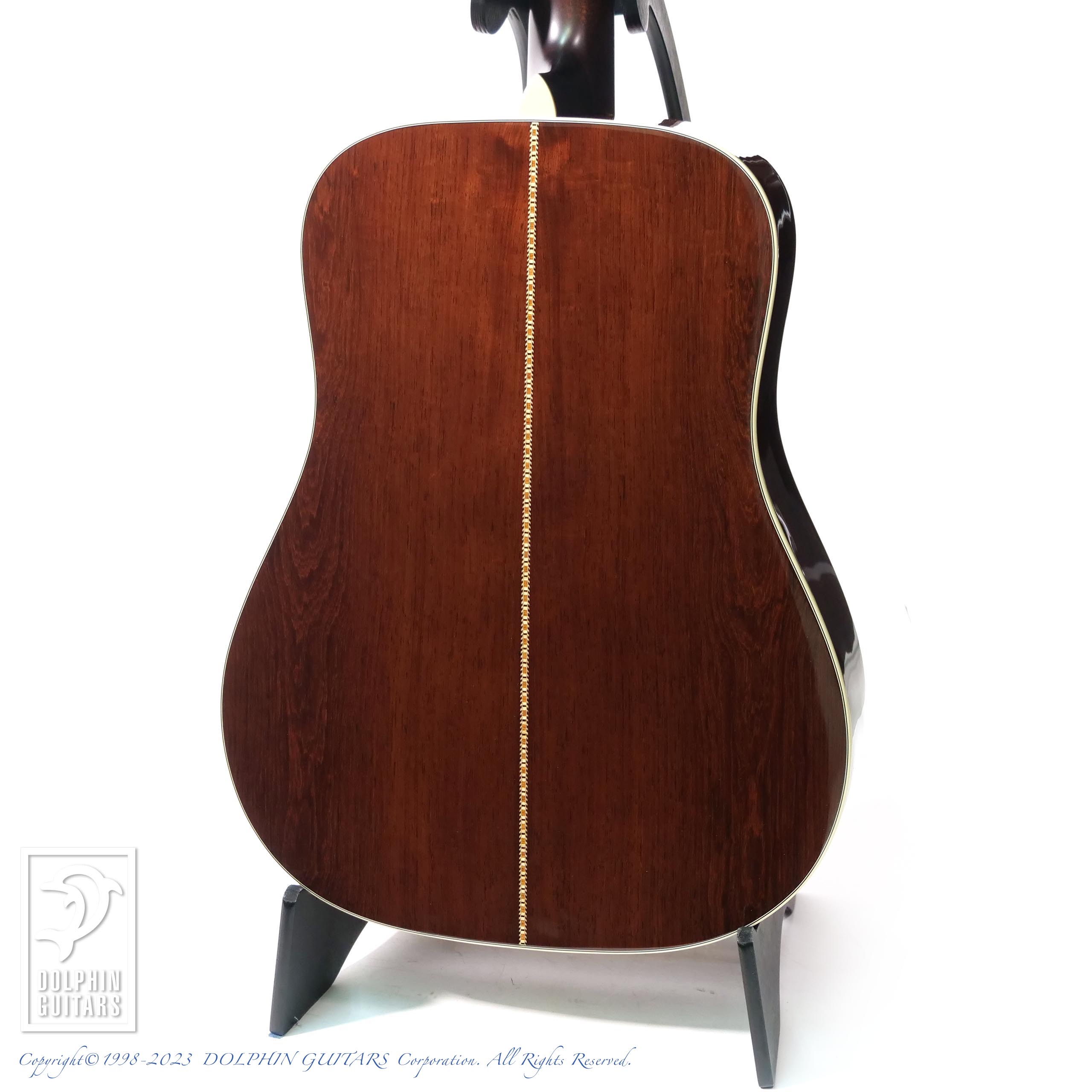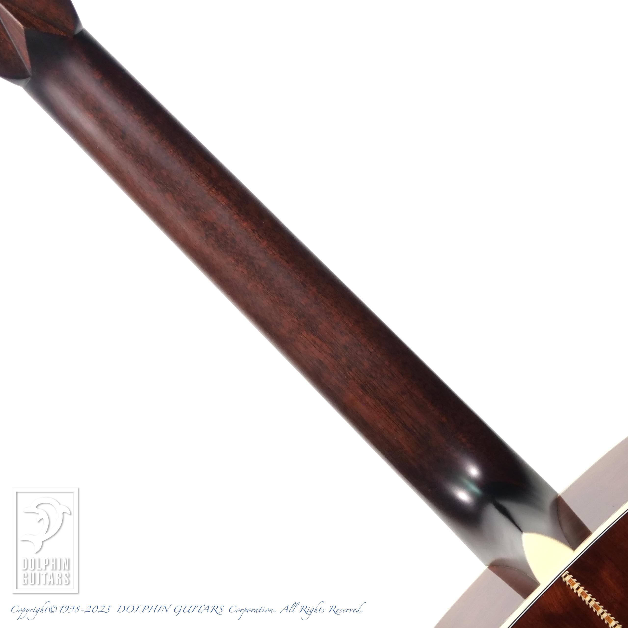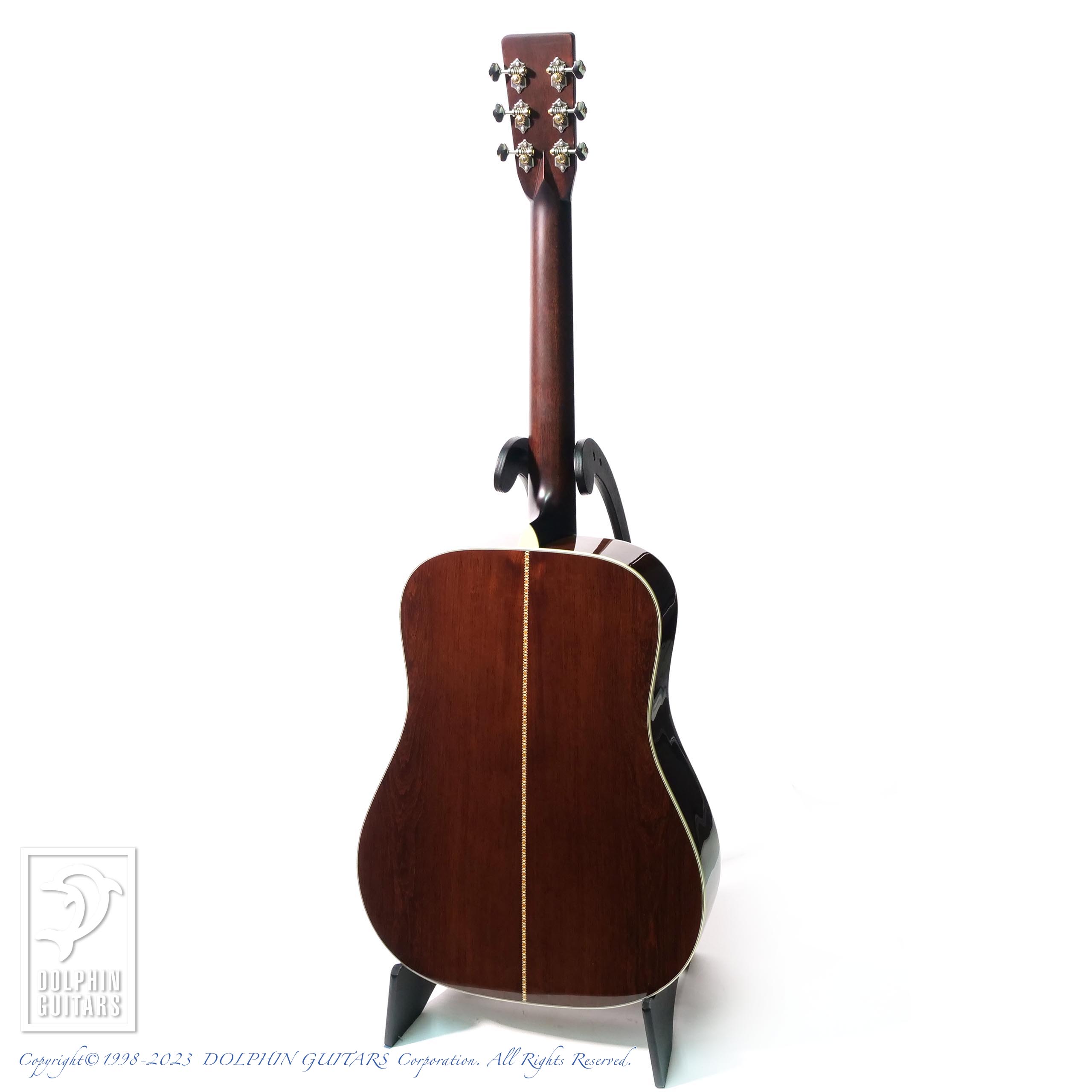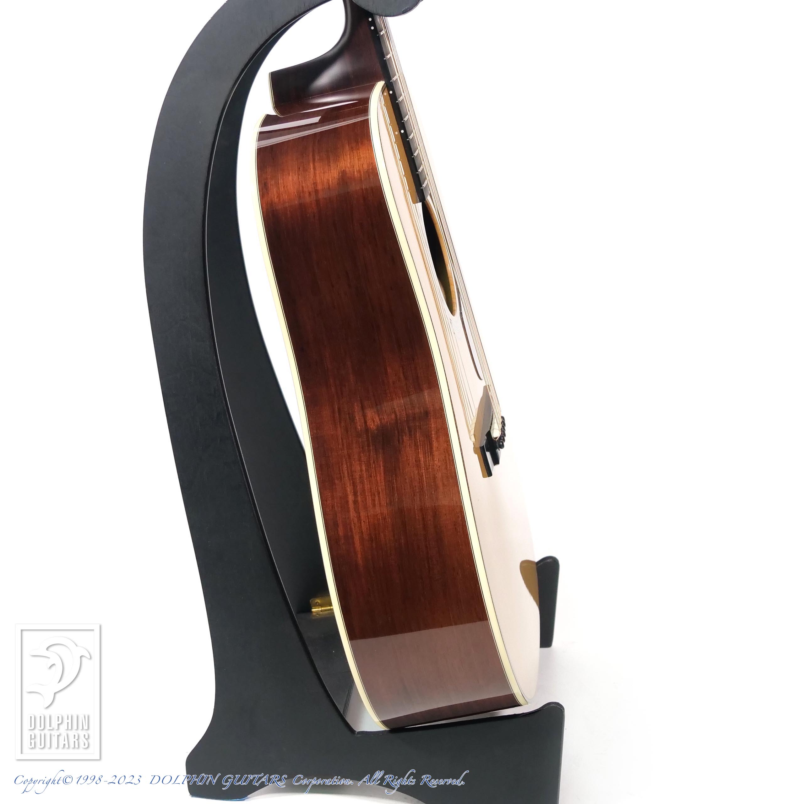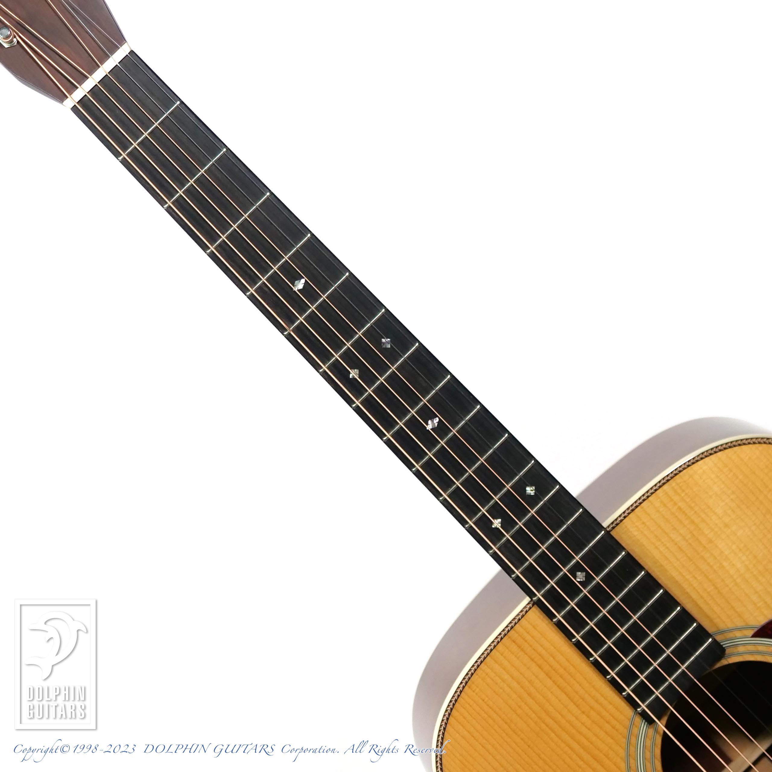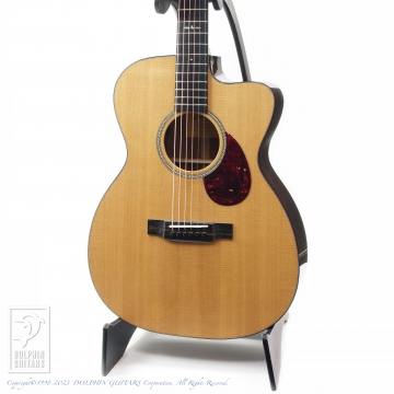 トップにはアディロンダックスプルースを人工的に経年処理を施した材を使用、サイドバックには現在流通量が希少になっている銘木マダガスカルローズウッドを組み合わせています。ヘリンボーントリム、ダイヤモンドポジション、オープンギアペグなどヴィンテージスタイルの基本をおさえたトラディショナルな佇まいです。