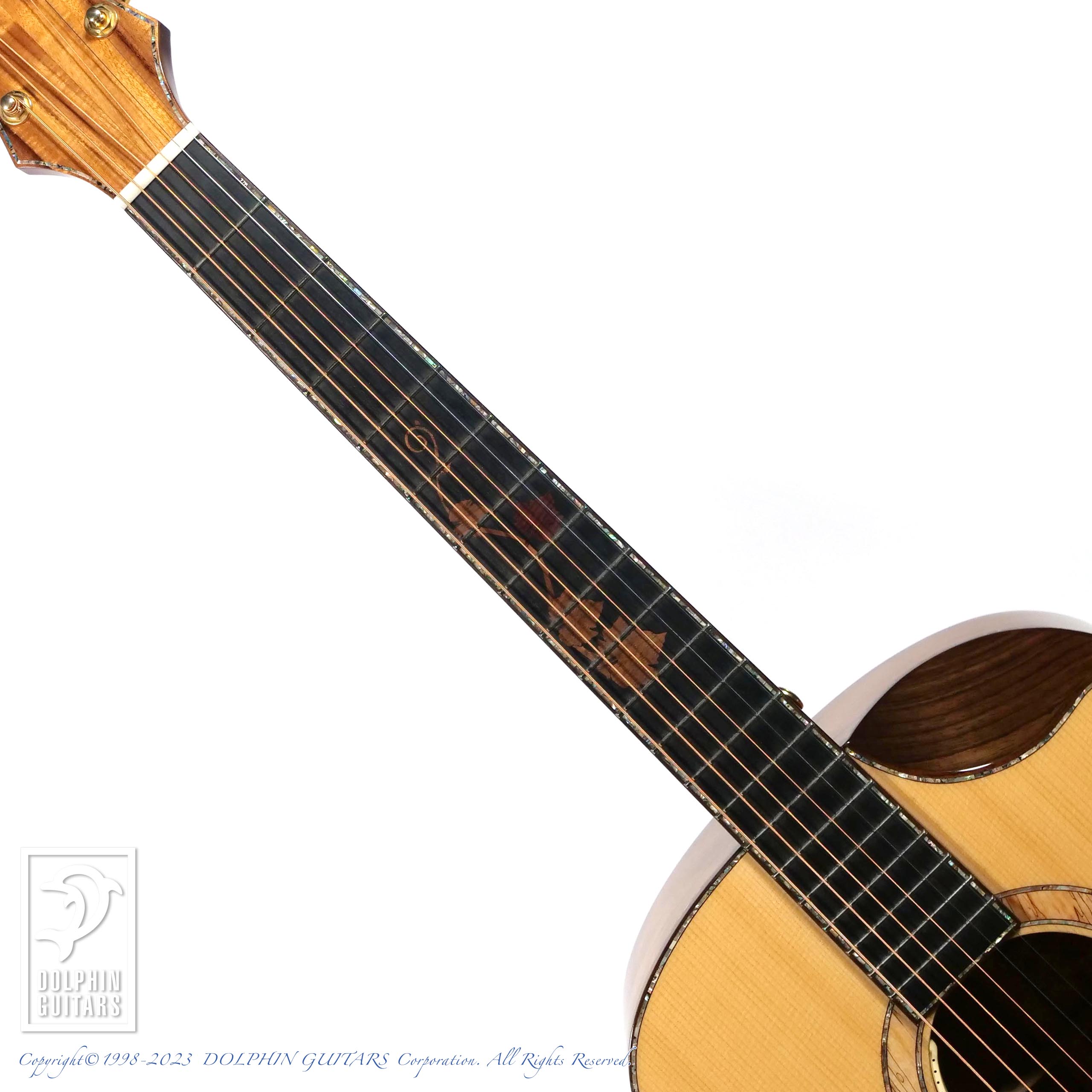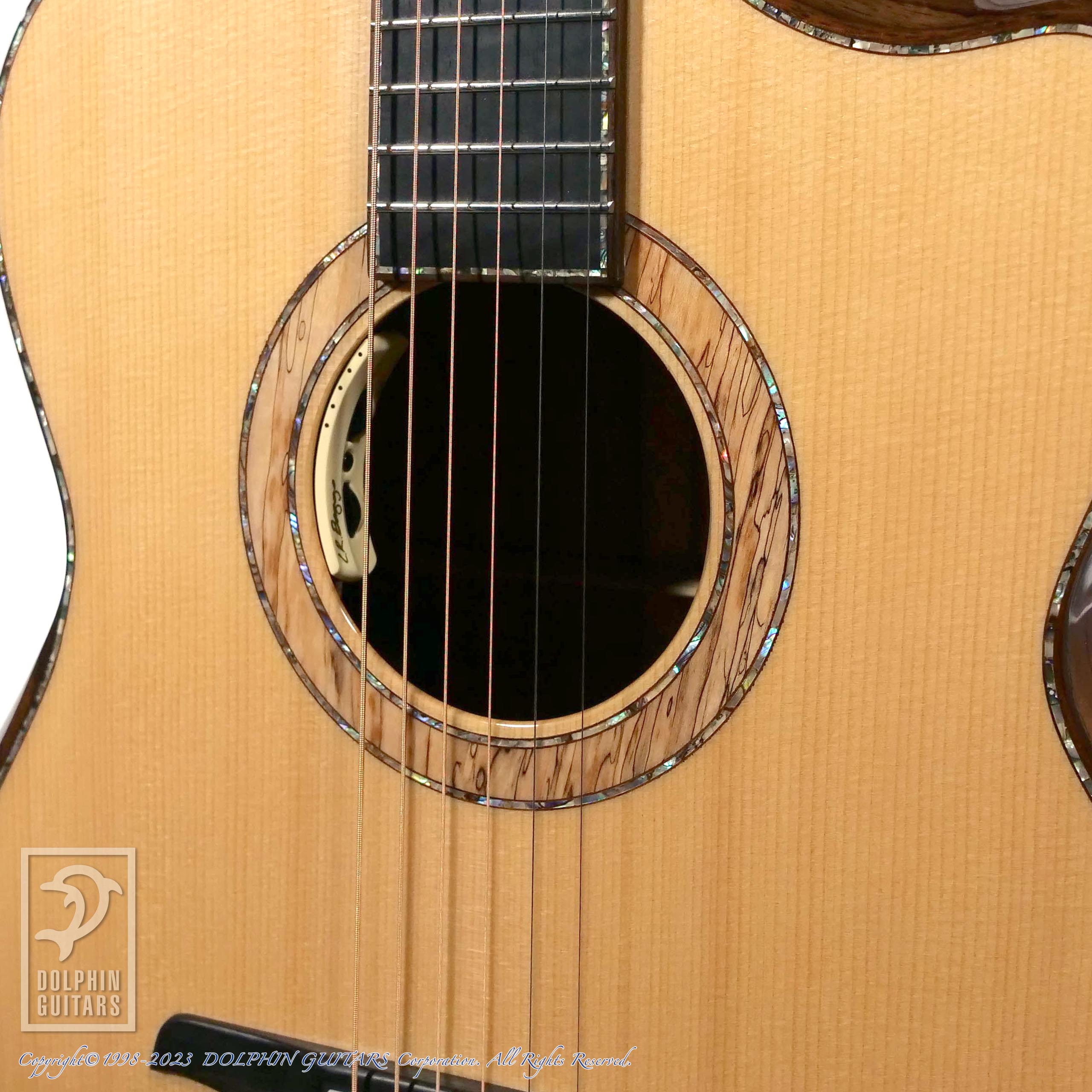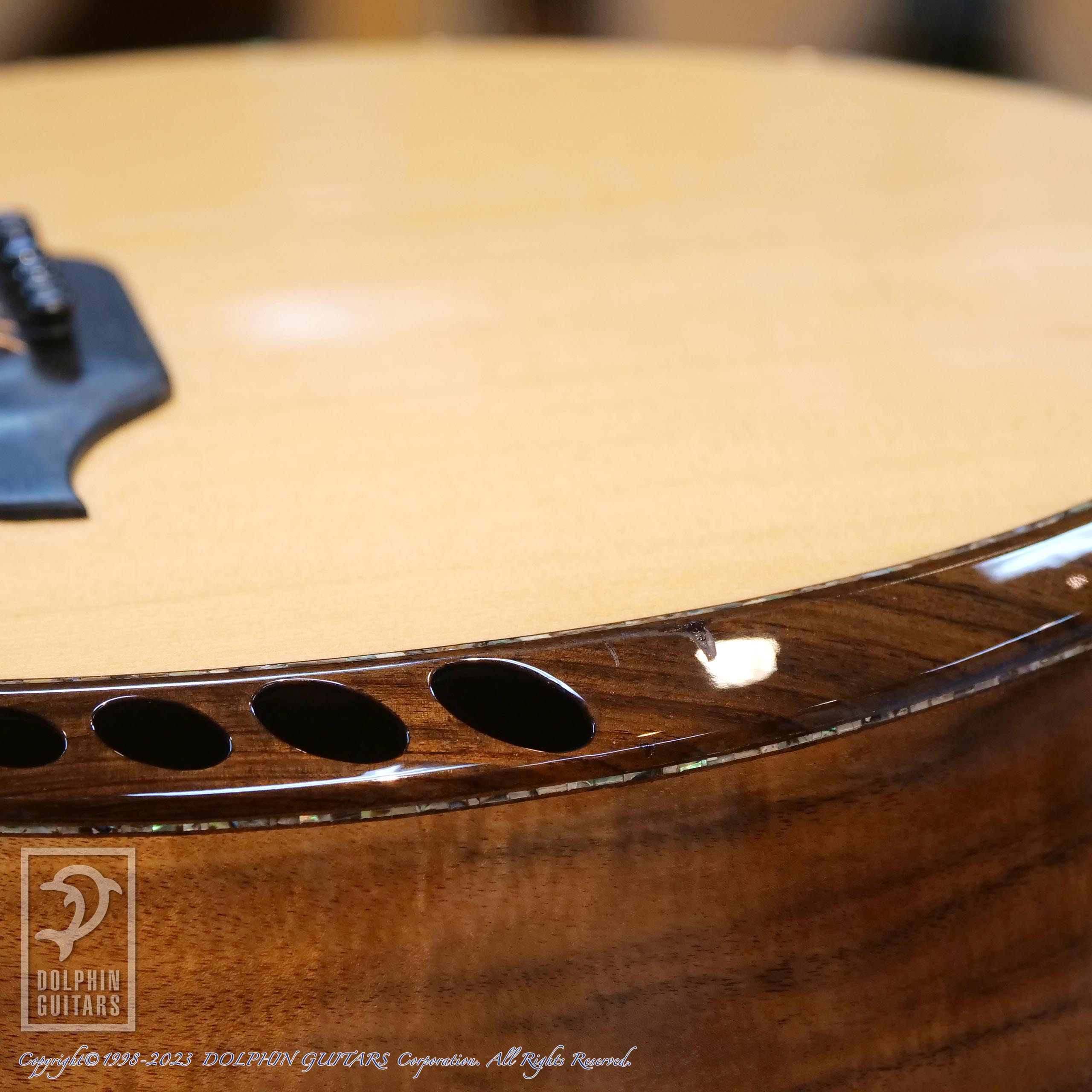 トップ側のみを窪ませ、柔らかなカーブで仕上げられたディンプル・カッタウェイや、6つのモニターサウンドホールのあるアームレスト、細く繊細なアバロンでボディ全面、指板、ヘッドまで縁取られたスペシャルなディテールが満載のカスタムモデルです。