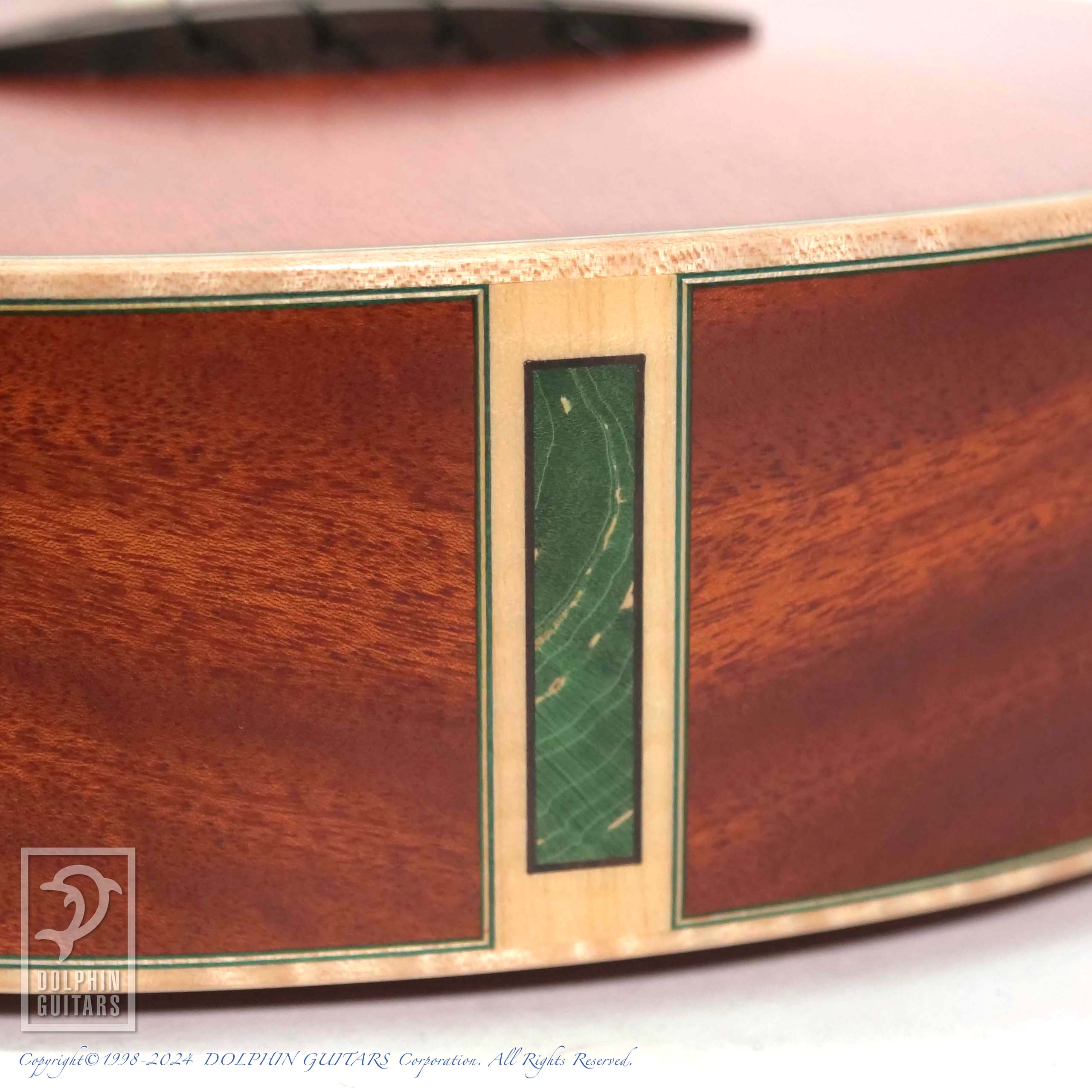 ボディエンドには、グリーンを基調としたボックス型のウッドインレイ、そしてボディには貴重なSouth American Mahoganyを採用、枯れたコクのあるトーンは弾いていてとても心地よいです。