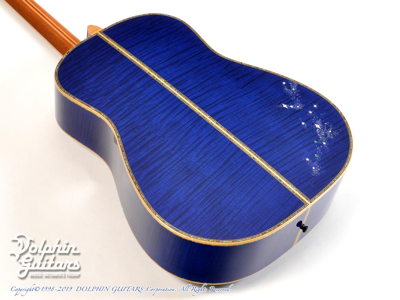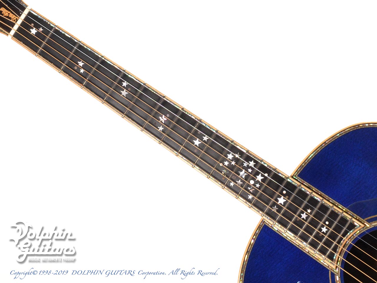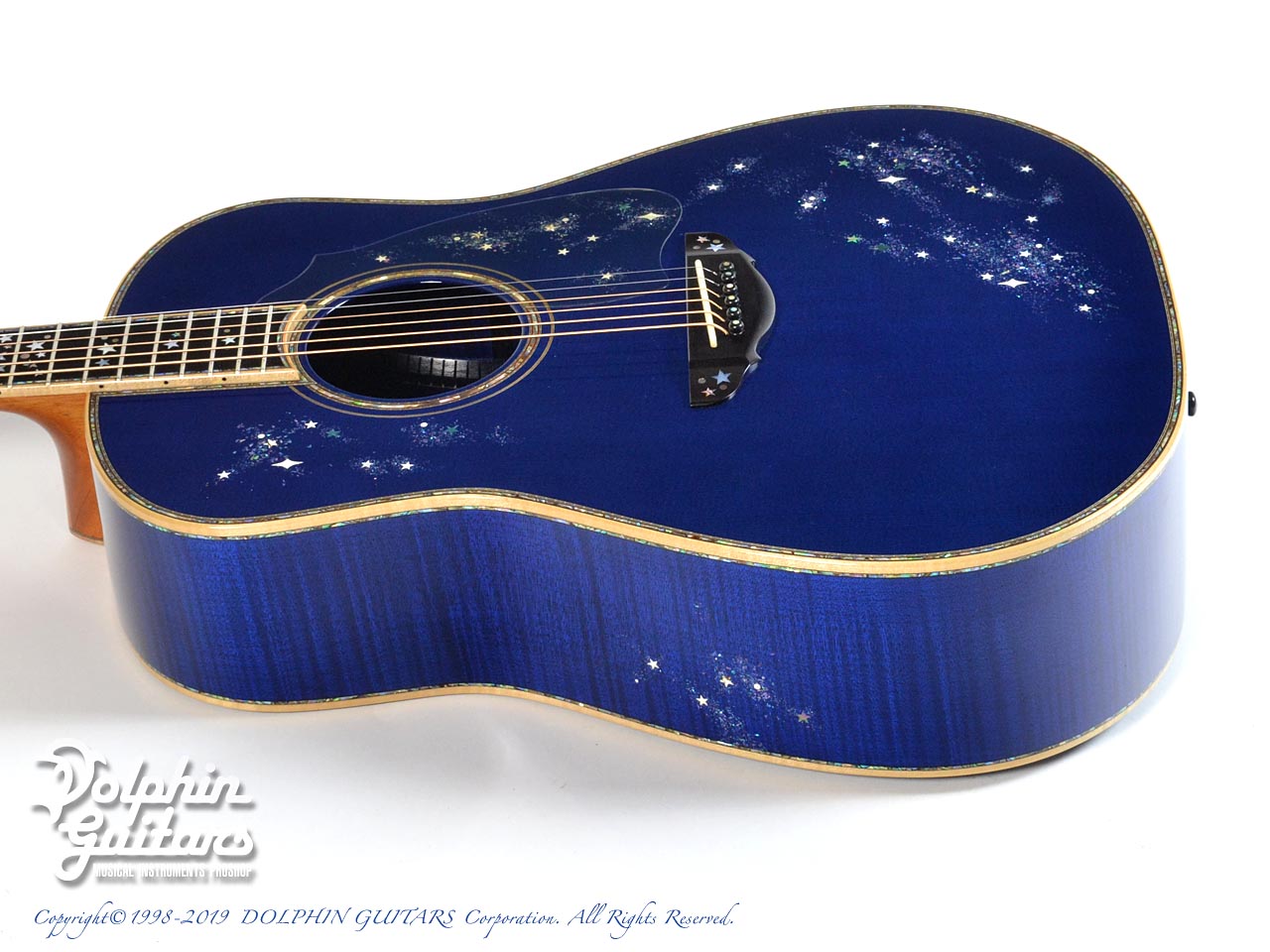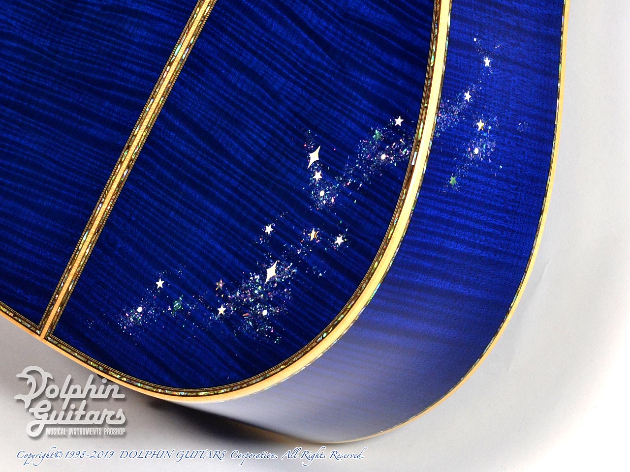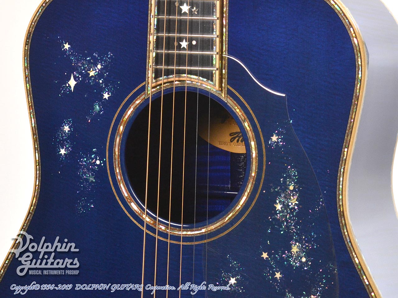 超豪華。まるでギター全体がキャンバスのごとく、煌めく星空が描かれております。ボディ内部まで鮮やかなブルーに塗装され一層特別感を演出しております。ヘッド、指板、ボディトップ、サイド、バックにまでアバロントリムで囲っており、輝いていない部分がないほど豪華です。