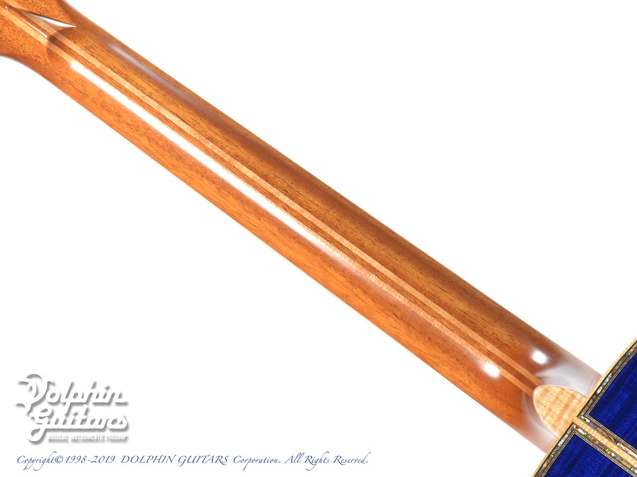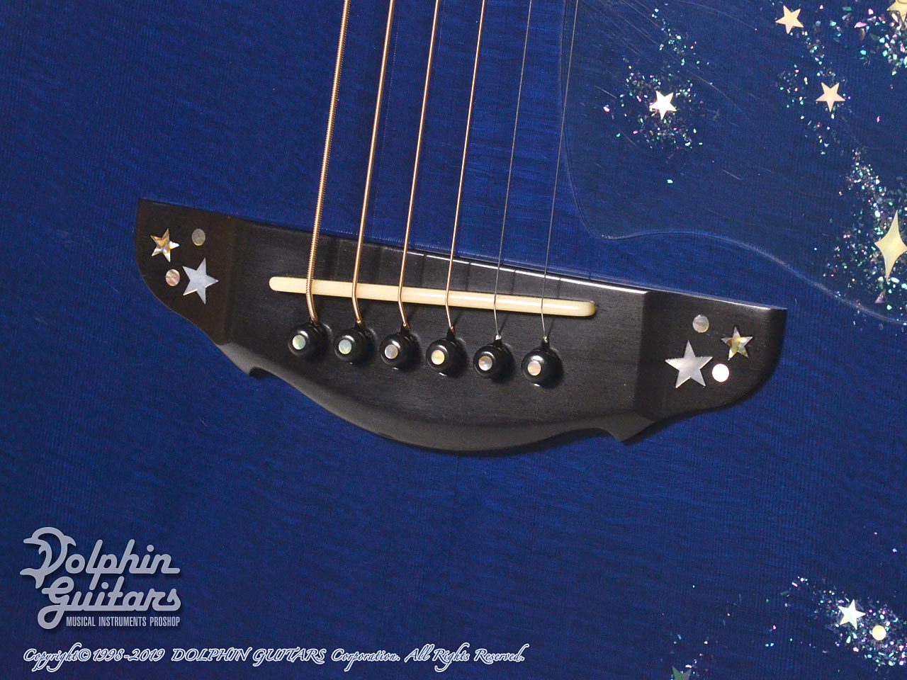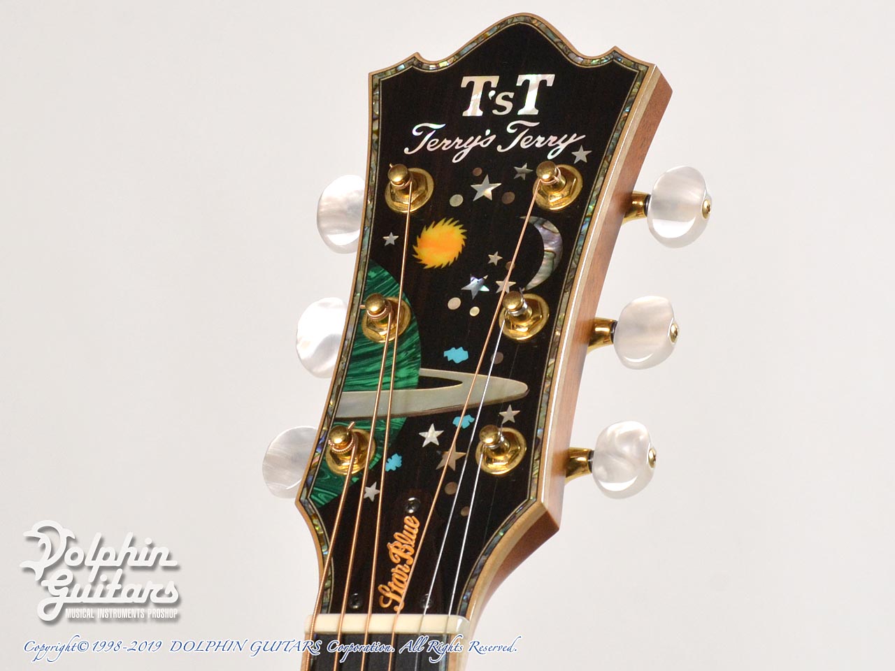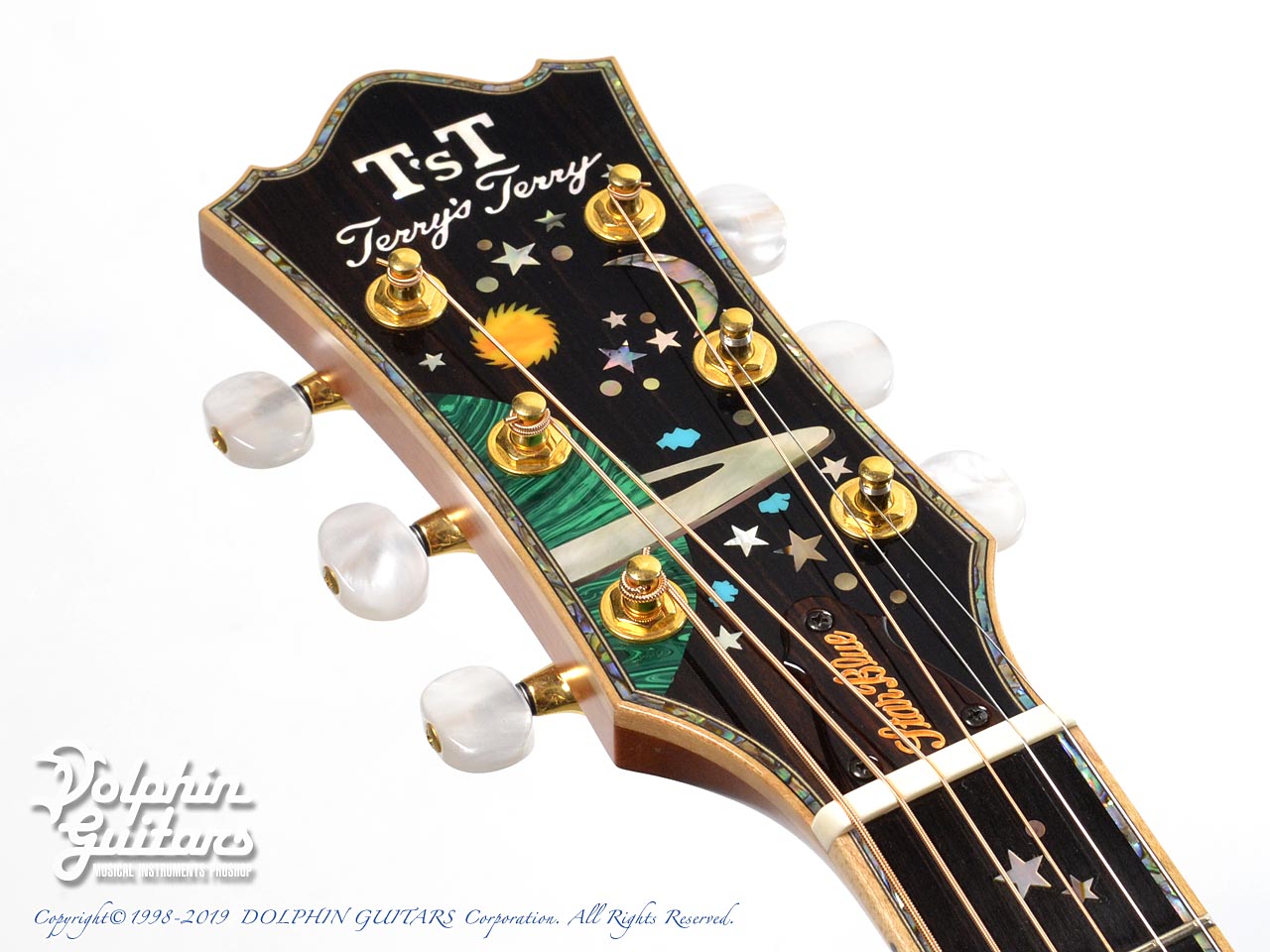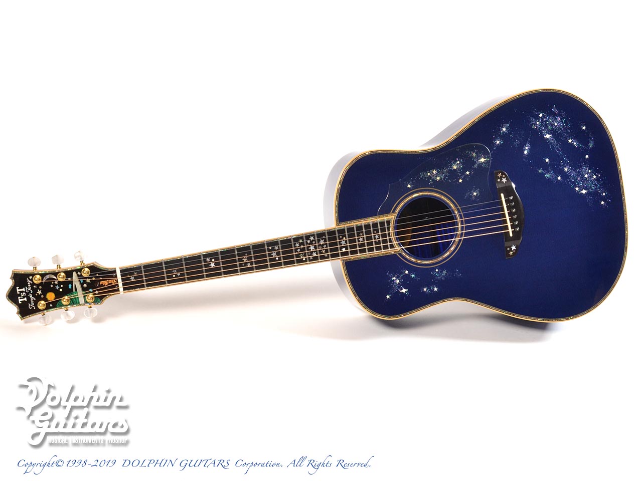 超豪華。まるでギター全体がキャンバスのごとく、煌めく星空が描かれております。ボディ内部まで鮮やかなブルーに塗装され一層特別感を演出しております。ヘッド、指板、ボディトップ、サイド、バックにまでアバロントリムで囲っており、輝いていない部分がないほど豪華です。