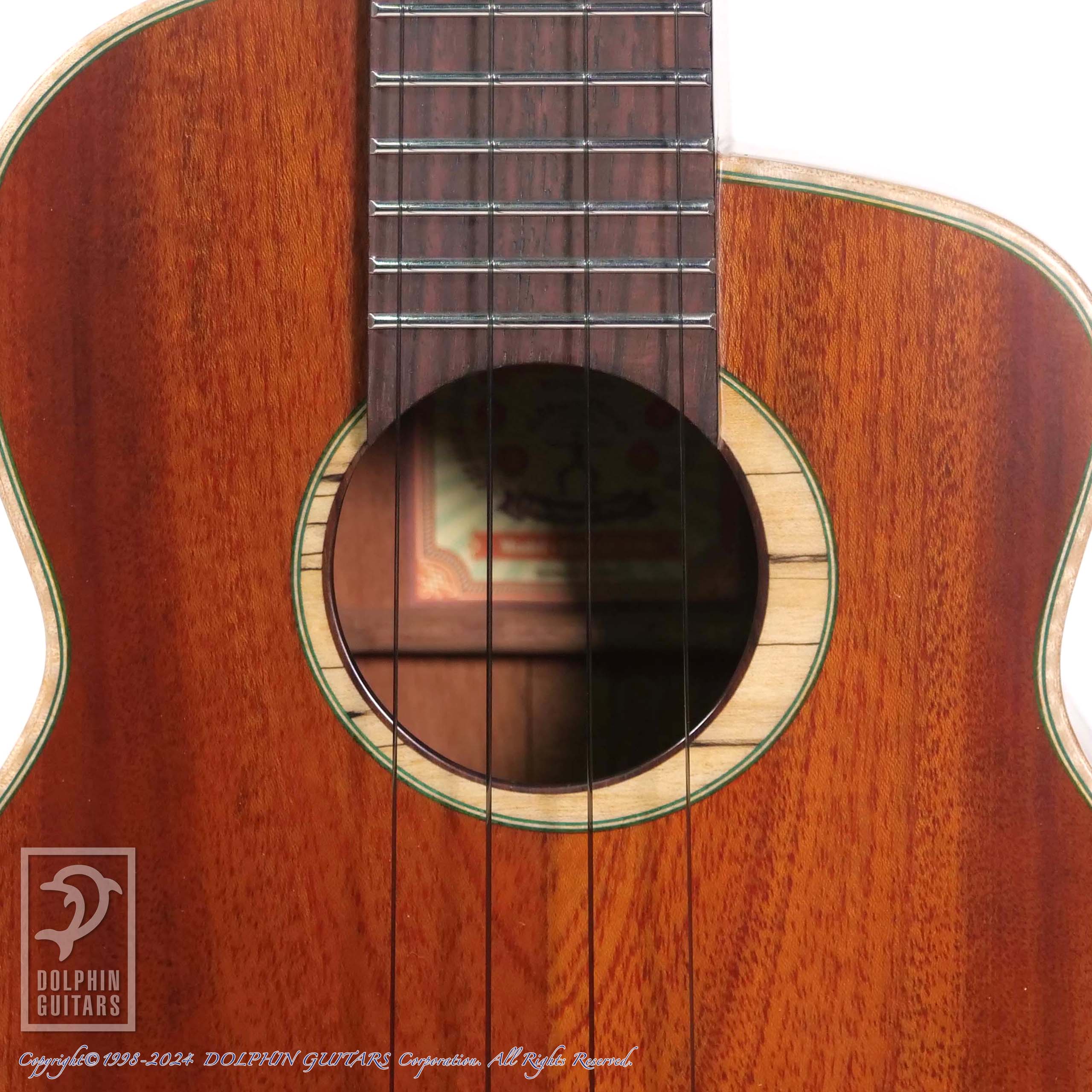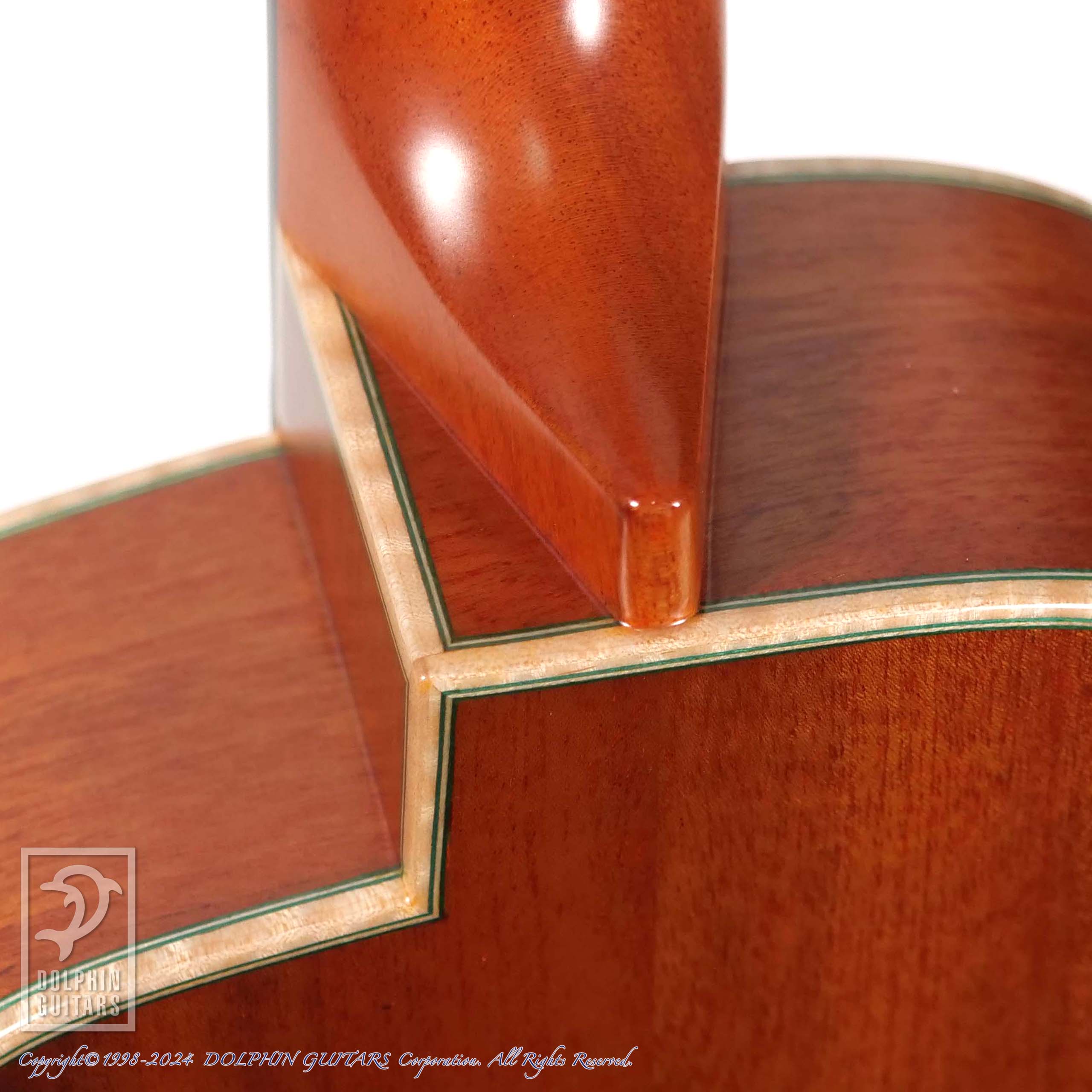 ボディエンドには、グリーンを基調としたボックス型のウッドインレイ、そしてボディには貴重なSouth American Mahoganyを採用、枯れたコクのあるトーンは弾いていてとても心地よいです。