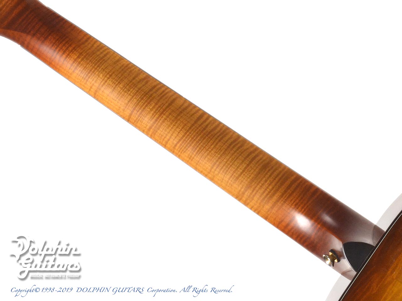 どこから見ても美しいギターです。特にバックビューはネックも含めたエキゾチックなメイプル杢を存分に堪能できます。トップのみならず、サイド&バック、ネックまで全面バーストフィニッシュで、杢をより立体的に引き立てます。