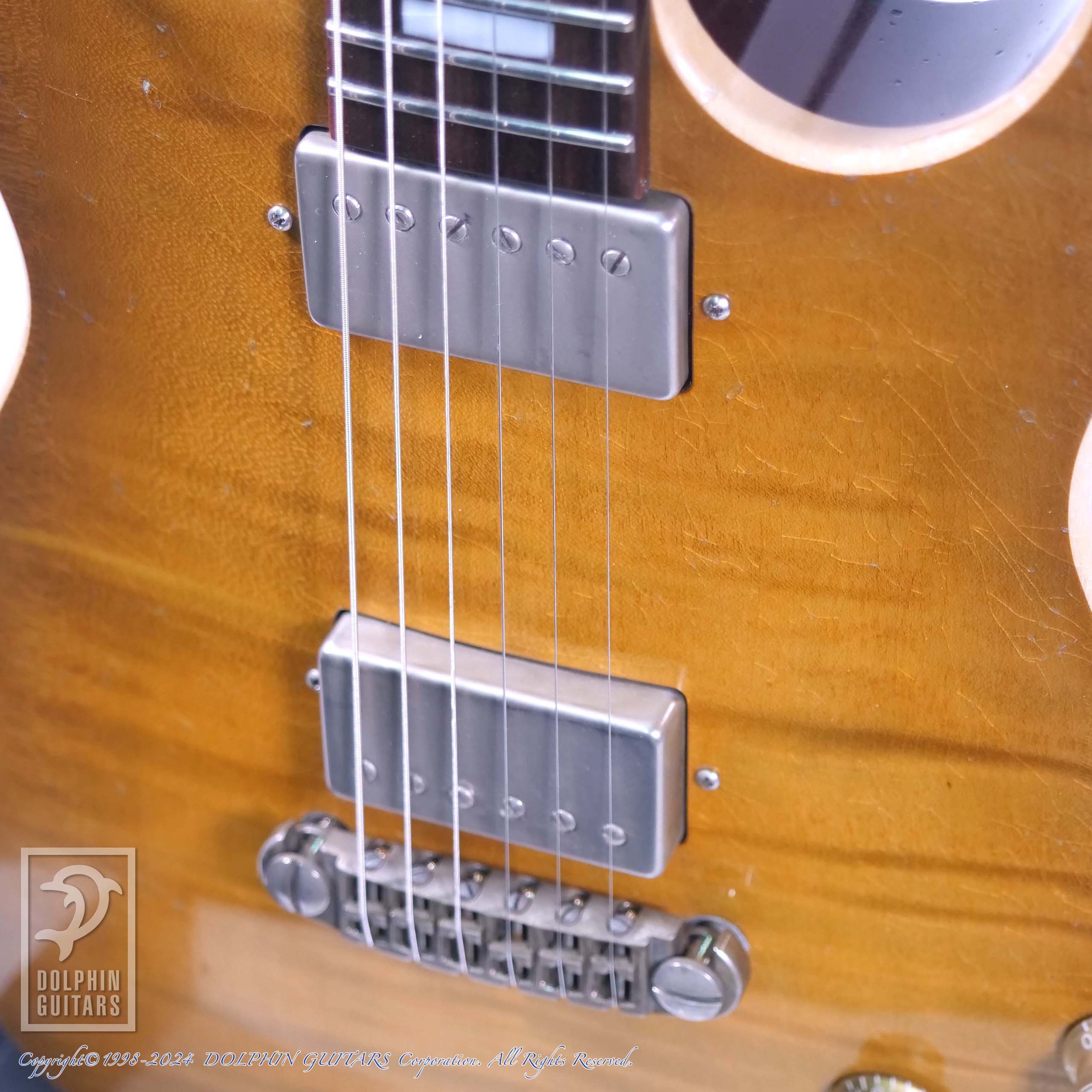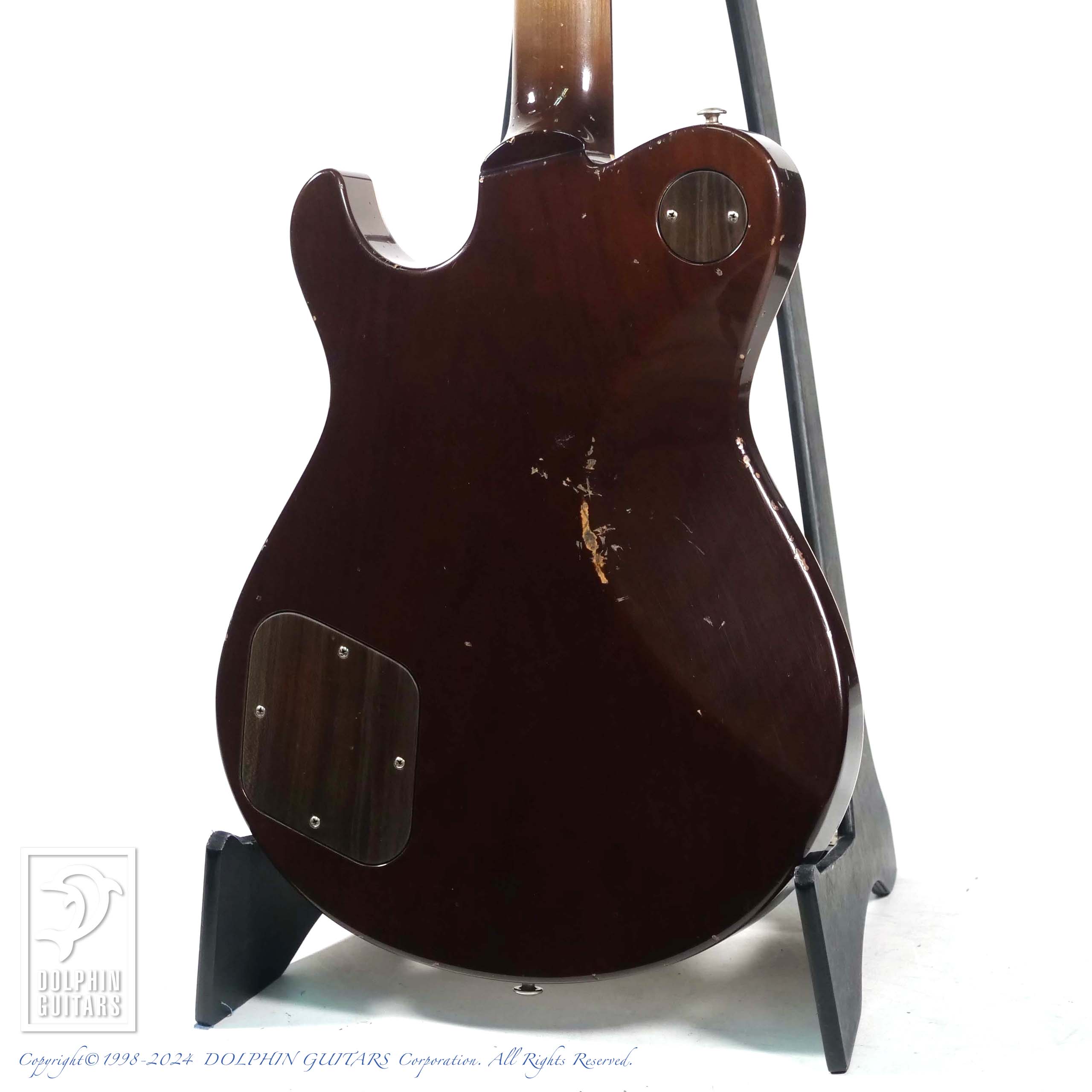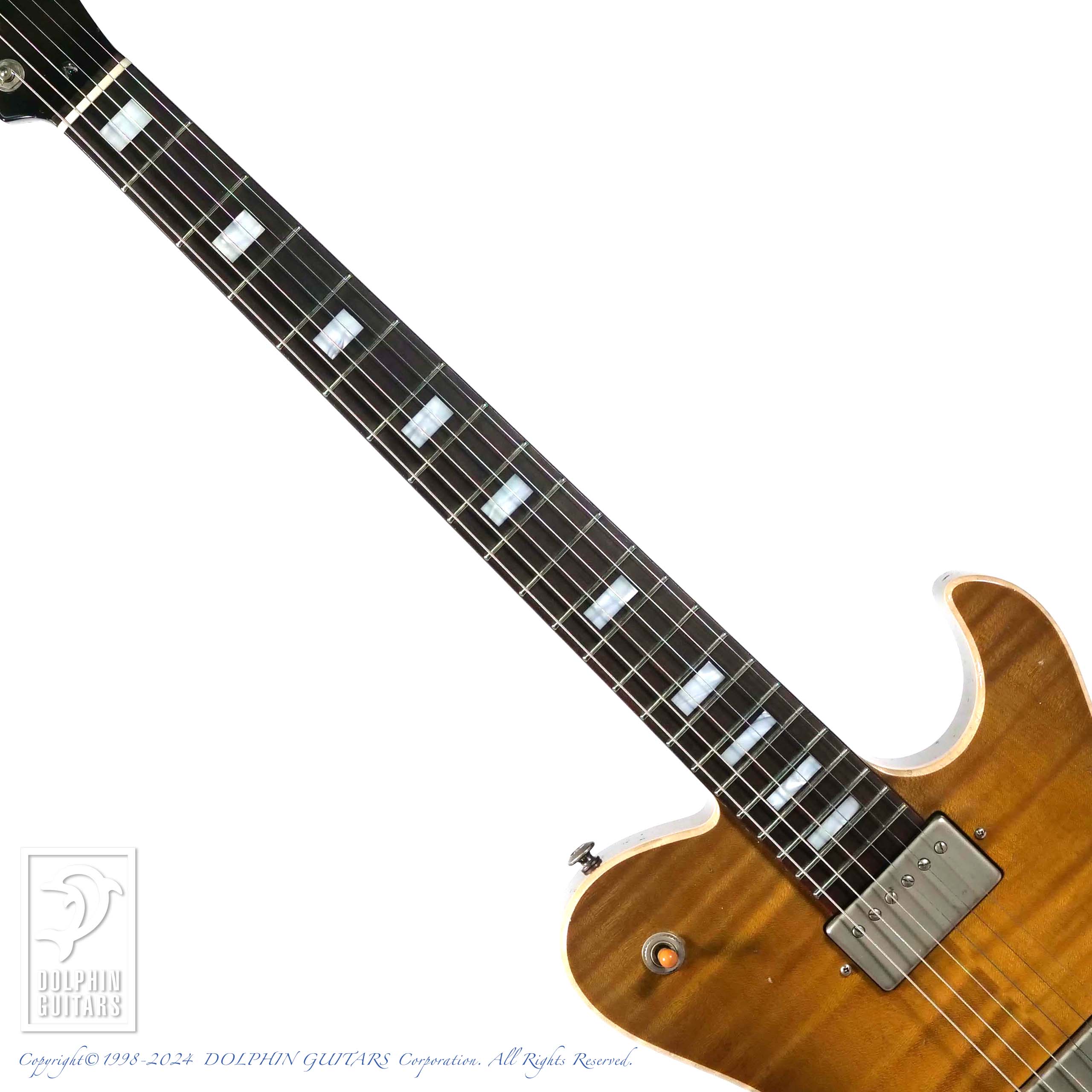 カーヴドトップボディにセットネックでジョイントされた片連テレキャスターヘッド、2つのハムバッキングPUはトップをエスカッションがわりに利用した非常にスマートなマウント。こちらはホイズル流のPAFレプリカPUで、滑らかで甘く太い高音を持ち、ジューシーなリードトーンをお約束いたします。ボディに使われているチェリーウッドはマホガニーに近い音響特性を持っておりますが、より硬質であるといった特徴がサウンドにも影響し、既存のモデルを踏襲しつつもオリジナリティも感じさせます。