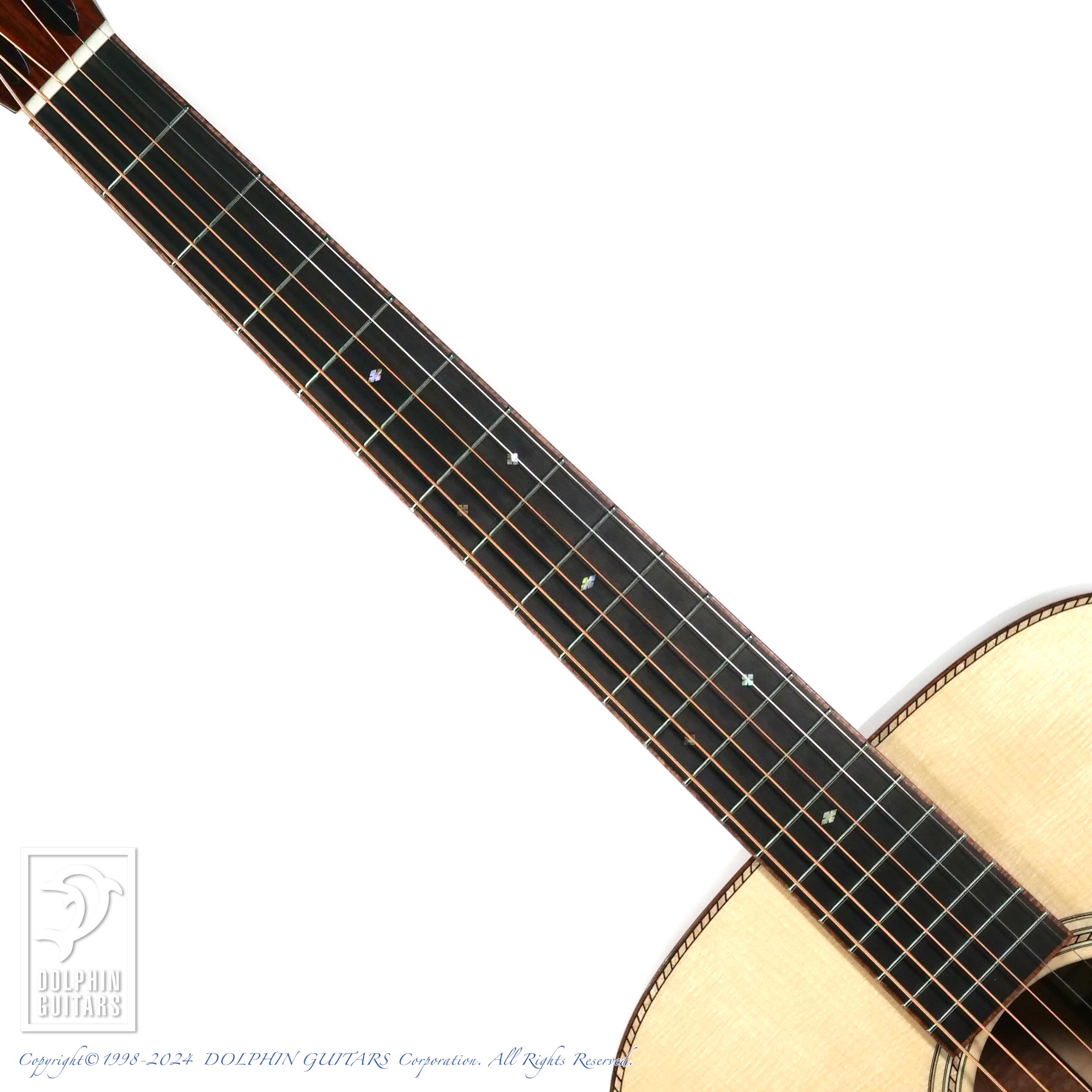 実際のサイズや厚みは、OMサイズとほぼ同じサイズとなりますが、下部の膨らみがOMサイズと0000サイズの間のサイズになっており、サウンドのボリューム感もありながら抱え心地も確保されている絶妙なサイズ感となっております。