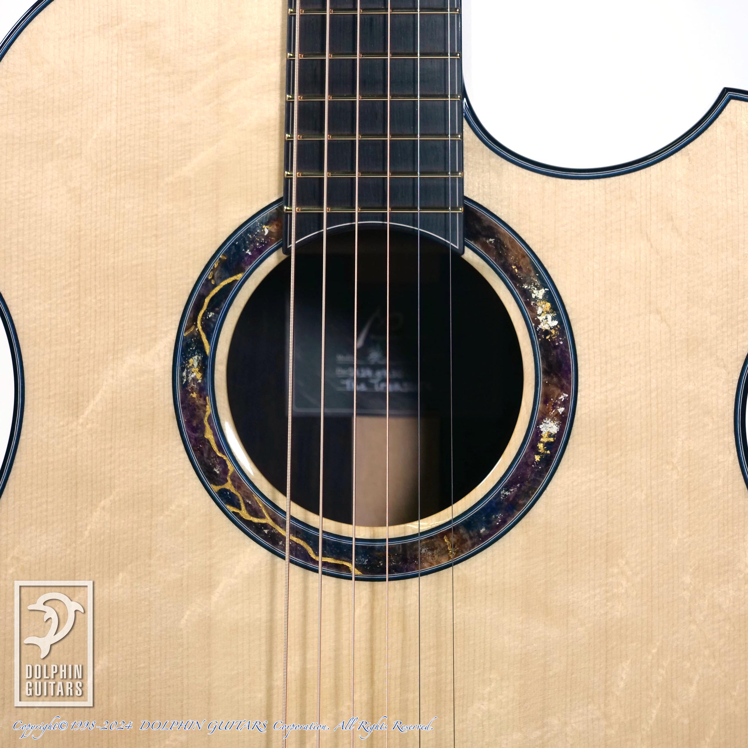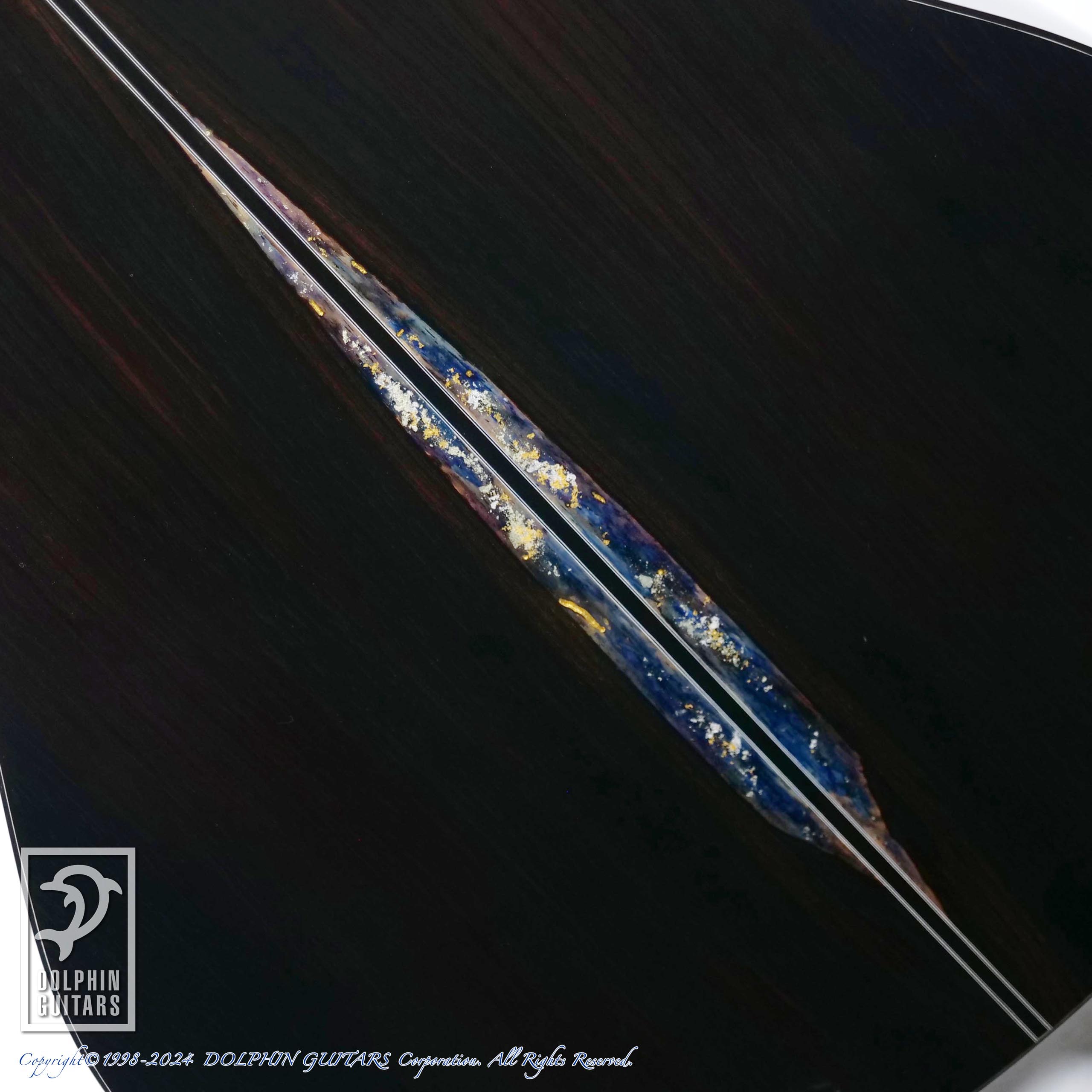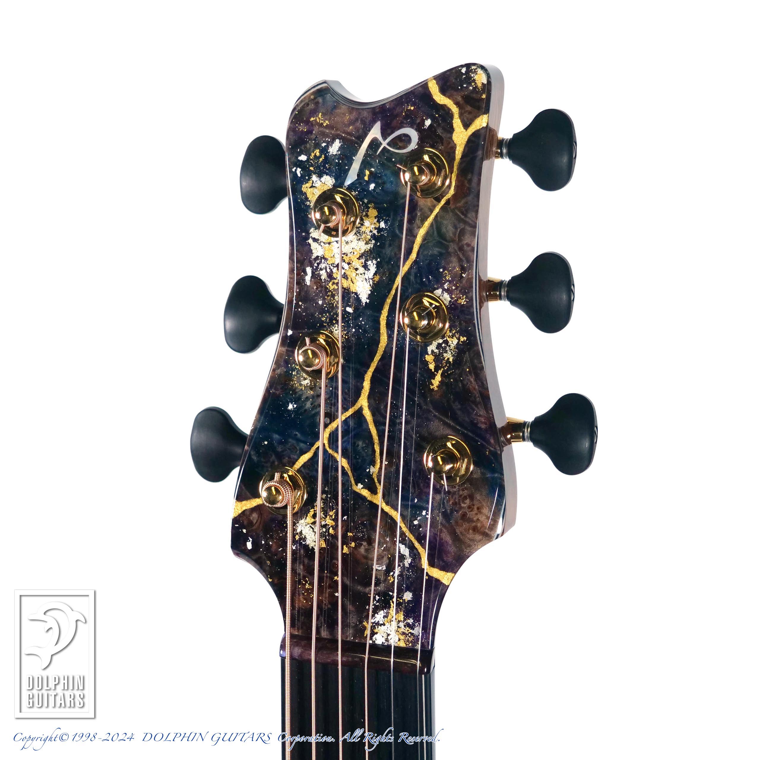 伝統工芸「金継ぎ」の技術を応用した装飾や、独特のセンスで染色したバール材に、金箔・銀箔・シャンパンゴールド箔を散りばめ、唯一無二の世界観を生み出しております。ギター界の定番であるインレイワークとは違った新たな芸術作品です。