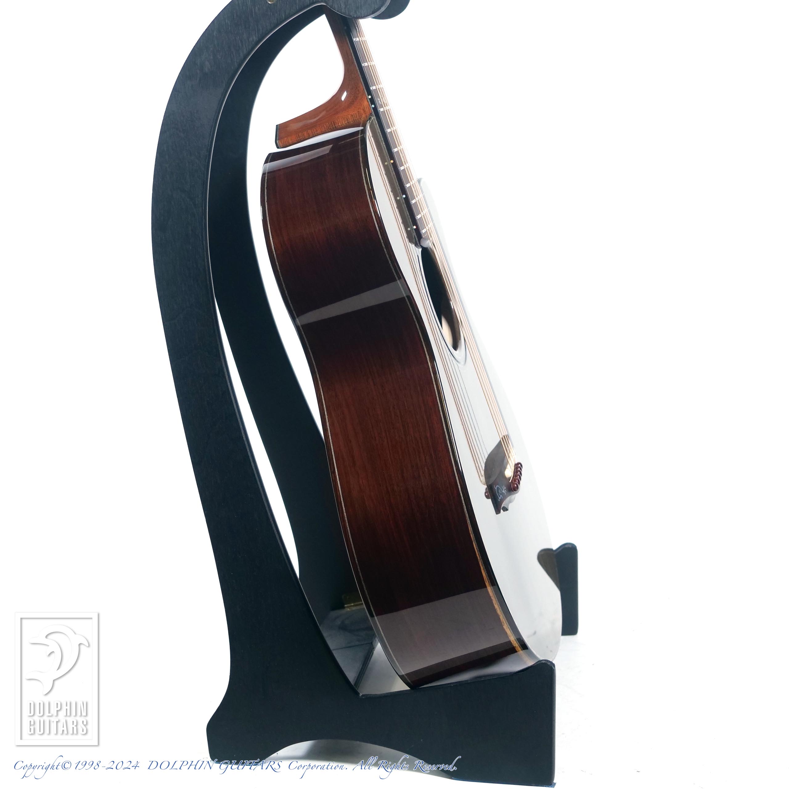 見た目の凄さにしばし心を奪われますが、いざ弾くとその実力にさらに驚かされます。神代杉は経年により水分や油分が抜け、見た目に反してライトな質感になり、サラッと爪弾くと軽やかに反応してくれます。それを支える硬質なボディの紫檀材により、輪郭ははっきりと感じ取れ、甘く透明度の高いサウンドです。12Fジョイントならではのディープな響きも持ち合わせており、ボディのサイズ感を超える音圧、存在感です。