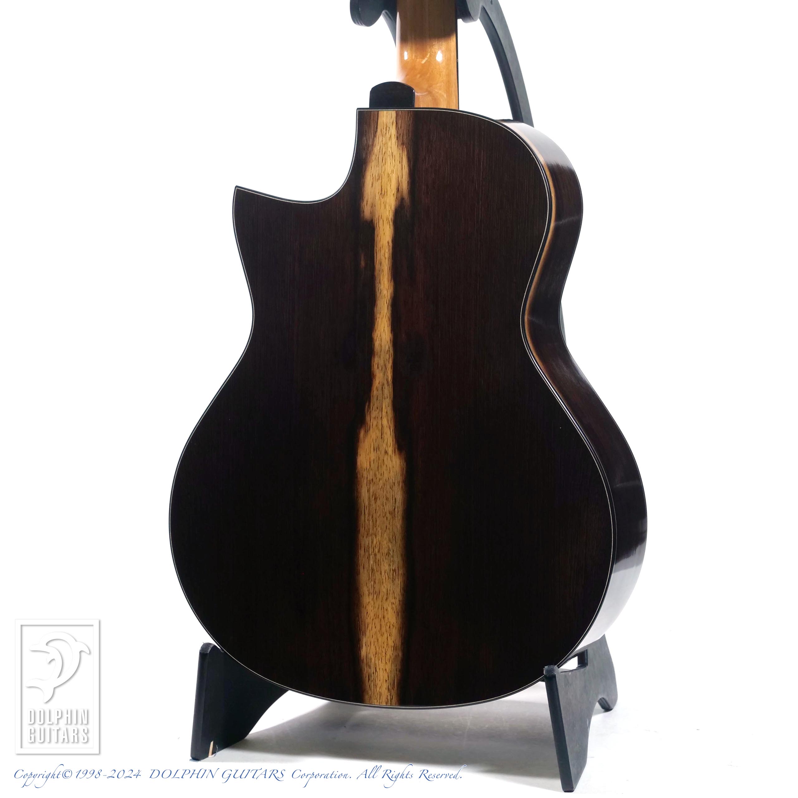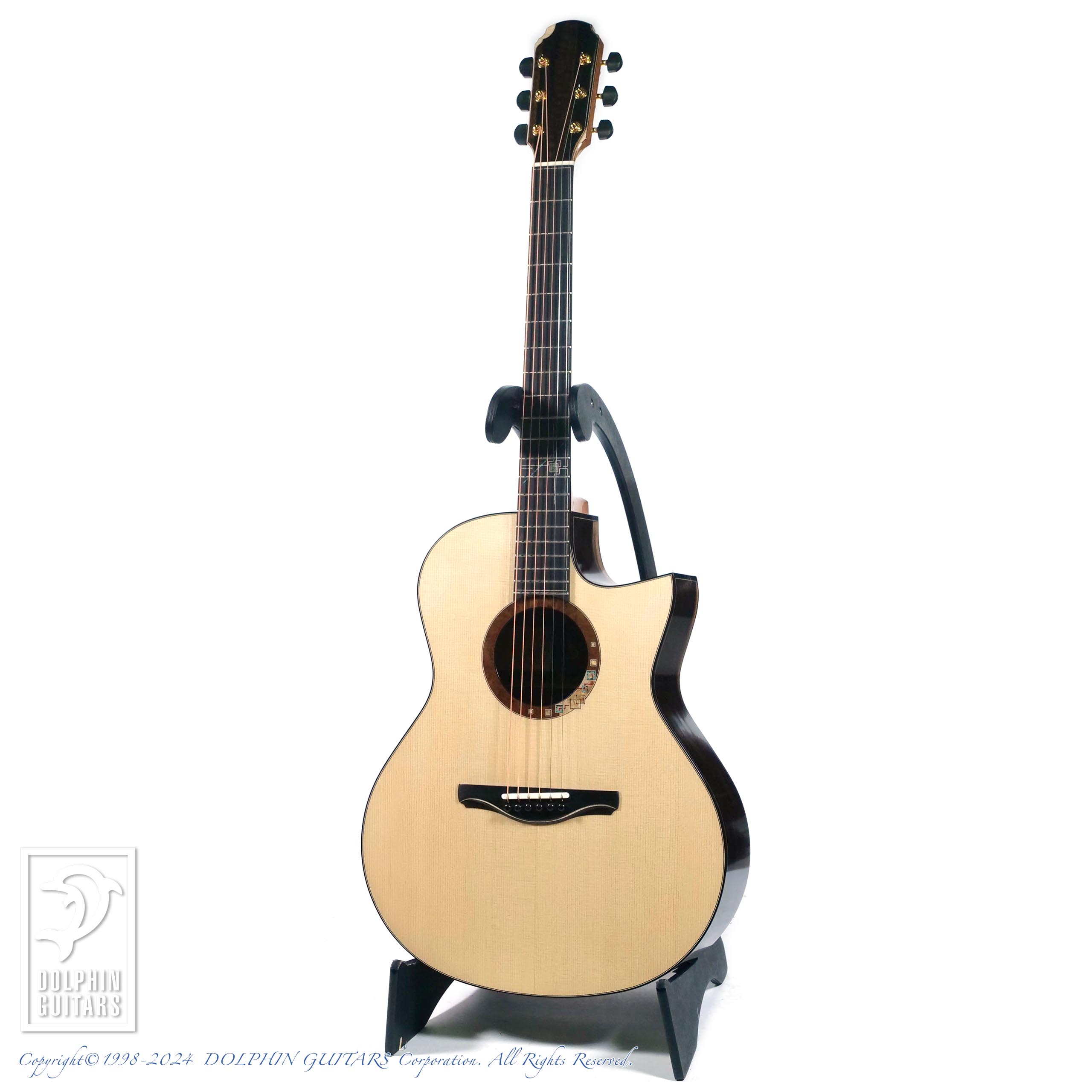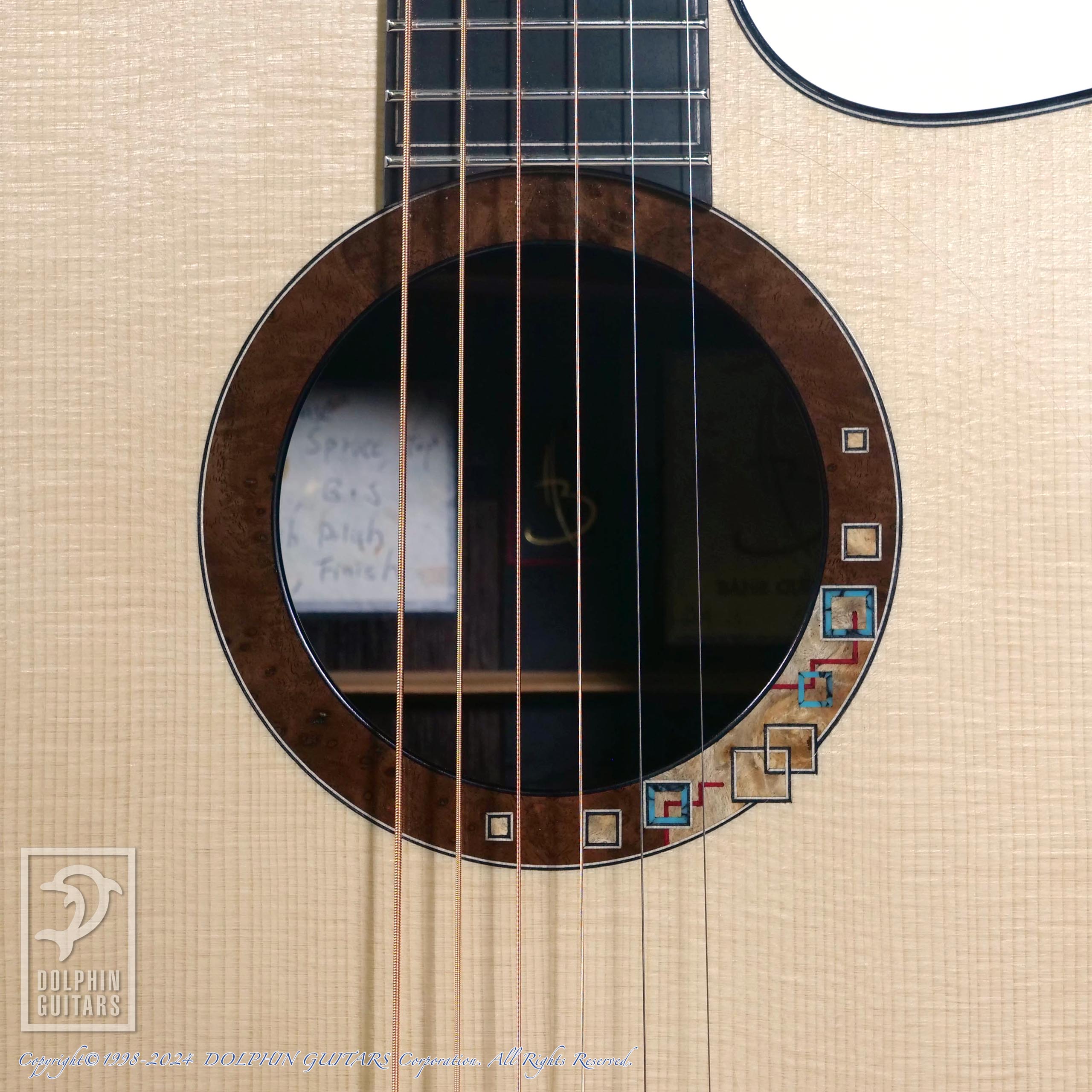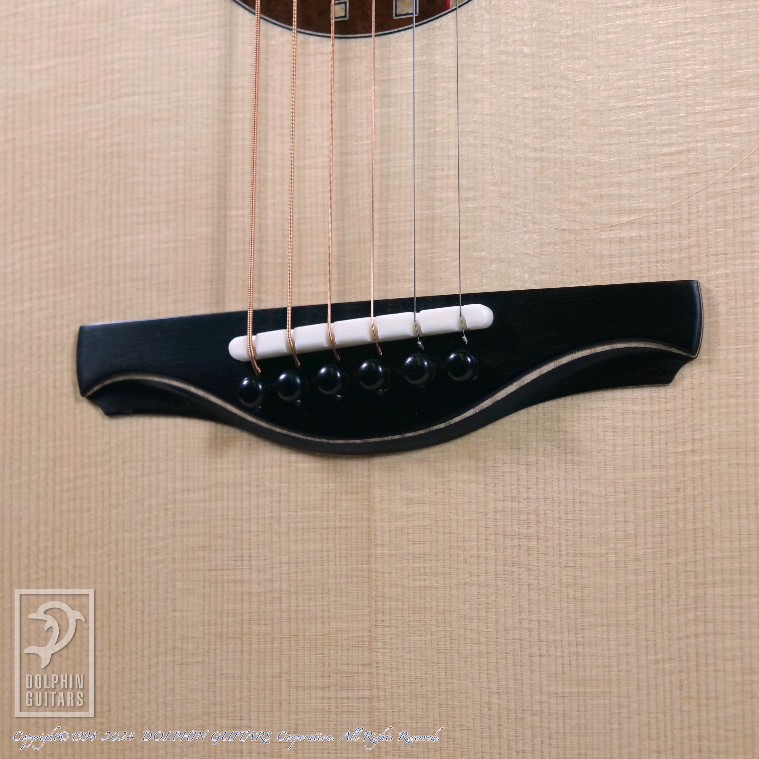 何よりも驚きなのがそのサウンド。サイドはダブルレイヤーで、ラティスブレイスのトップを大きく揺らしていることが分かるラウドな鳴りですが、それは完全にコントロールされており、輪郭がしっかりと認識できるタイト低音は素晴らしいの一言。バックもラティスブレイス仕様で、まるで太鼓のようなドンっと力強いレスポンスが生まれております。質量や伝達を考慮し、トップ&バックブレイスは共にトリファイド・シトカスプルースが用いられております。また、音の芯も逞しく、高音域も痩せる事なく太さがあり、優しいタッチでも十分な迫力を得られます。低域だけが目立つことなく、バランスの良い響きは綿密に計算された結果でしょう。