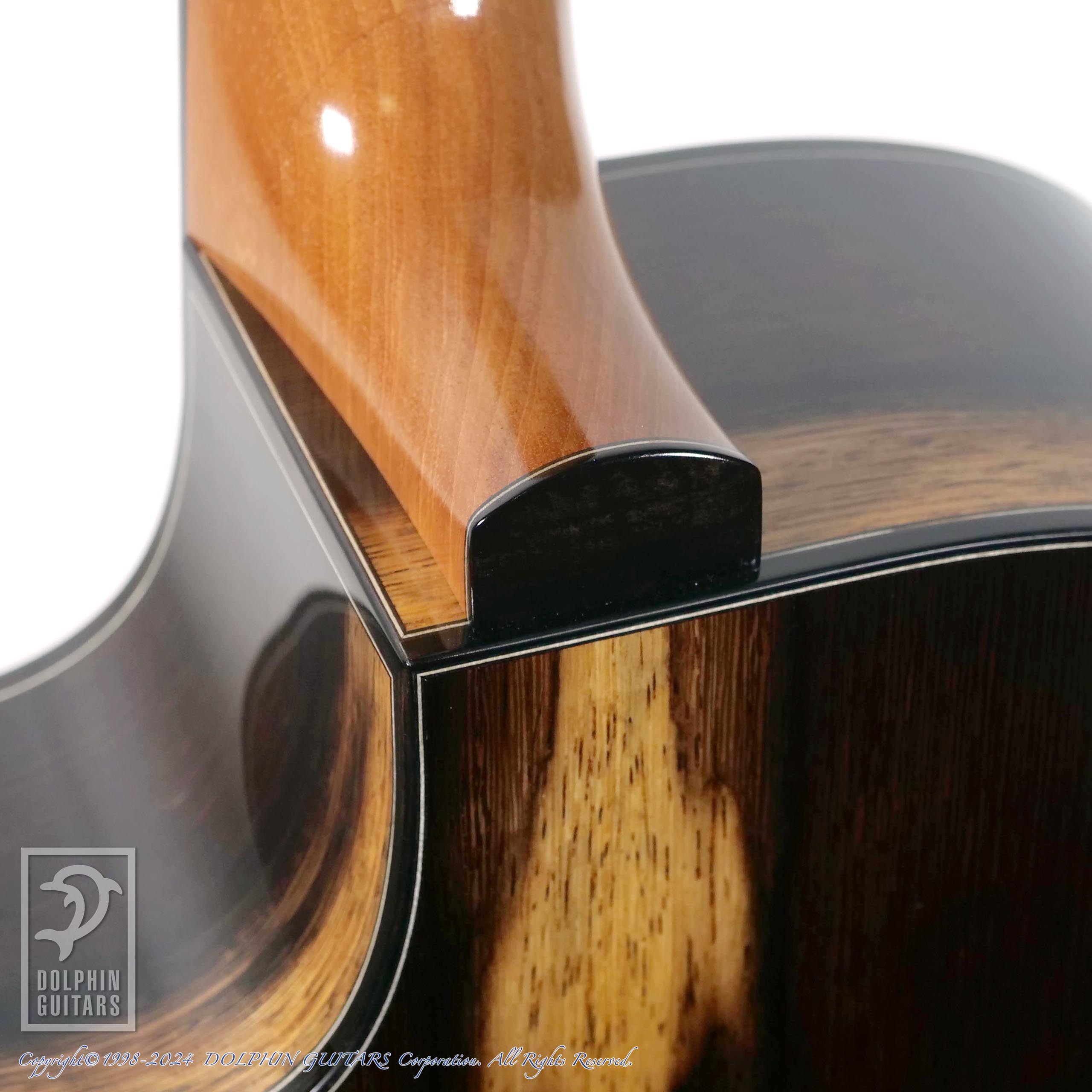 現在の年間製作本数は僅か数本のレアなギターですが、それも納得の大変丁寧な作り込み。細部まで仕上げが大変美しく、木工技術の高さは一目見て分かり、手にする前から良い予感がするギターです。塗装は全面シェラックのフレンチポリッシュ仕上げ。超極薄ながら均一に仕上げられたその仕上がりも美しく木工精度と共にハイレベルな完成度を持っております。