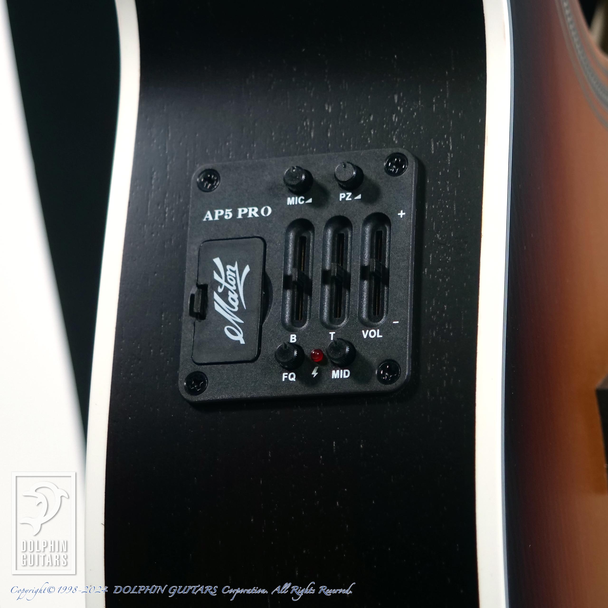 メイトンの魅力の一つでもあるピックアップシステム。メイトン社オリジナルのAP5-Proは特殊構造のアンダーサドルPUとコンデンサーMicをMixし、リアルなアコースティックサウンドをアウトプットします。