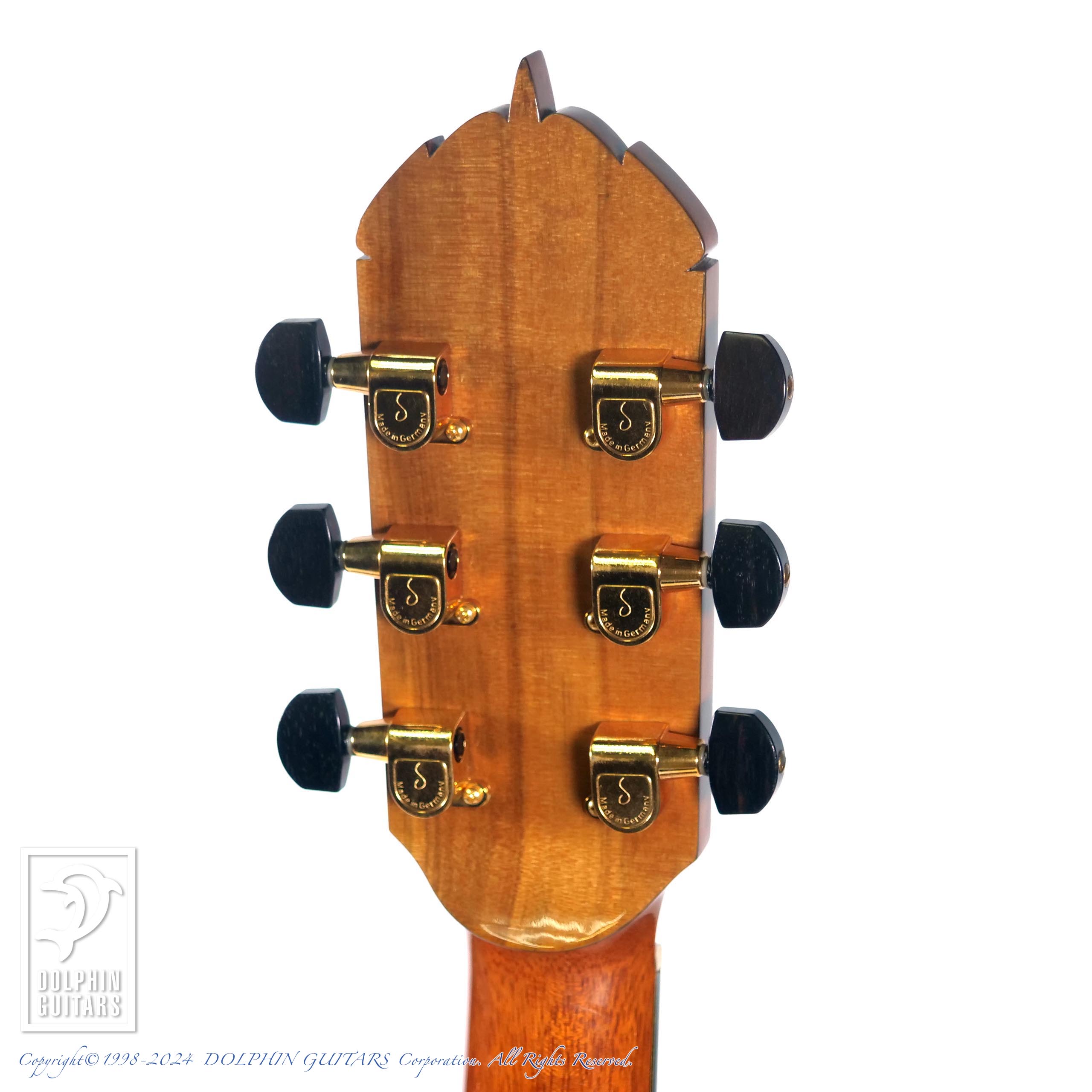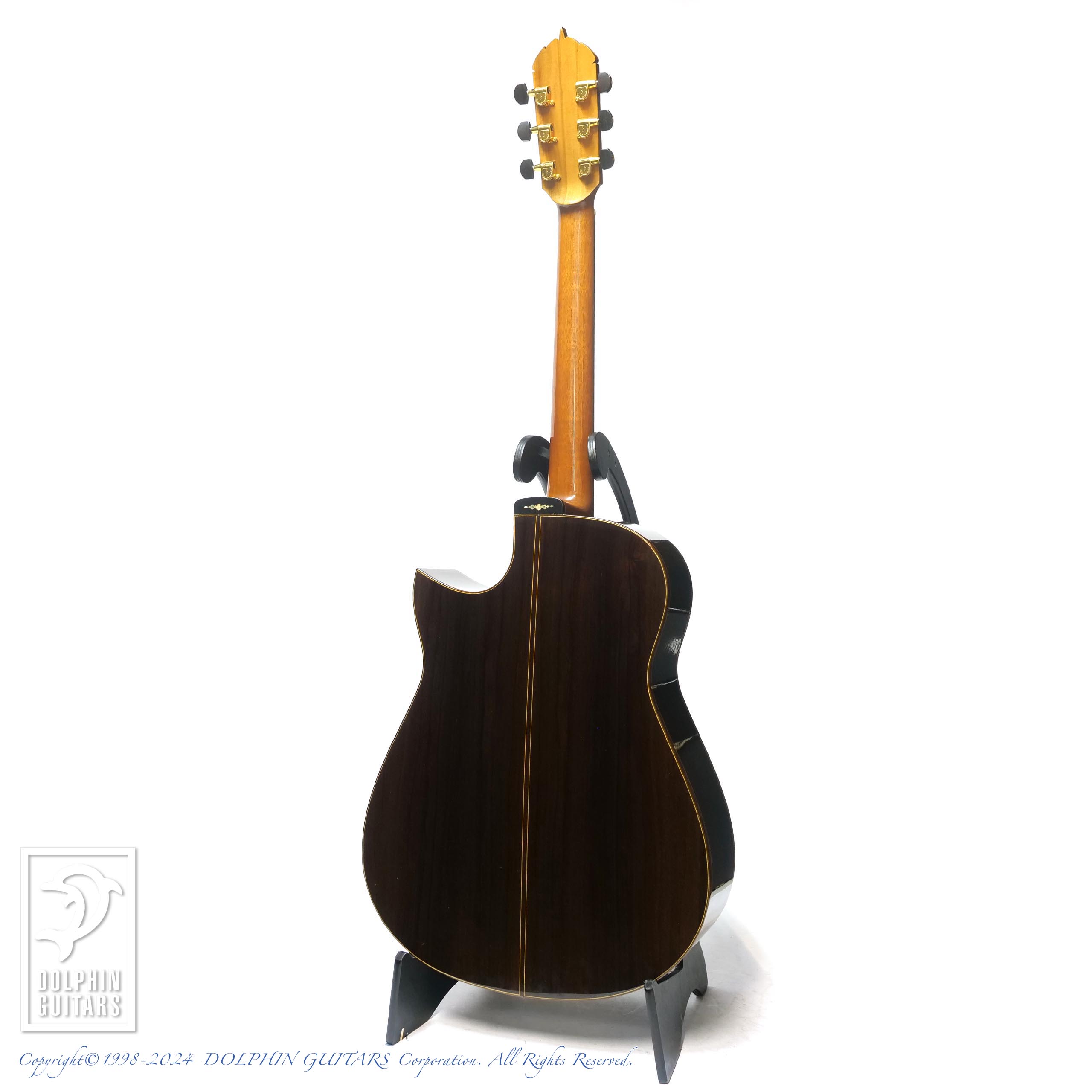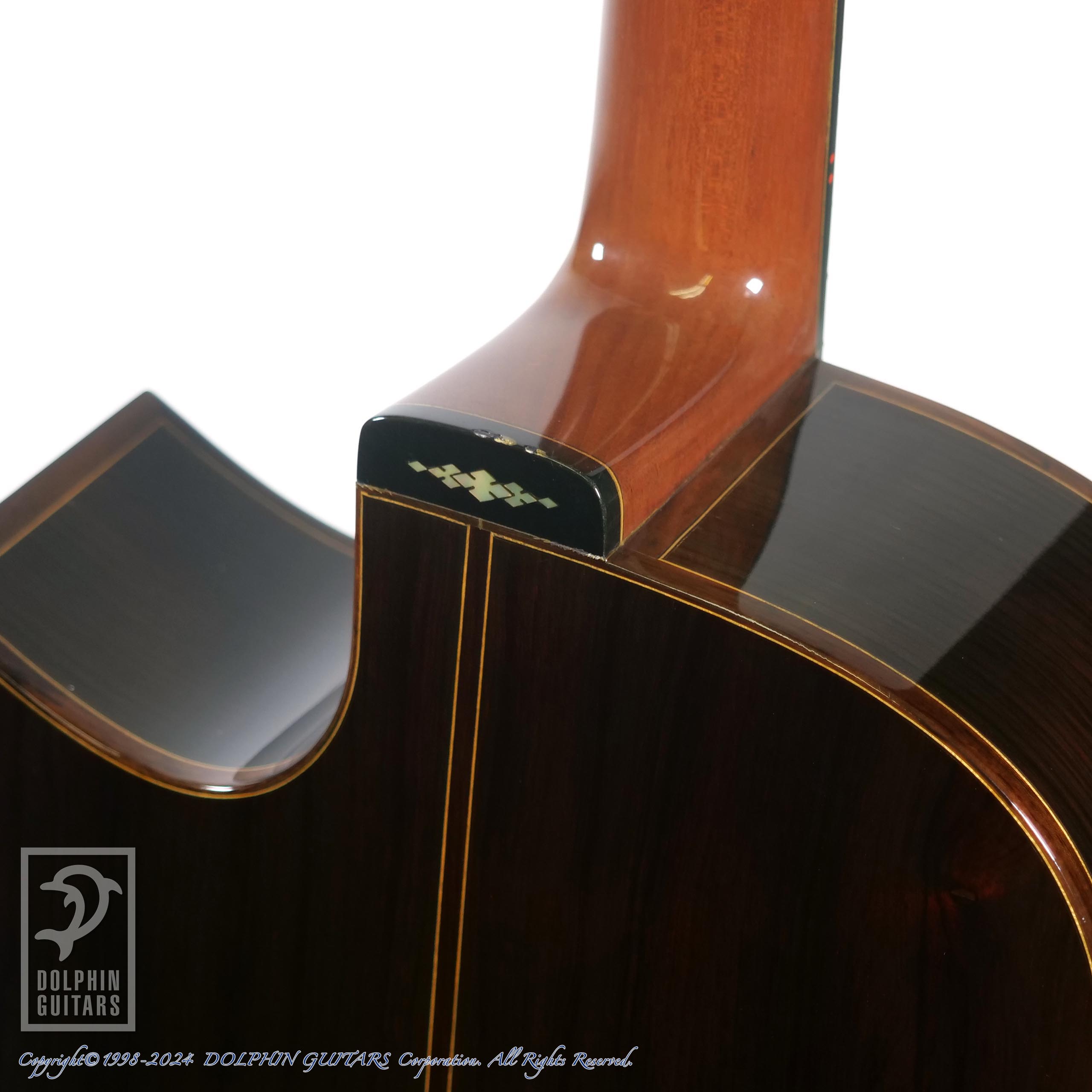 モディファイカッタウェイに目の整った美しいハカランダ、ソモギの特徴でもあるフィンガーボードのライナーインレイの美しさなど、もはや工芸品の域に達した仕上がりは演奏家はもちろんコレクターをも魅了します。ラベルに押された”想茂木作”の印鑑も芸術性を高めているデティールと言えるでしょう。
