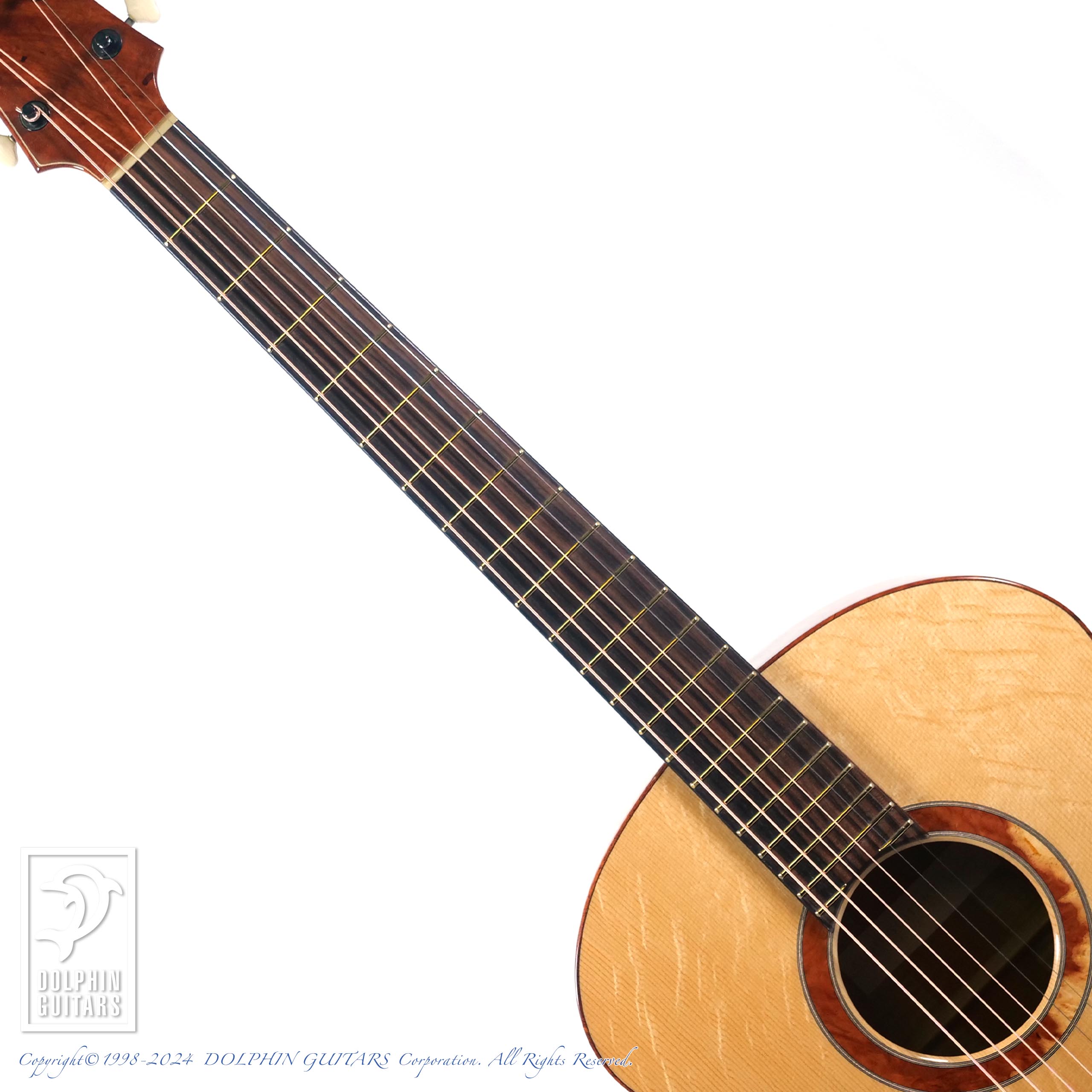 歪み杢の栃材は銘木として扱われており、中でもこれほどの歪み杢は滅多にお目にかかれません。またトーンウッドとしても素晴らしい素材で、レスポンスの早さやロングサスティーンに驚愕します。この倍音成分豊かな超ロングサスティーンが生み出すナチュラルリヴァーブは最高に心地よい響きです。このサイズでこれほどのボリュームやレンジの広さ、サウンドの厚みは絶品としか言いようがありません。