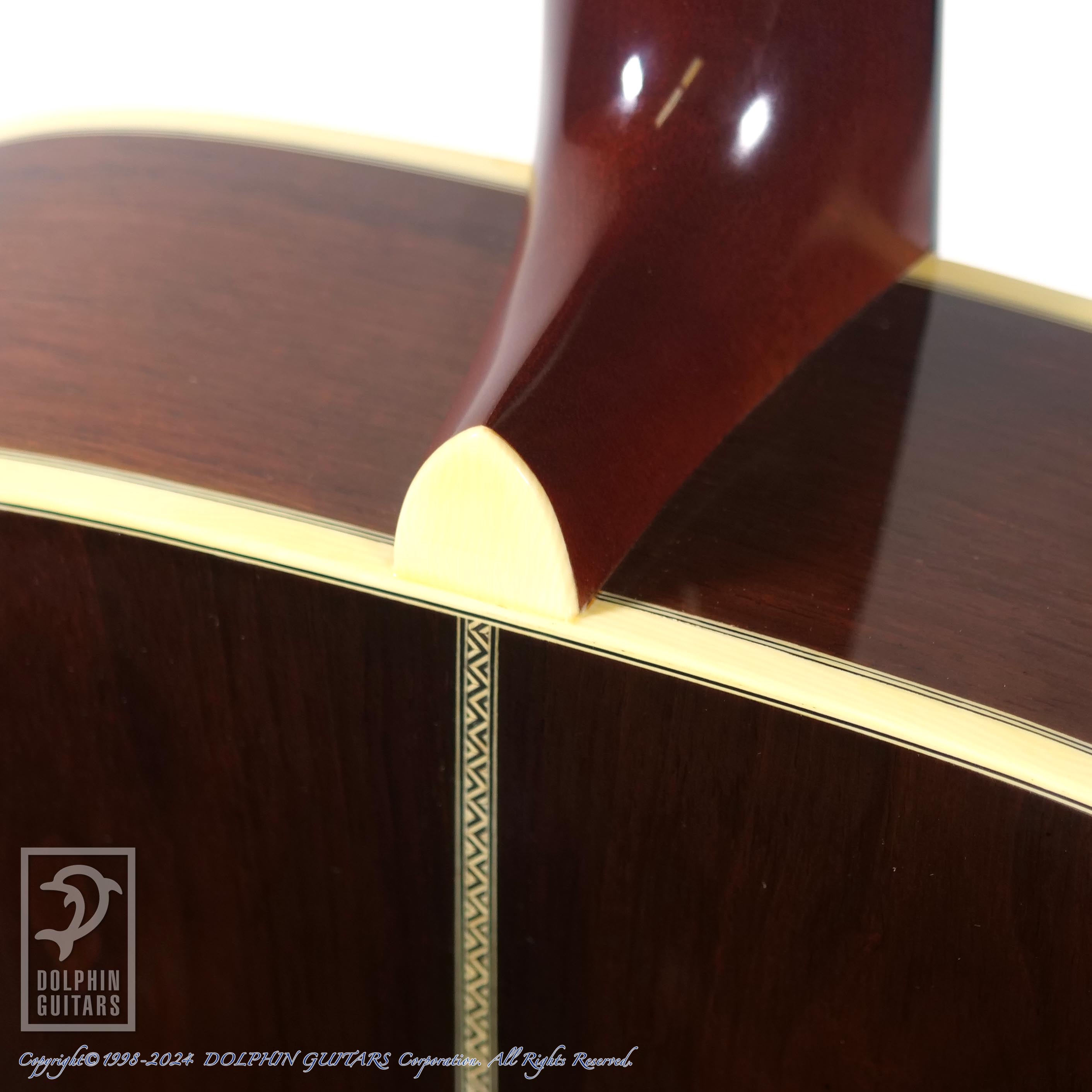正統派OM。ヘッド正面にはロゴもなく、指板ポジションも無い、非常にシンプルなカスタムモデルです。ヘリンボーントリムやロングサドルからヴィンテージを意識していることが分かります。ホンジュラスローズウッドボディや象牙ナット&サドルを使用し、素材への強いこだわりも感じます。