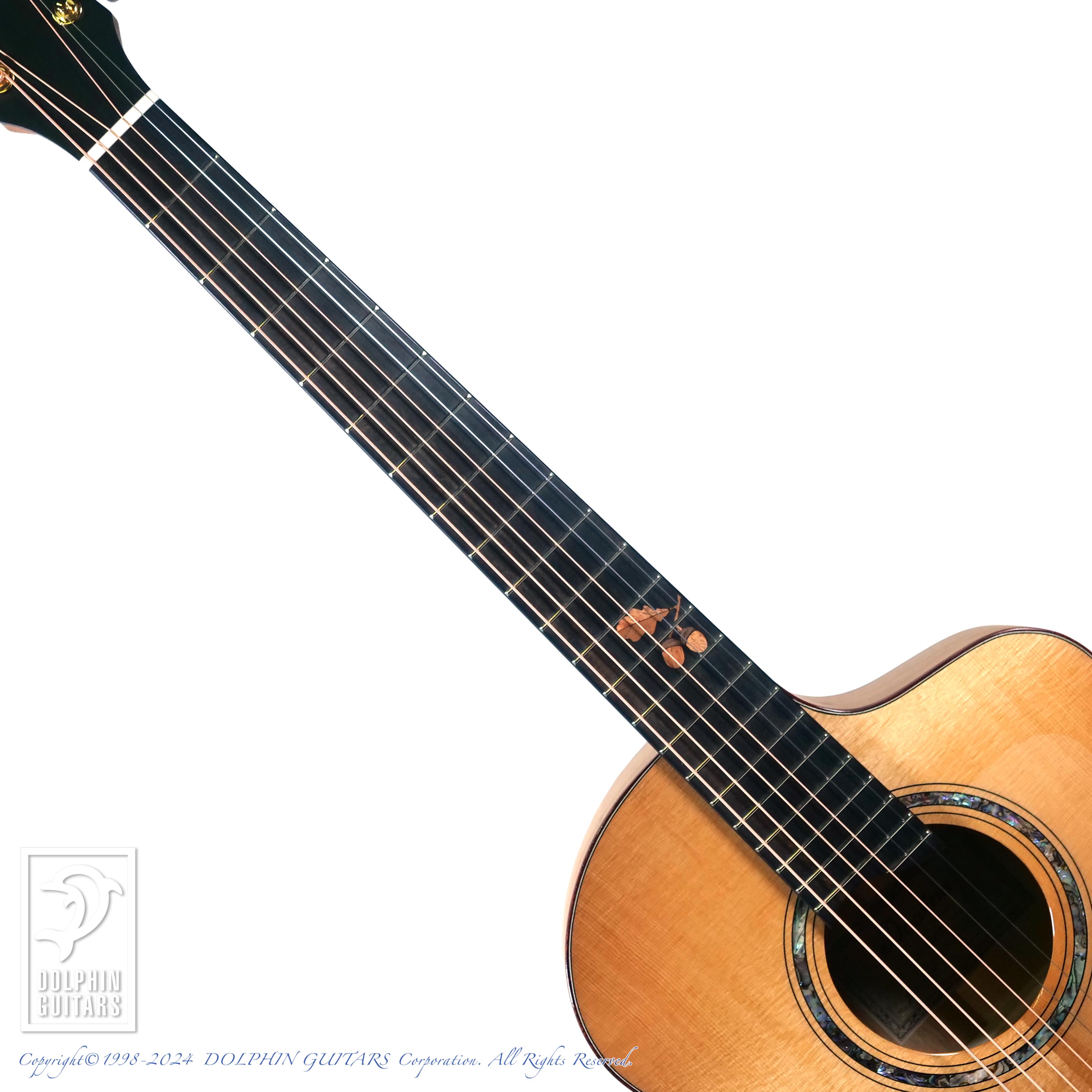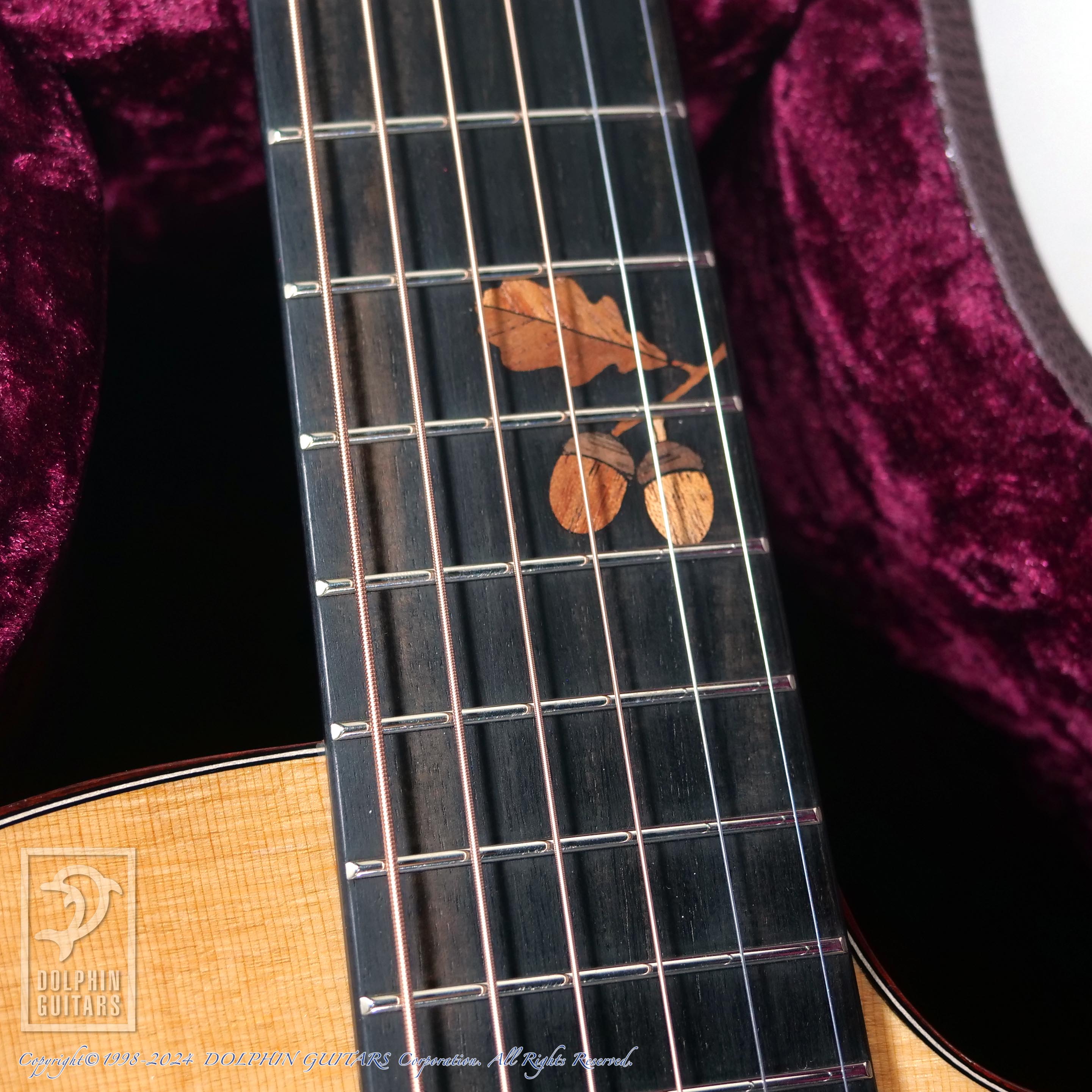 木象嵌で象った指板のインレイ(楢の実=どんぐり)が地産の材料を愛するドウィナらしさをユニークに表しています。