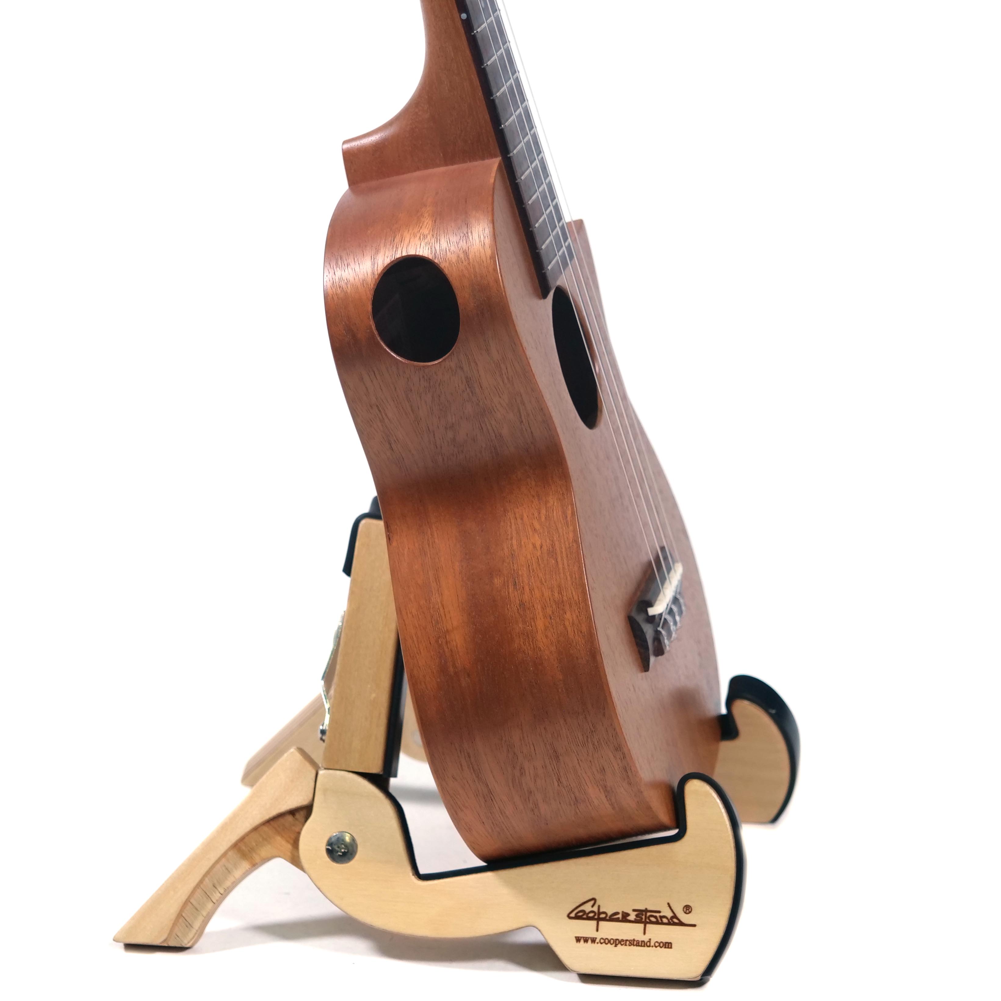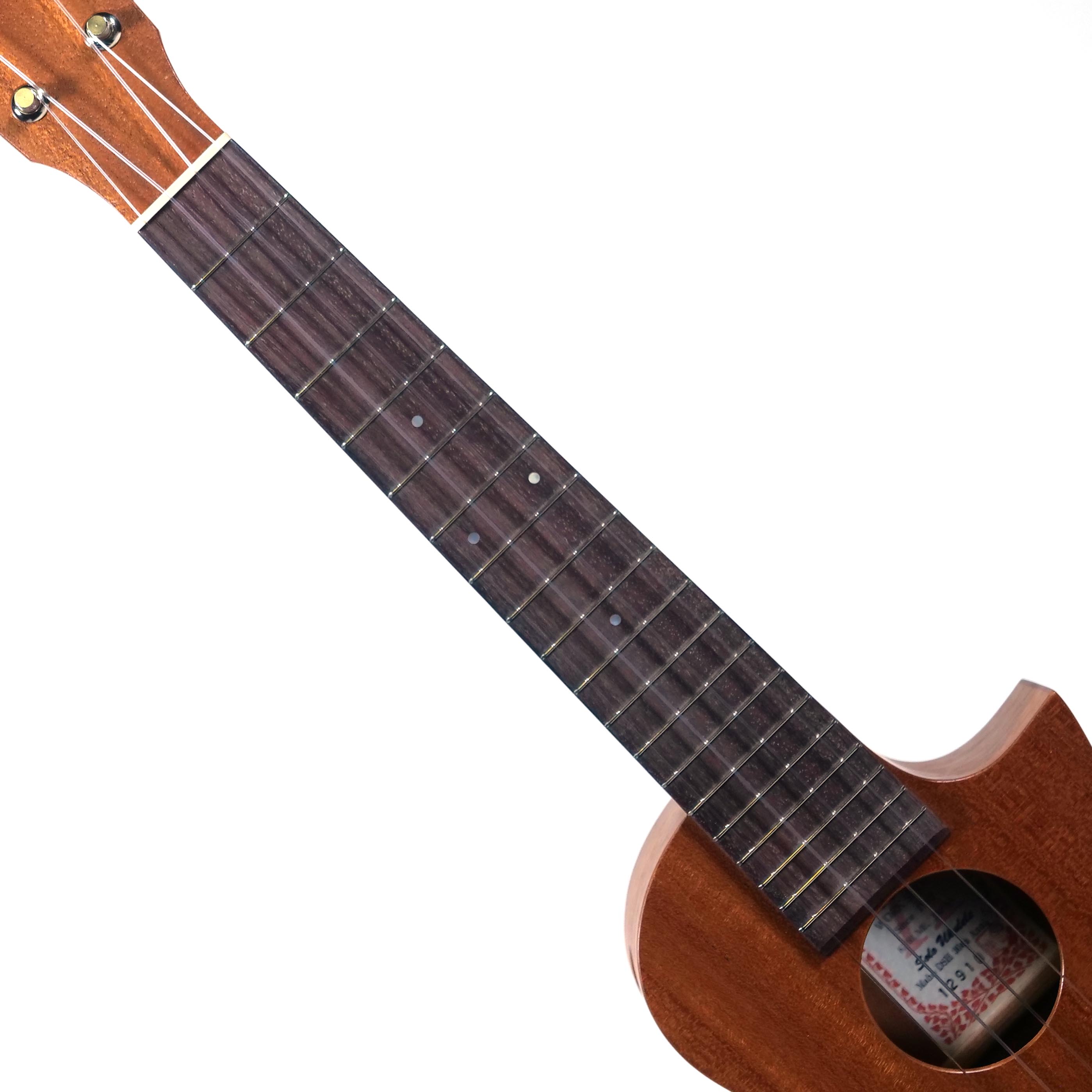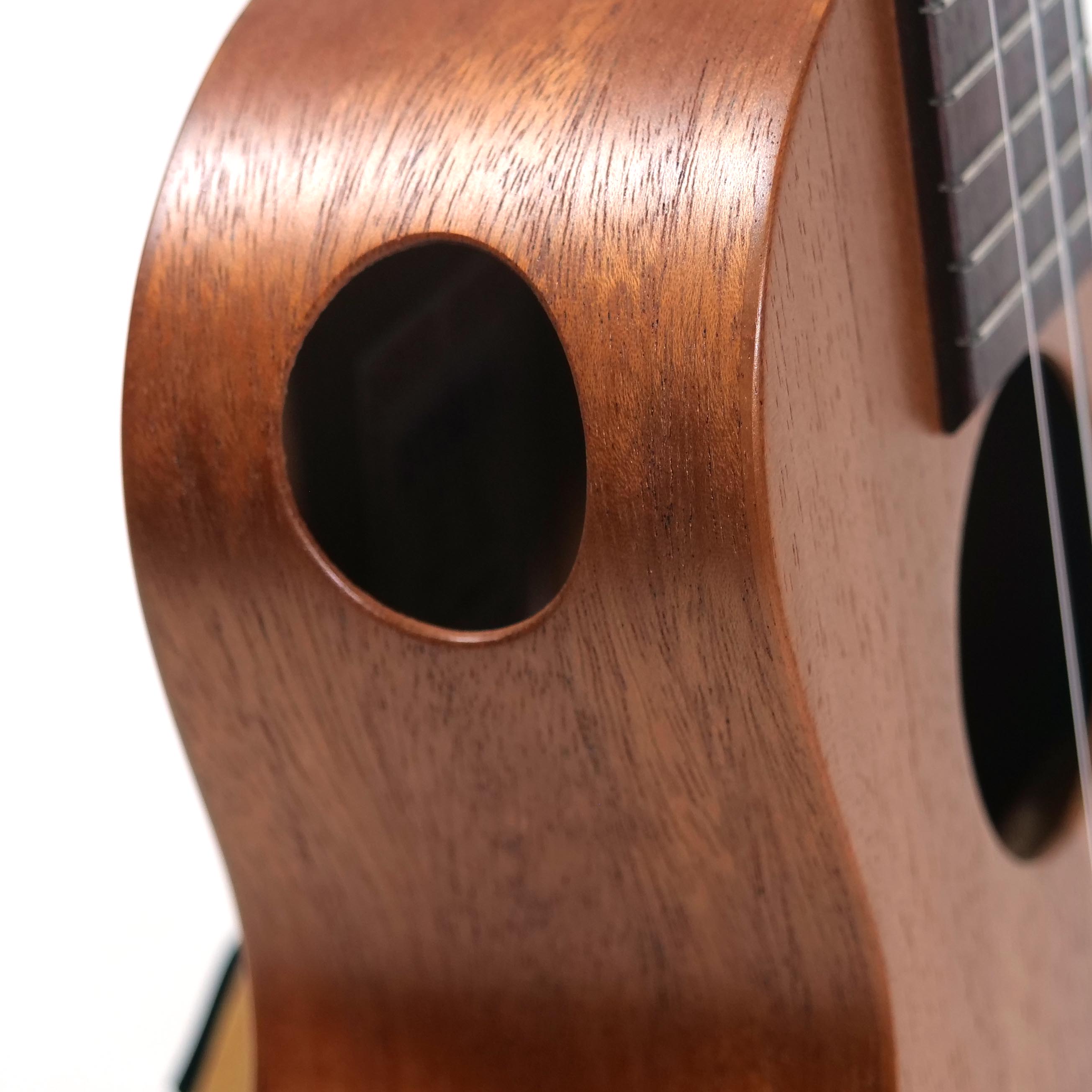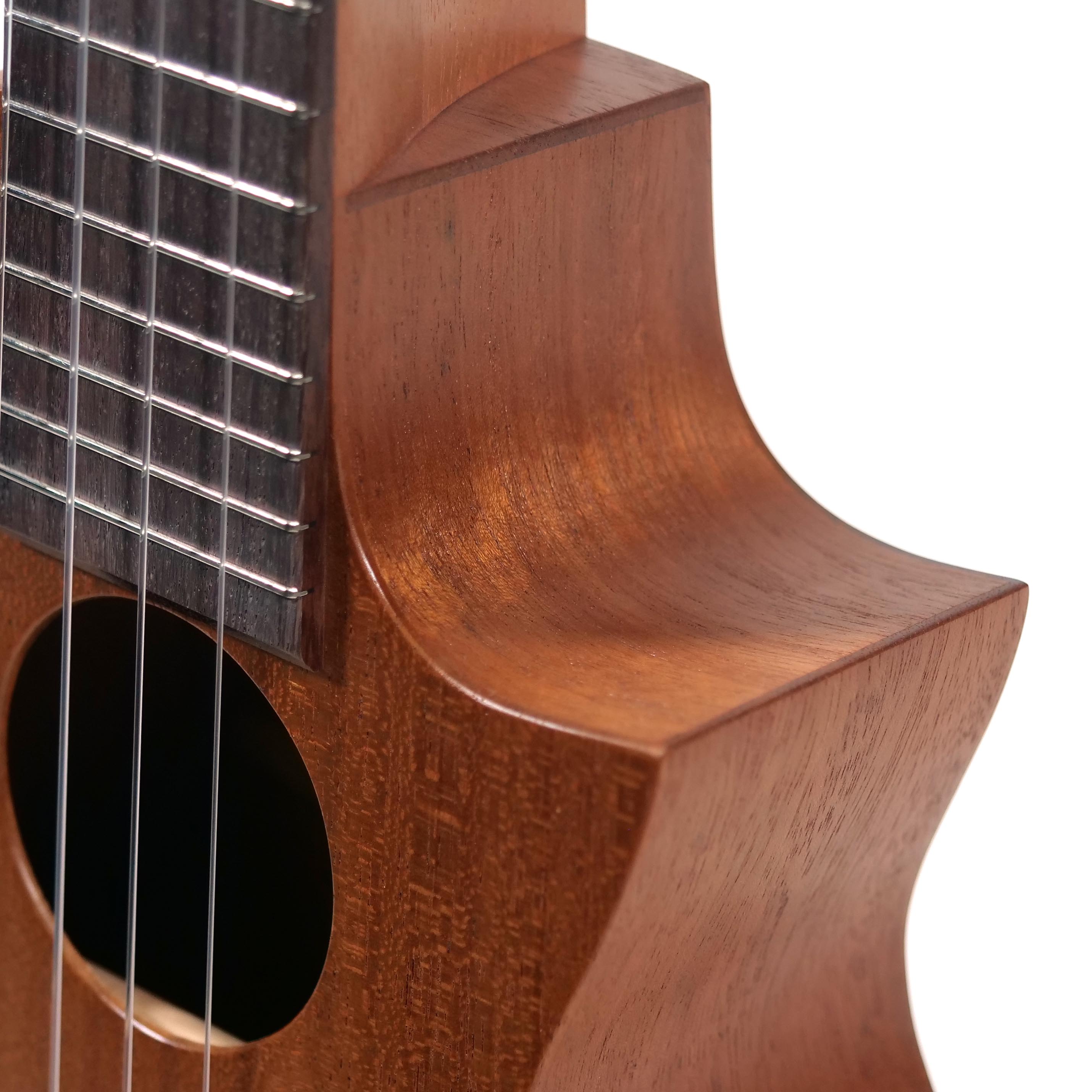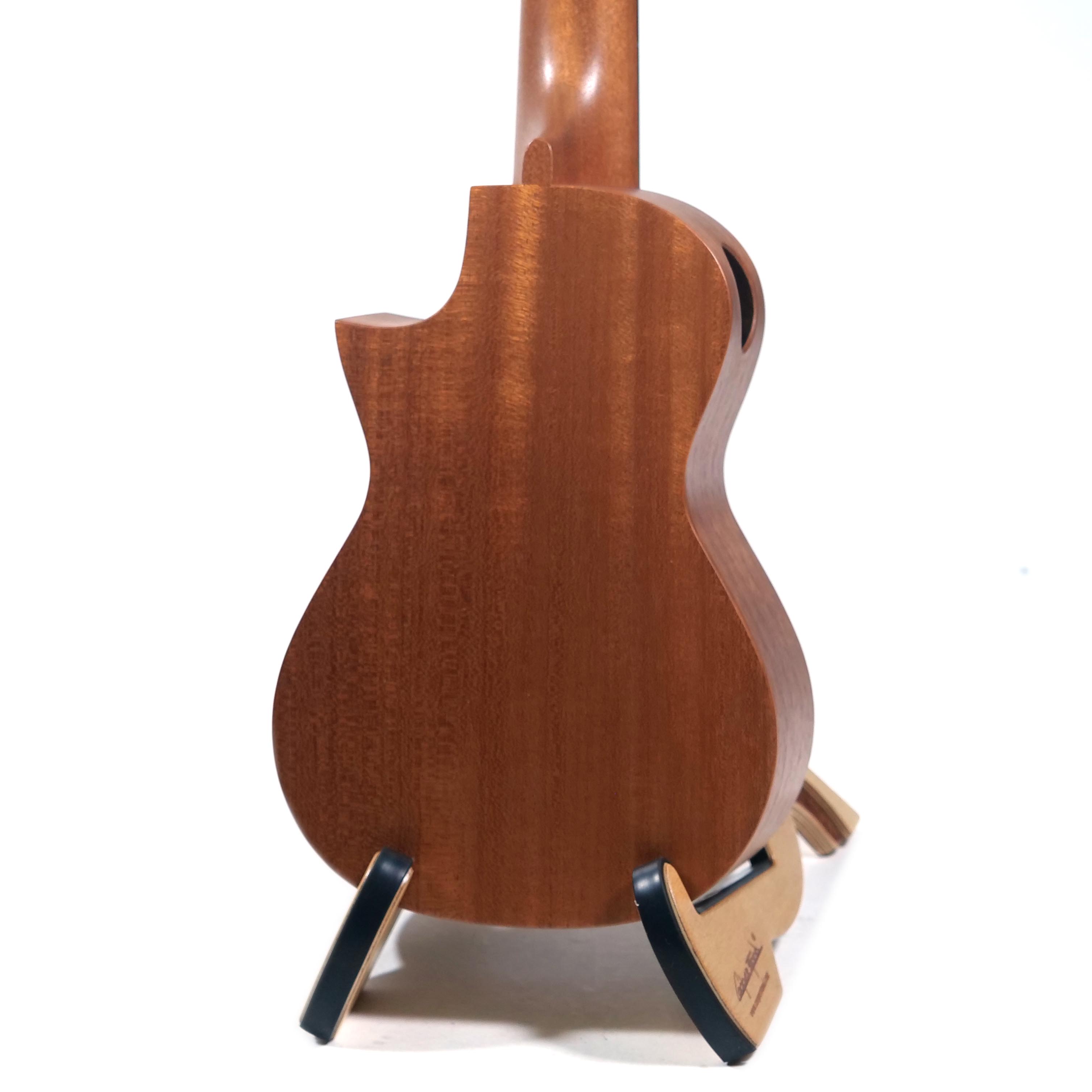 ボディは既存の「ソプラノ」「コンサート」といったサイズではなく、またハイポジションでのプレイアビリティを考え、フローレンタインのカッタウェイを施しています。ボディ内部のブレイシングはギター製作で培った知恵を絞って高さ、幅、形状、配置する位置などを熟慮して決定。ネックのスケールもソロ・プレイ時に苦にならない長さに設定されています。