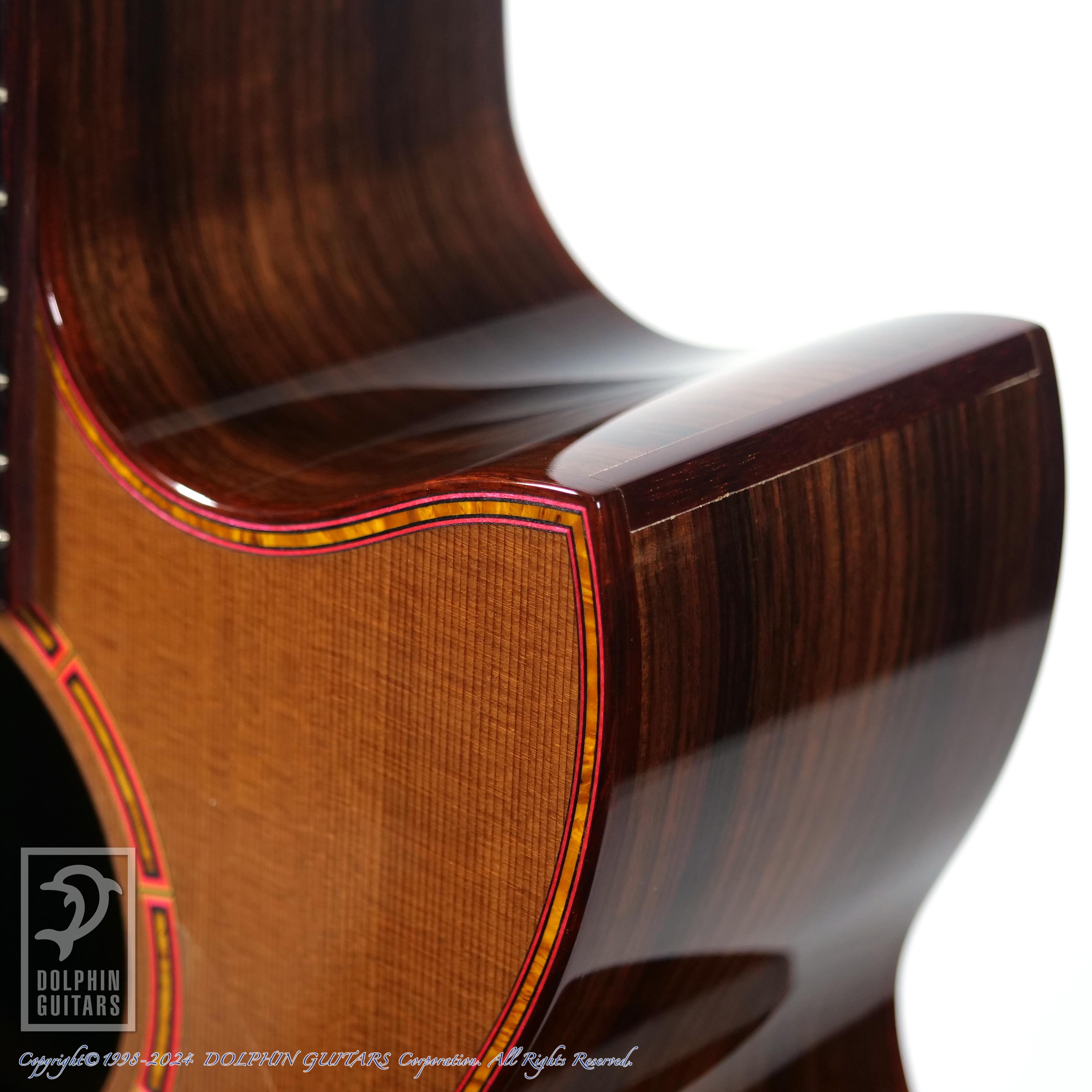 木のサップ(白い部分)を取り入れたヘッドプレートや、12Fのワンポイントインレイ、赤を基調としたモザイクやパーフリングなどなど、唯一無二の仕上がりとなっております。