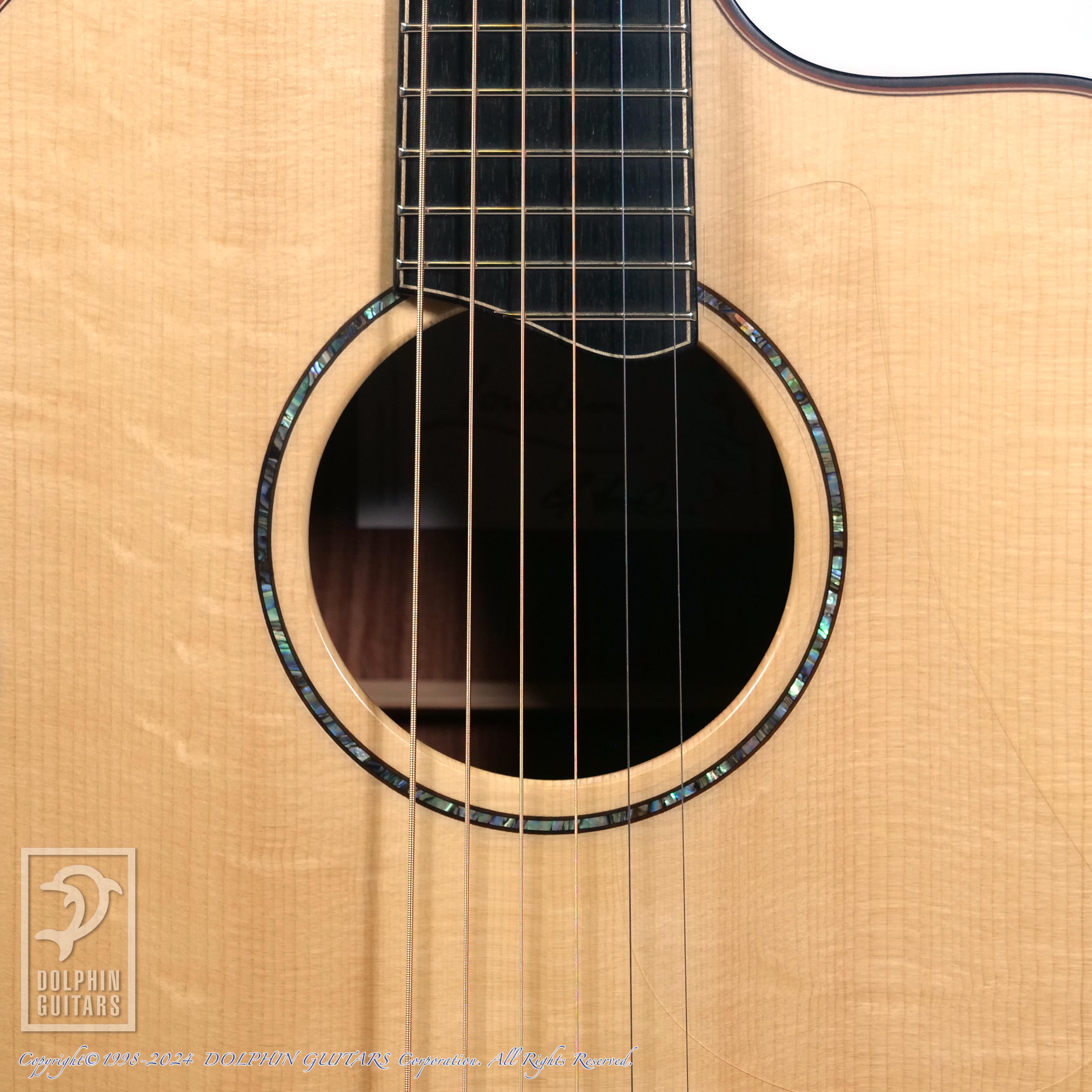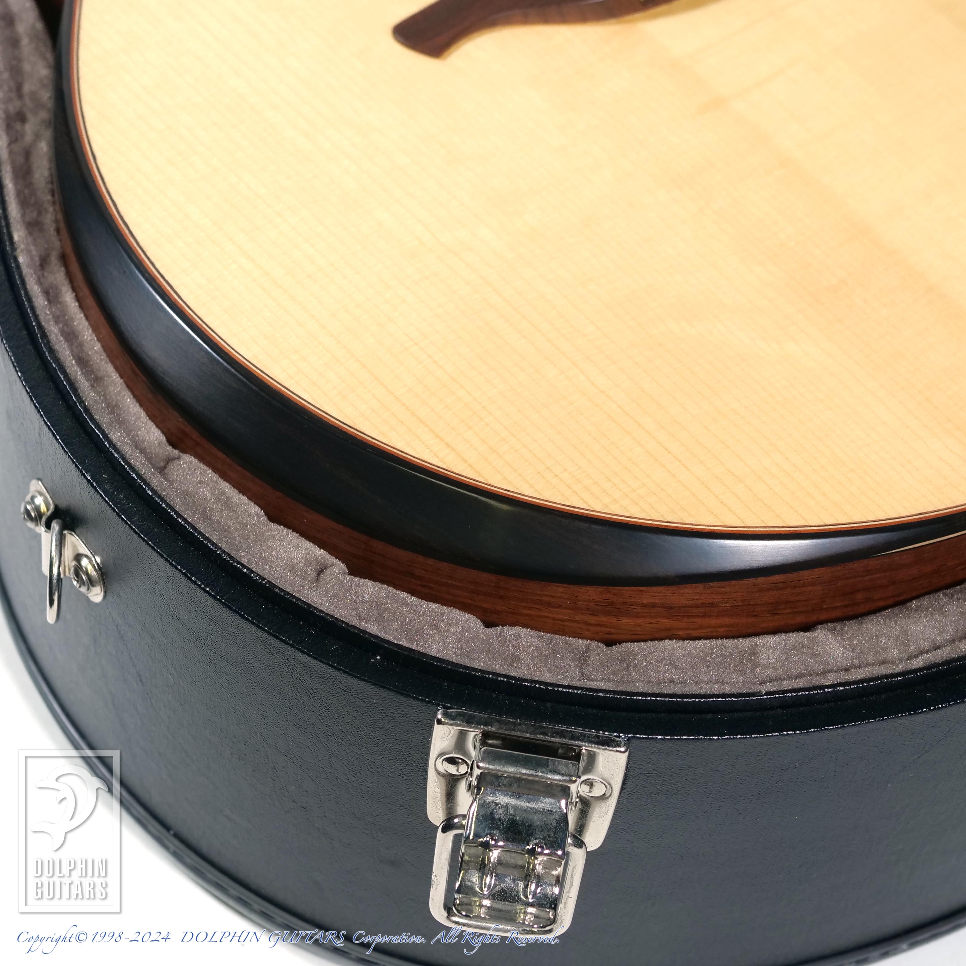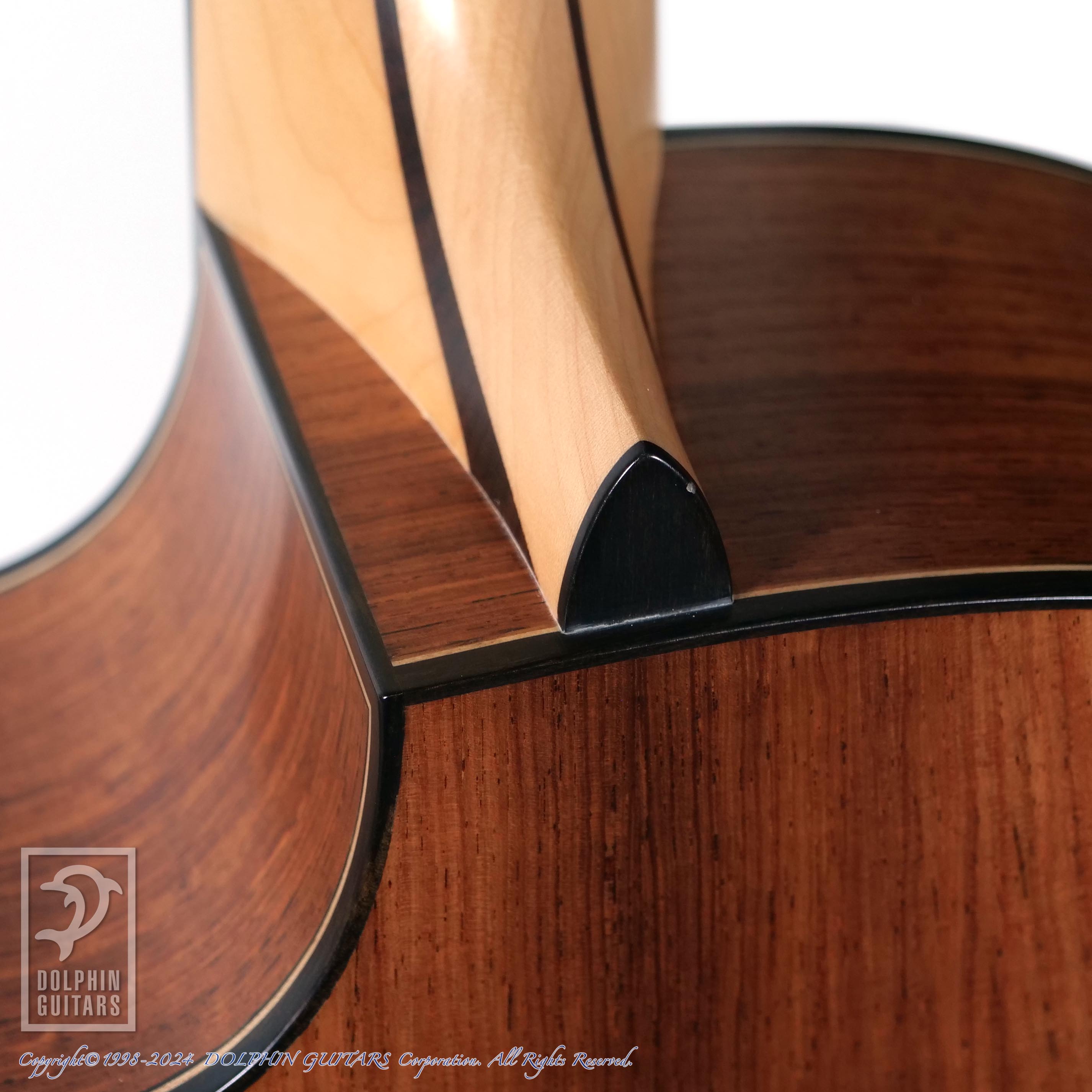 最高グレードのアディロンダックとホンジュラスローズを使用しており、ボディを囲うエボニーバインディングによるアームレストコンター加工が工芸品を思わせる流麗な佇まい。