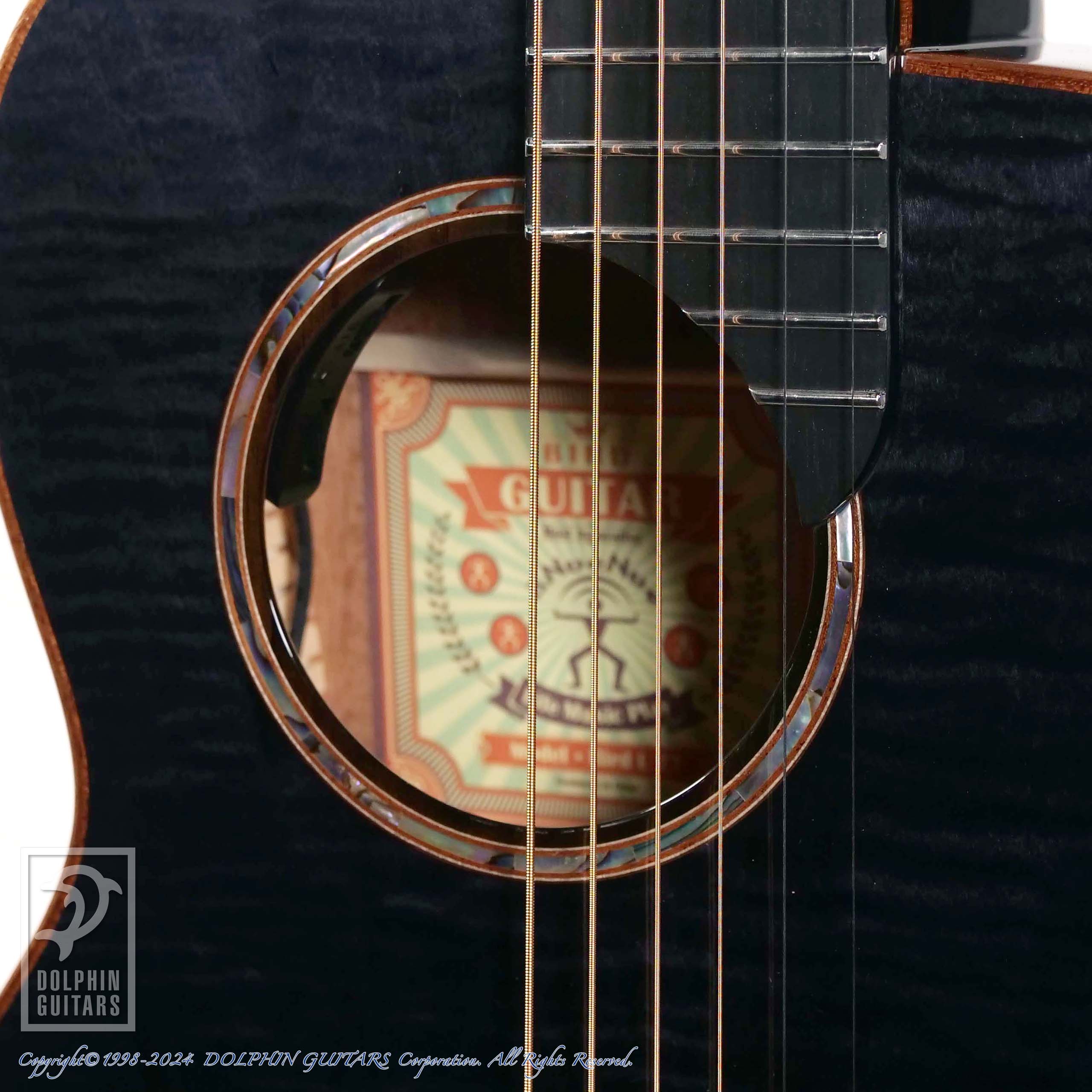 カーリーメイプルをセダー材の表面に配した美しいギター。シースルーブラック塗装により、杢目が浮かび上がるような幻想的な印象を与えます。サイド&バックはほのかにラメが輝く凝った仕様です。