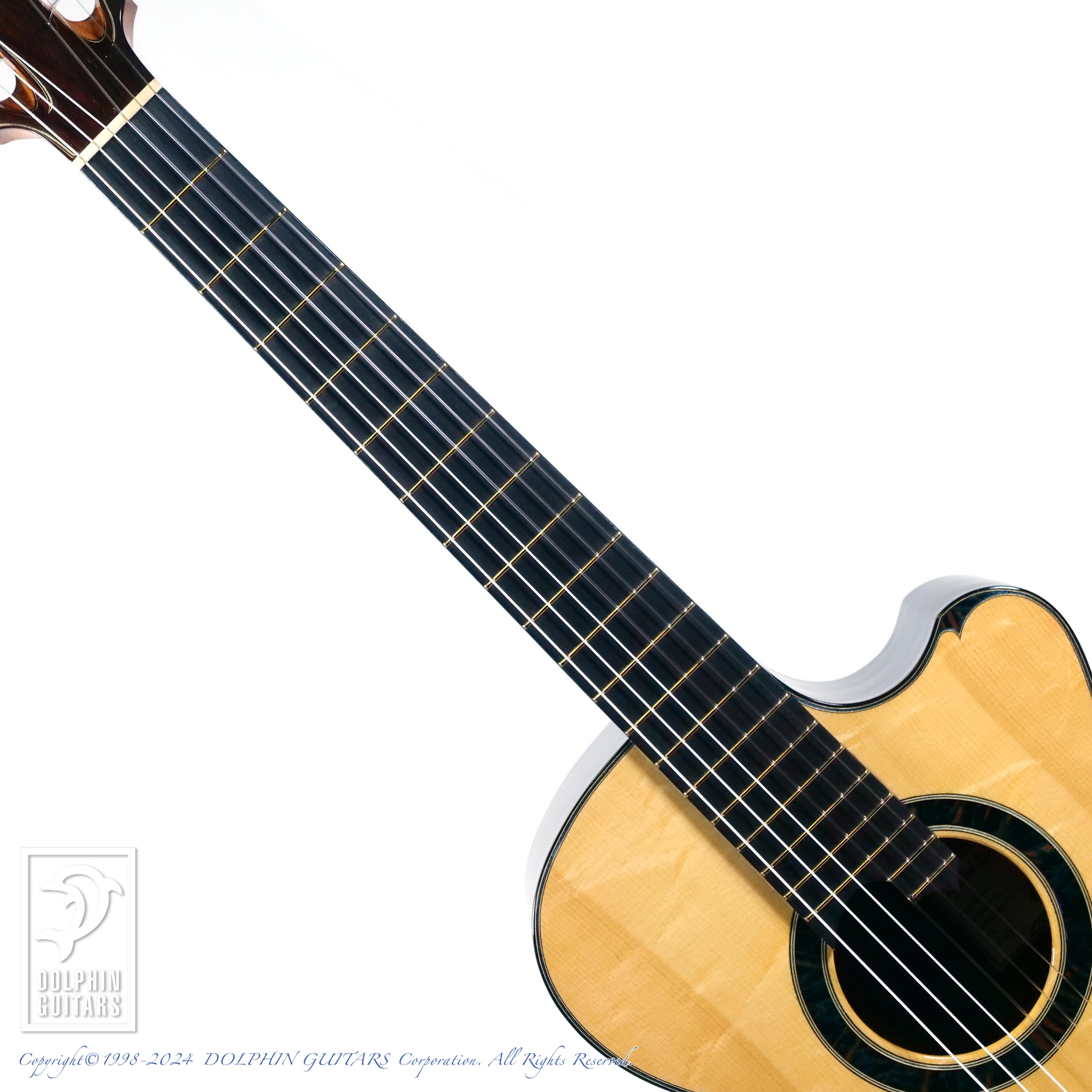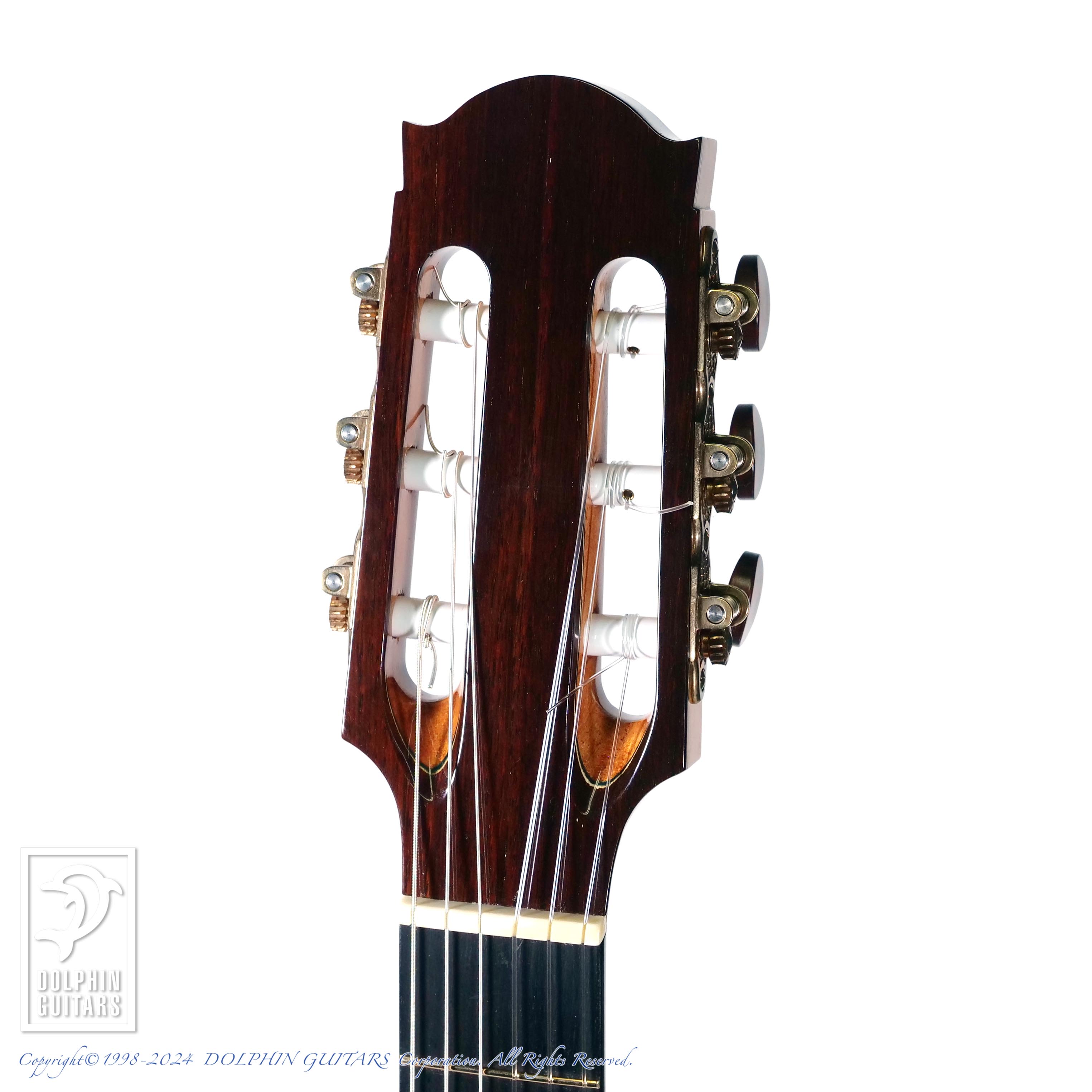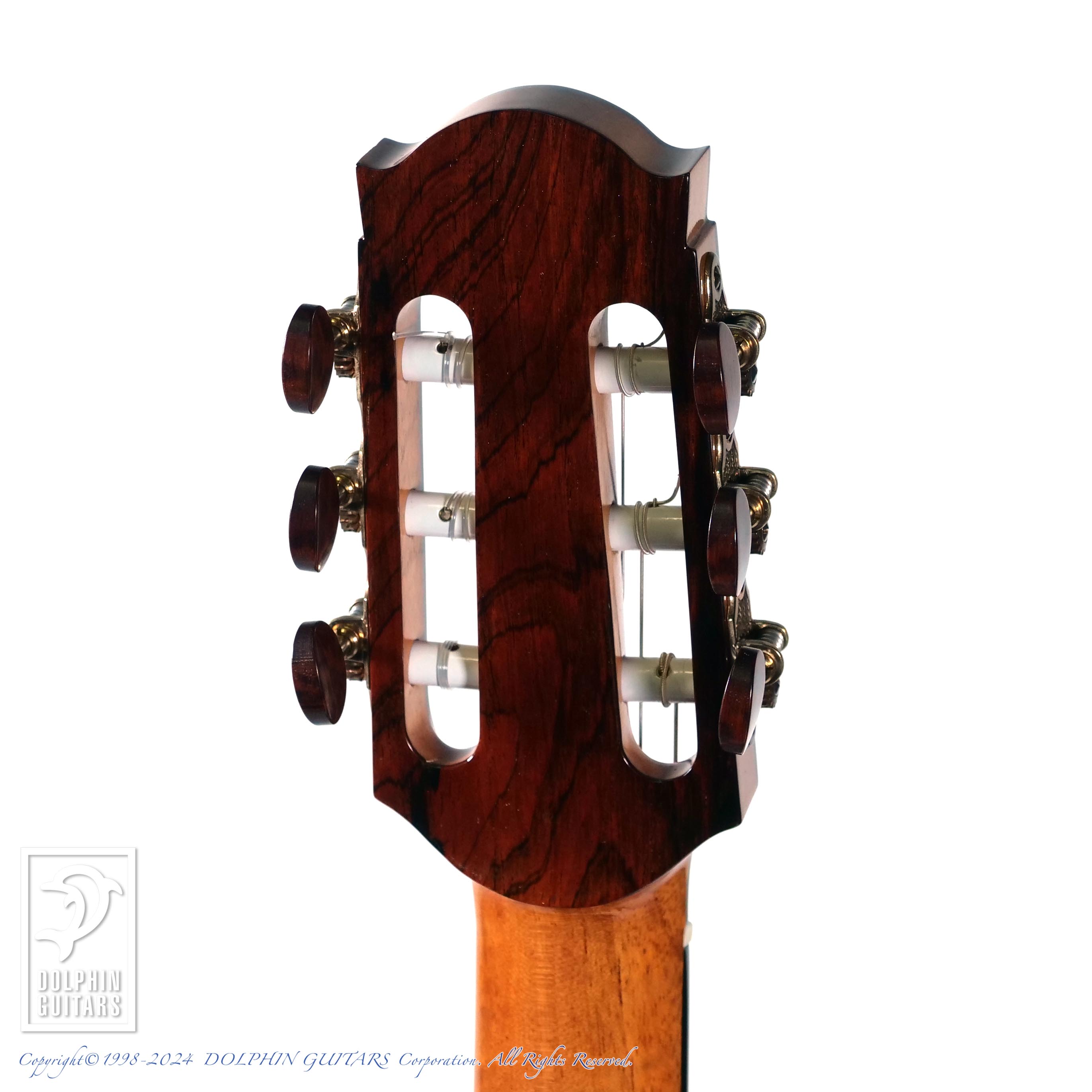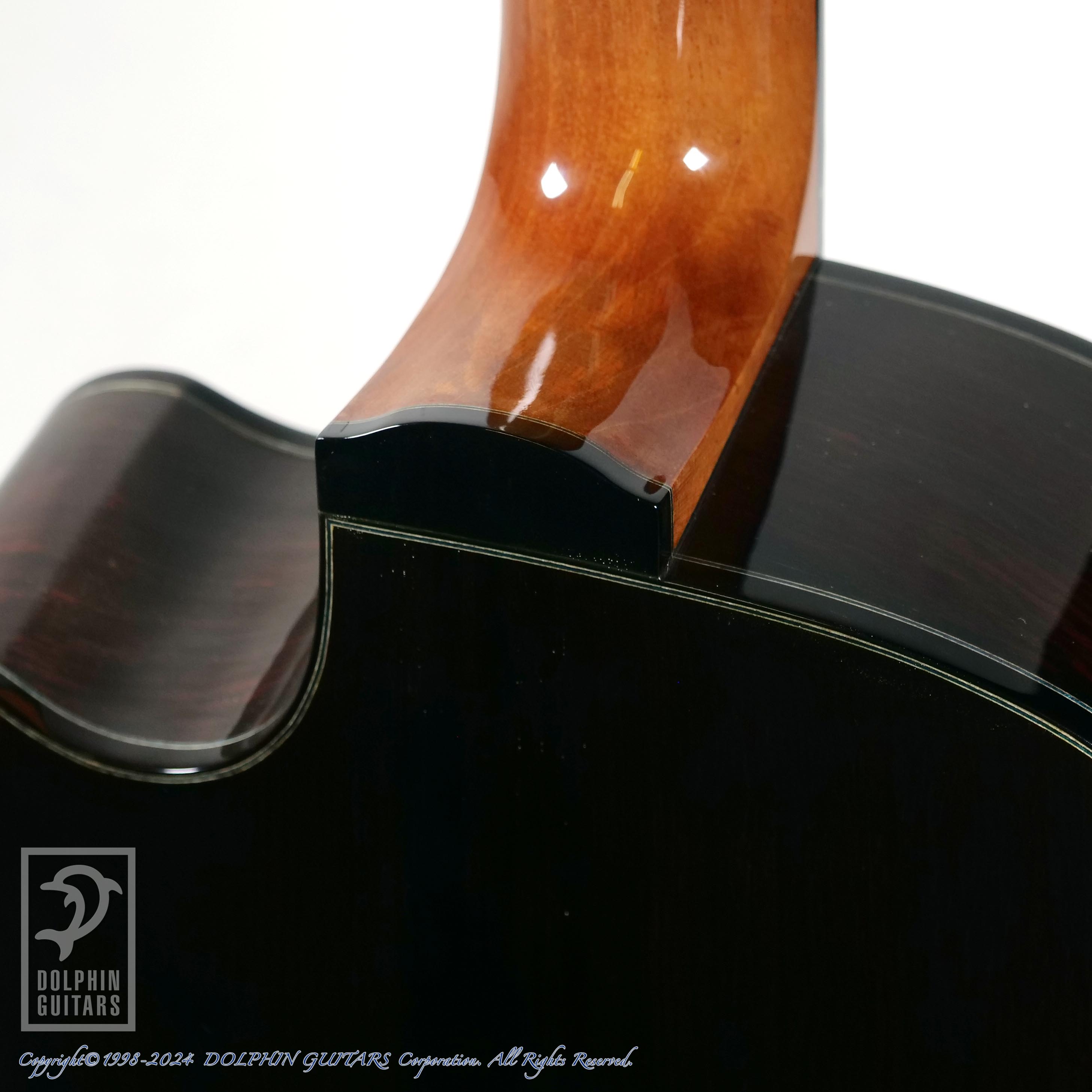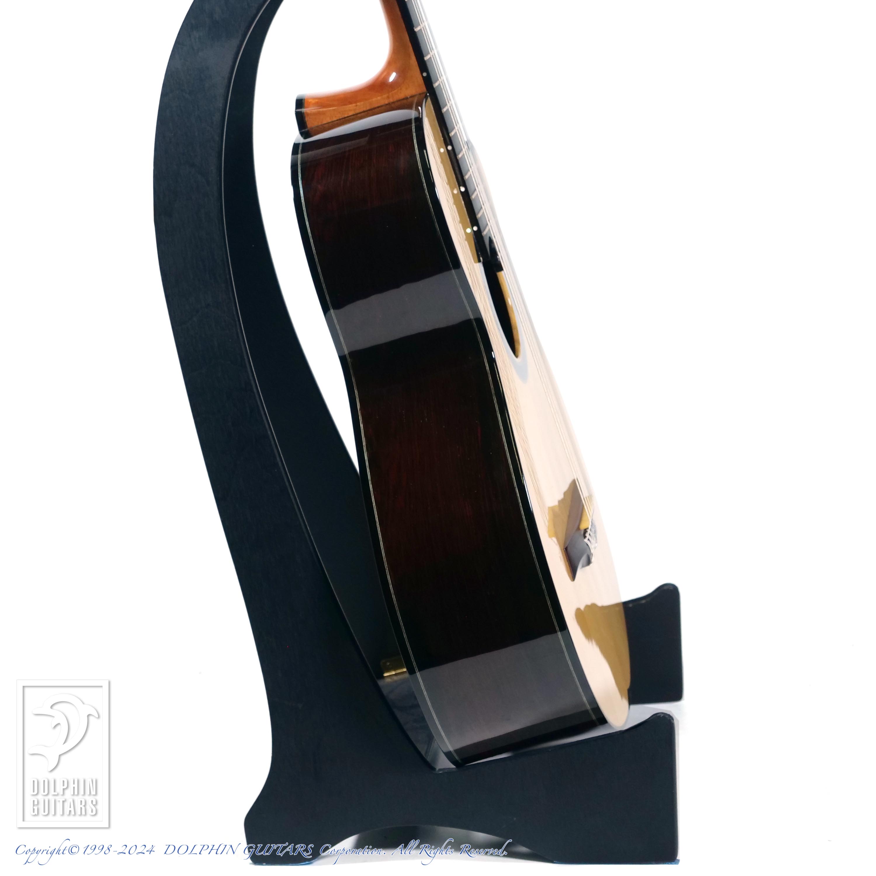12Fジョイント・カッタウェイを採用し、ボディサイズは00に限りなく近く、650mmロングスケール仕様ともあり、ネック/ヘッドの重量バランスを考慮し、カーボンロッドや超軽量のアレッシ糸巻きを使用しております。