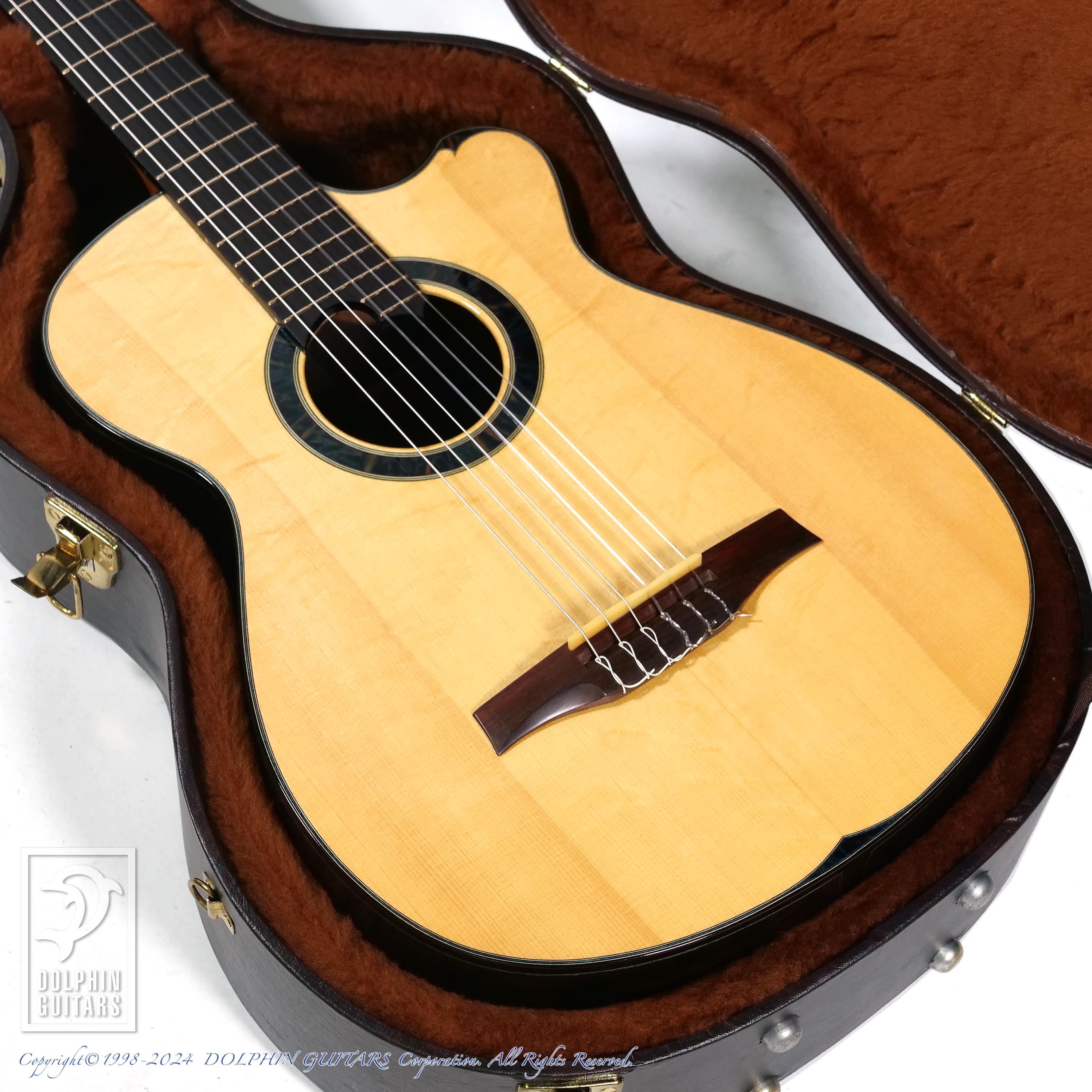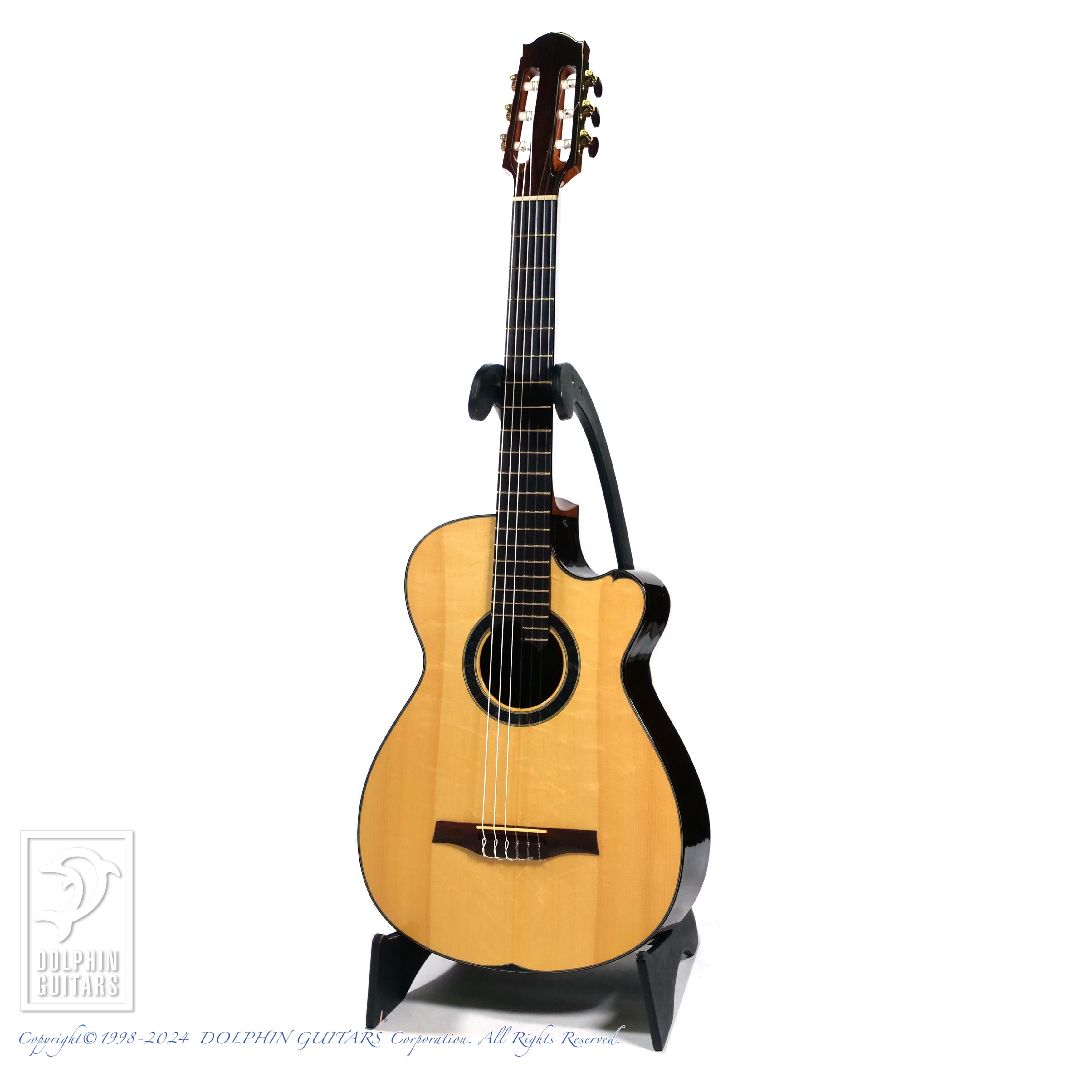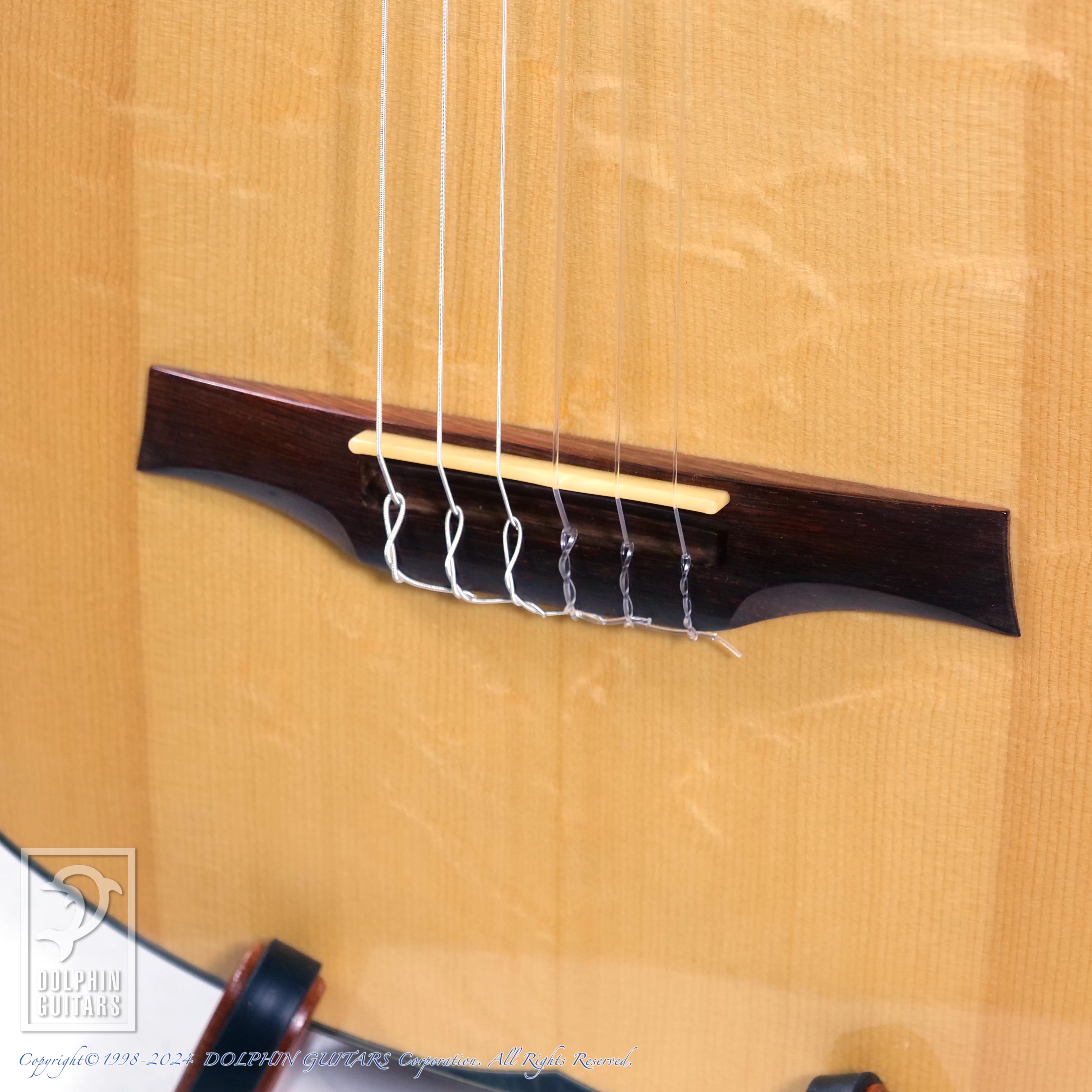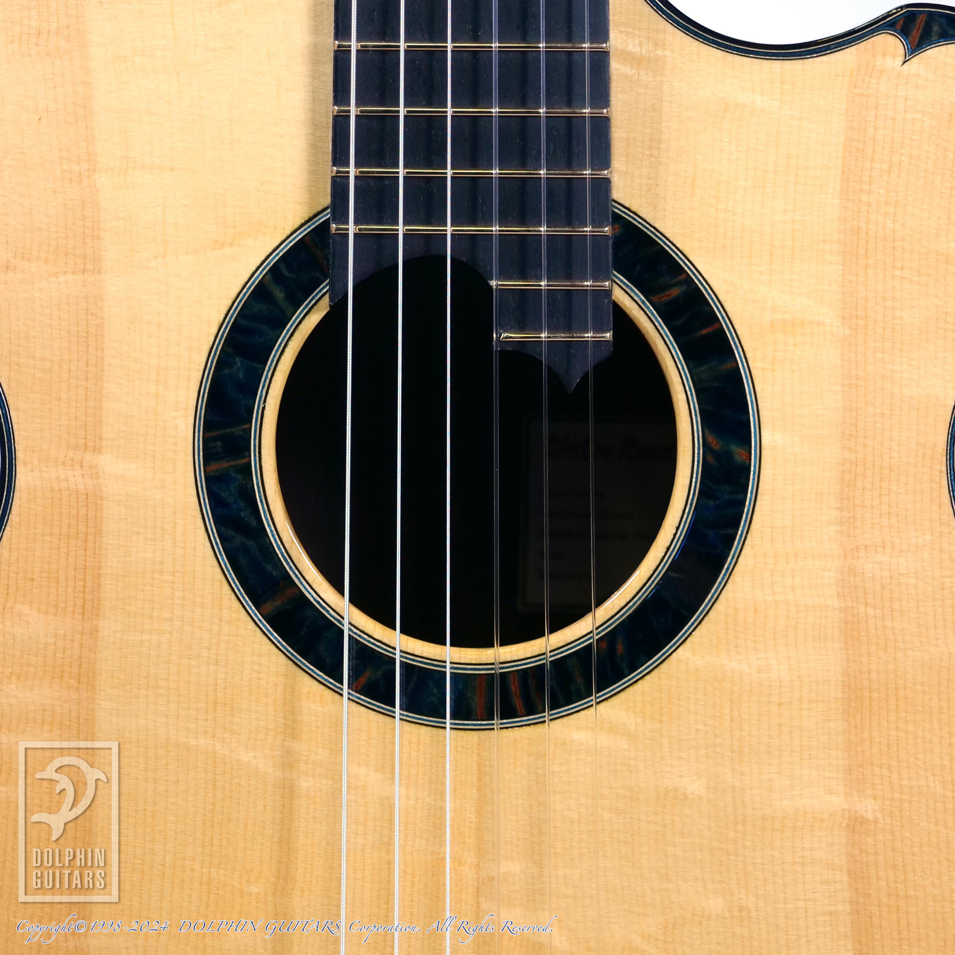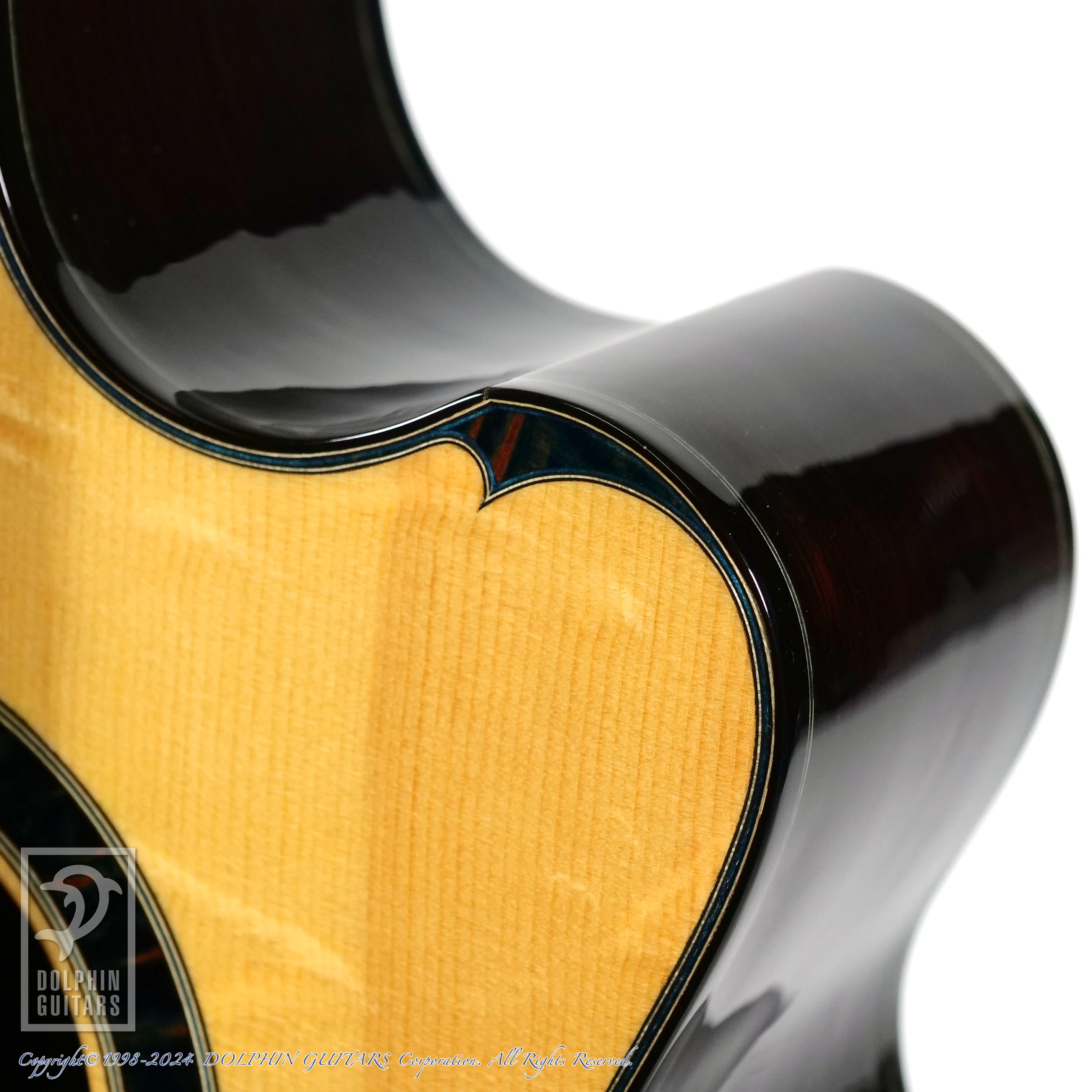 12Fジョイント・カッタウェイを採用し、ボディサイズは00に限りなく近く、650mmロングスケール仕様ともあり、ネック/ヘッドの重量バランスを考慮し、カーボンロッドや超軽量のアレッシ糸巻きを使用しております。