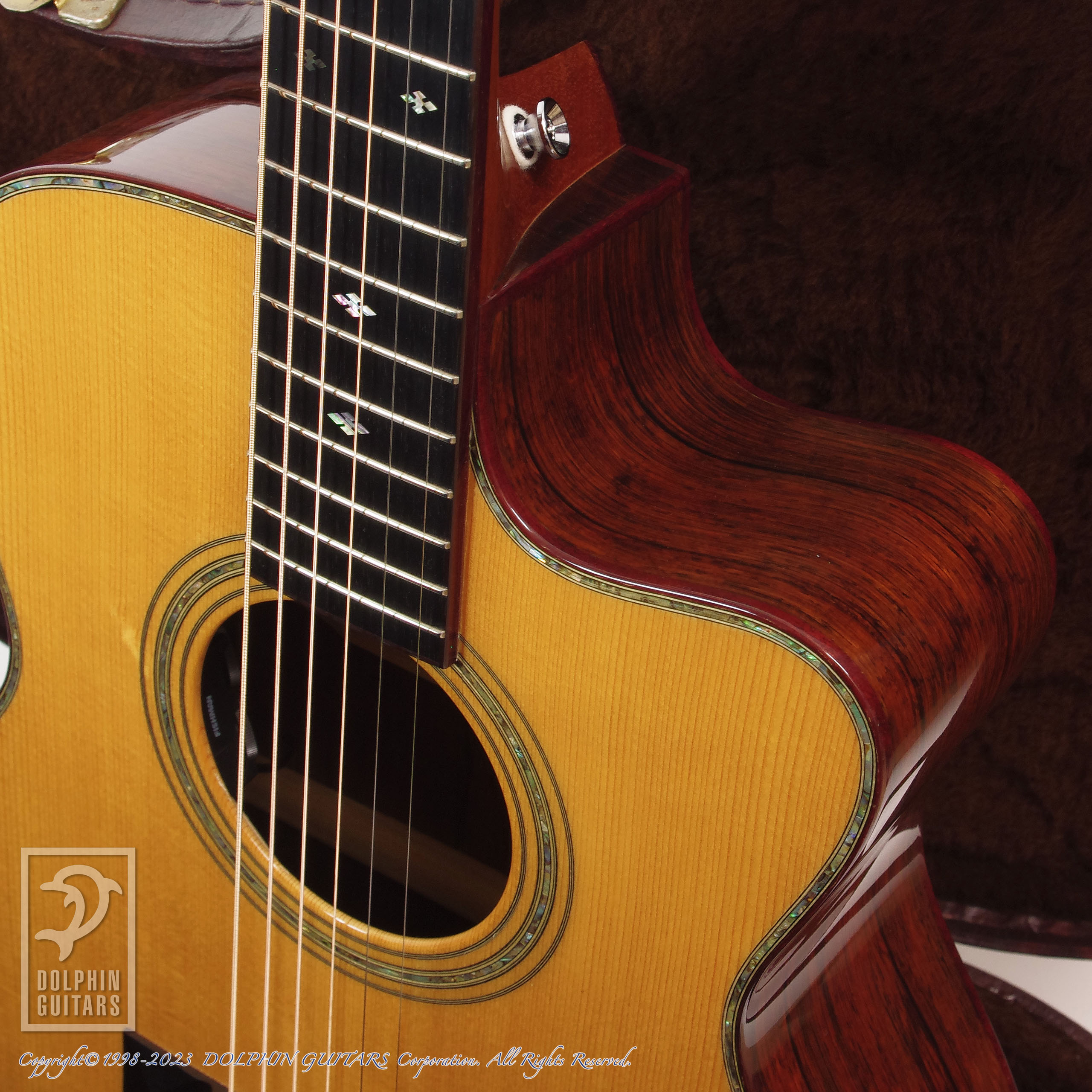 その他:43mmナット幅、645mmスケール、パープルハートウッドバインディング、トーチインレイ、アバロントリム&ロゼッタ