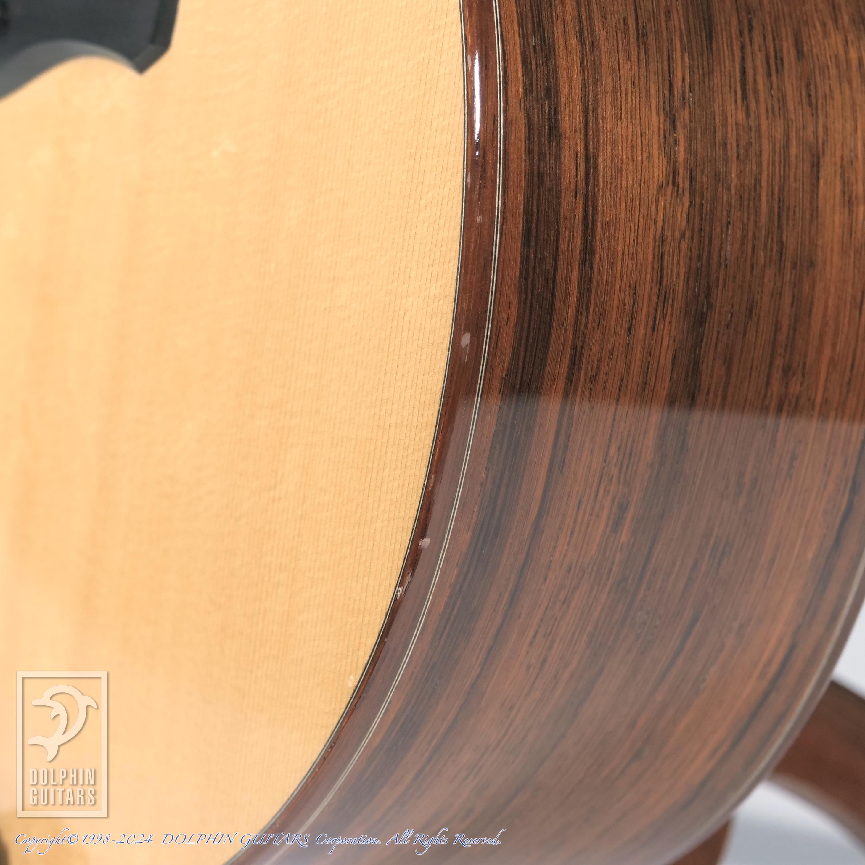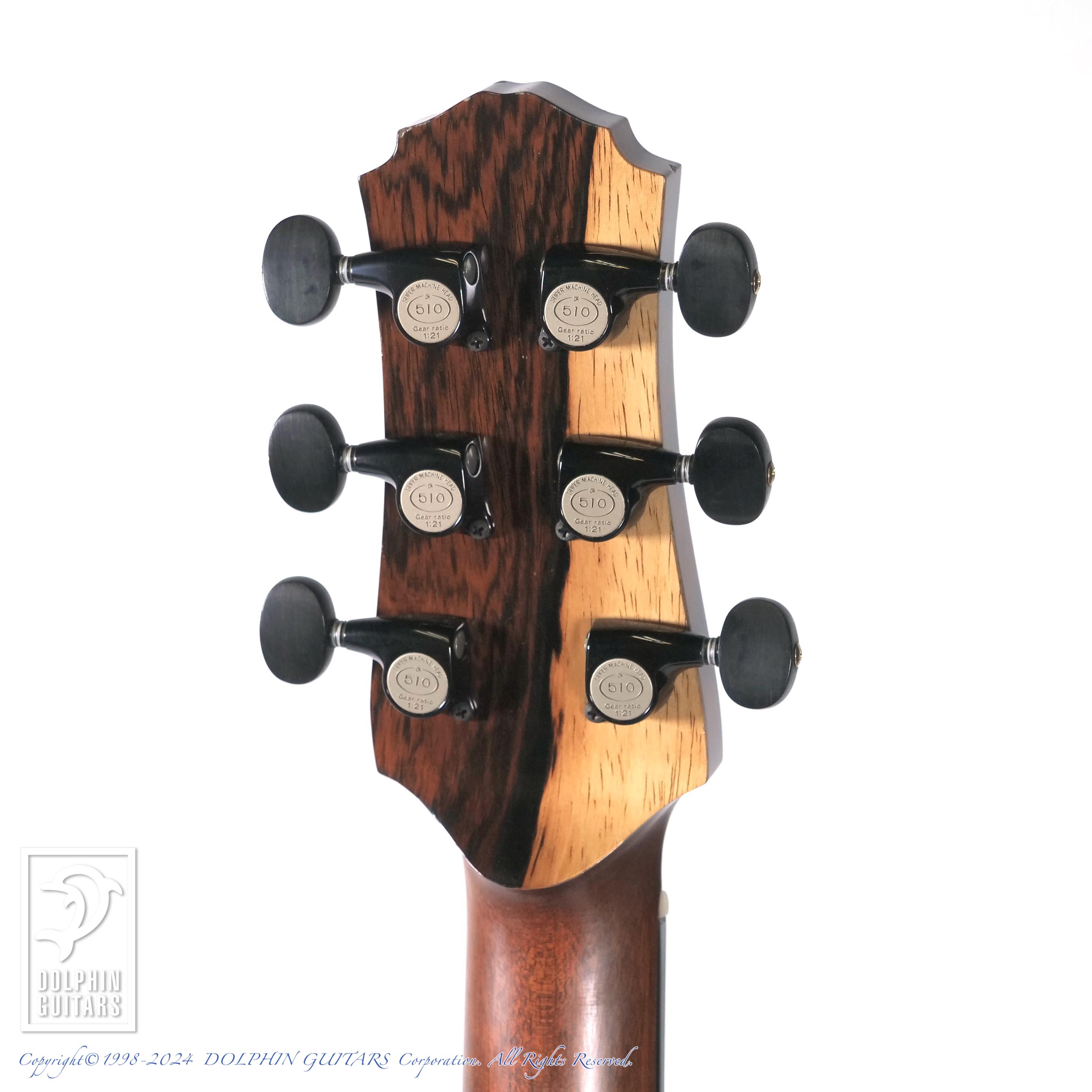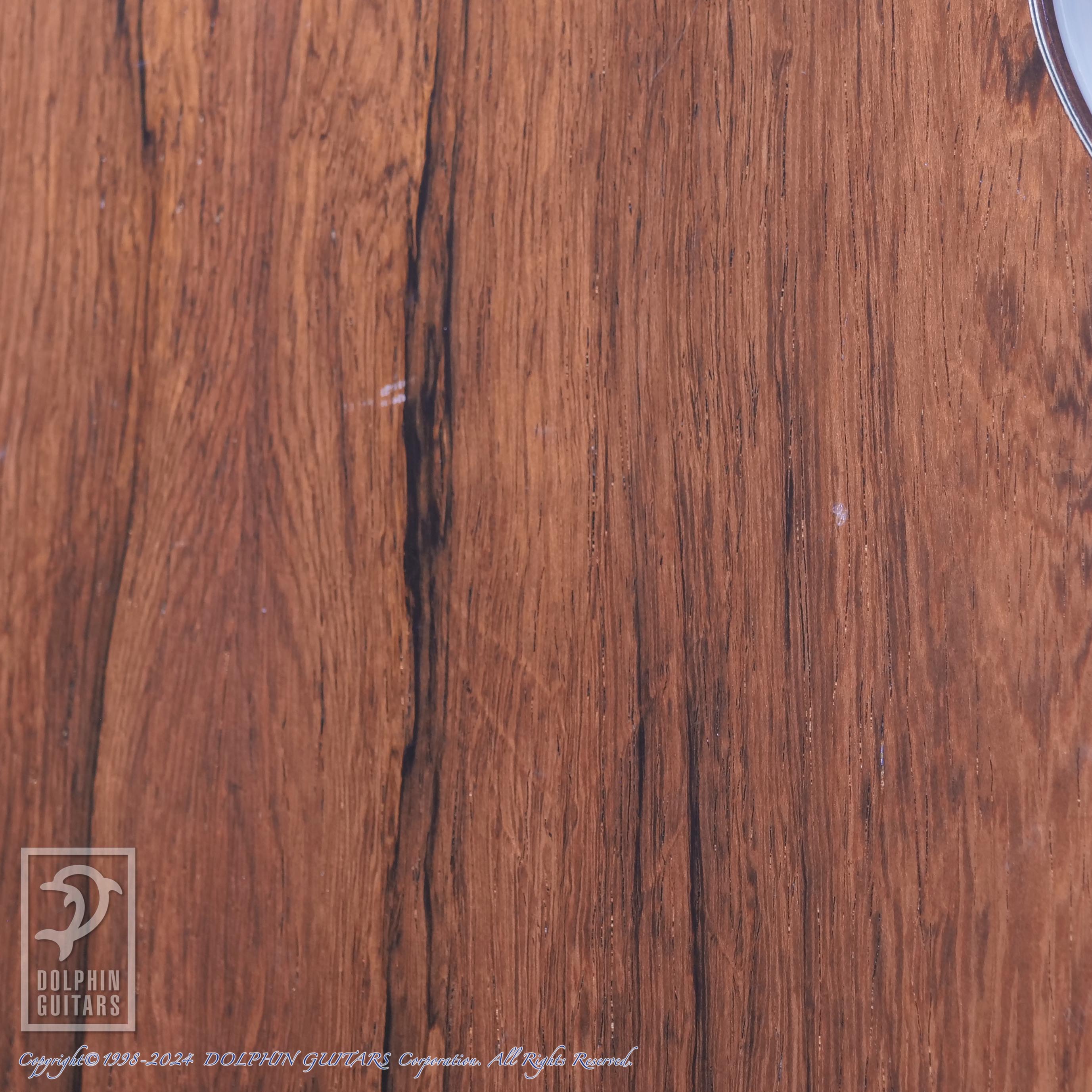 トップ全体に入ったベアクロウ杢は経年とともに絶妙に馴染んでおり、ムーンスプルースを黄金色に輝かせ、とても上品かつエキゾチックな印象を与えます。ムーンウッドとは、月の引力が弱まる新月の夜に、含水率の低い状態で伐採された木材で、経年での狂いにも強く、音響特性にも優れた伝統的な伐採方法です。神秘的なストーリーも素敵ですね。サイドバックのマダガスカル・ローズウッドも近年稀に見るほどの上質な杢目。木材フェチの方はこの外観ですでにノックアウトしてしまいそうなほどのマテリアル。