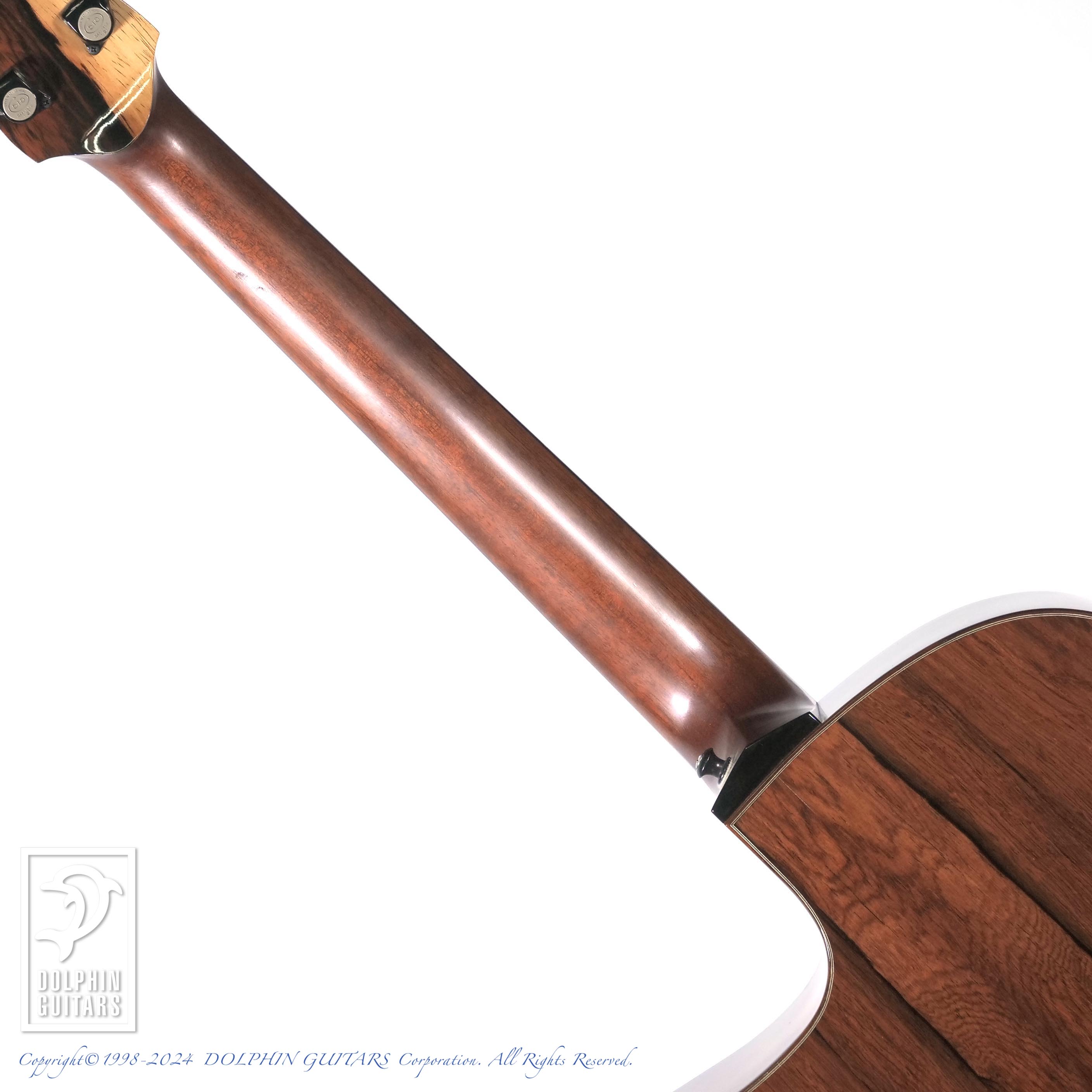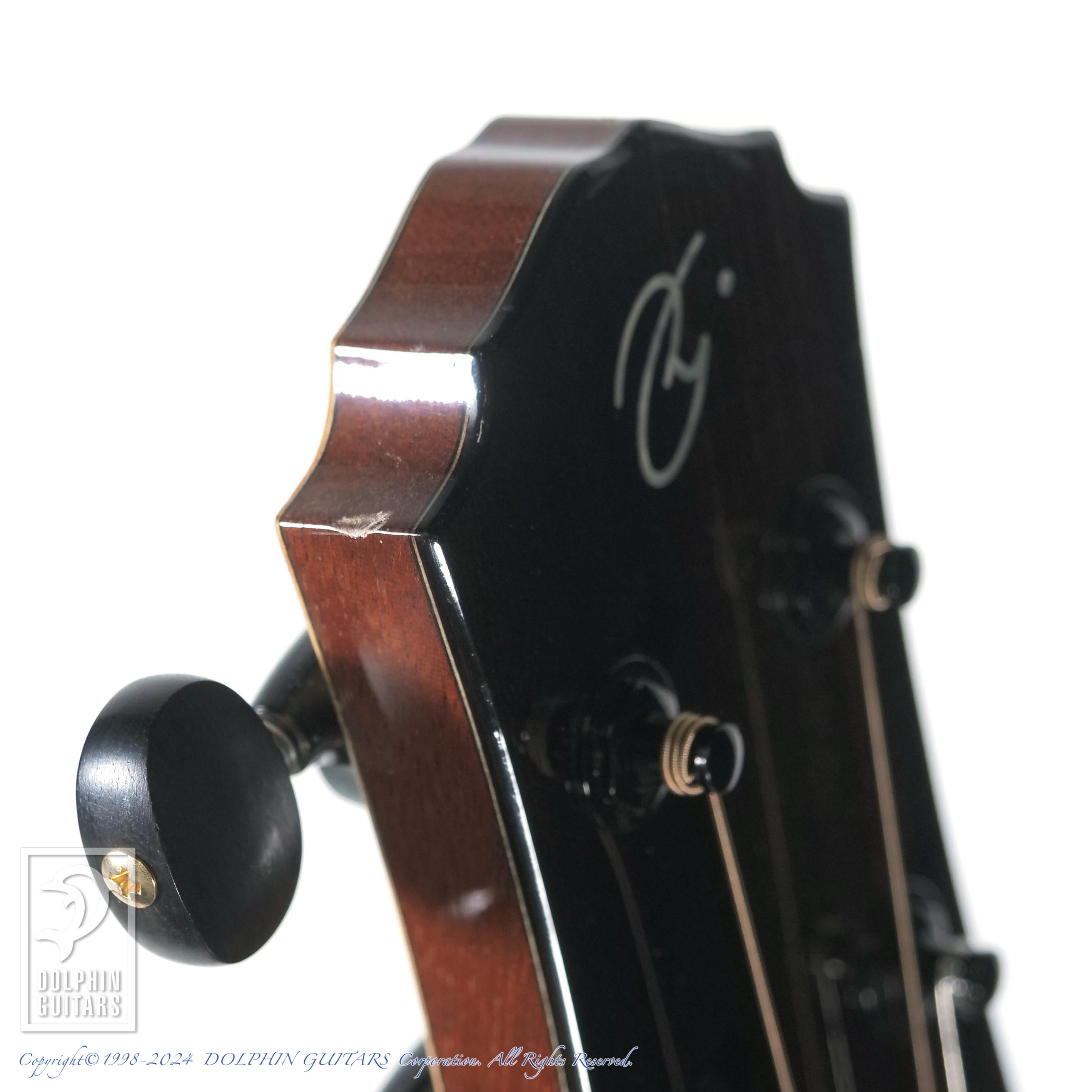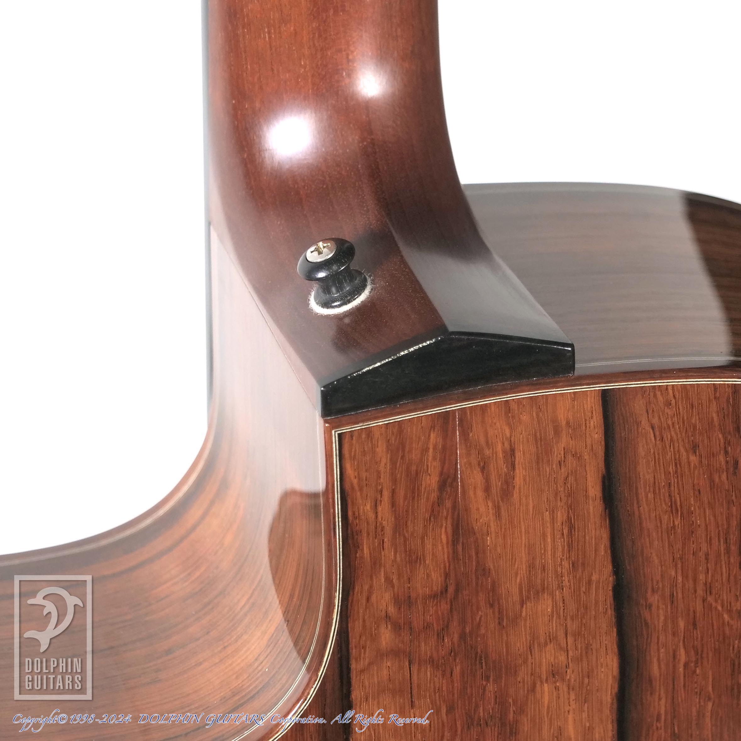 トップ全体に入ったベアクロウ杢は経年とともに絶妙に馴染んでおり、ムーンスプルースを黄金色に輝かせ、とても上品かつエキゾチックな印象を与えます。ムーンウッドとは、月の引力が弱まる新月の夜に、含水率の低い状態で伐採された木材で、経年での狂いにも強く、音響特性にも優れた伝統的な伐採方法です。神秘的なストーリーも素敵ですね。サイドバックのマダガスカル・ローズウッドも近年稀に見るほどの上質な杢目。木材フェチの方はこの外観ですでにノックアウトしてしまいそうなほどのマテリアル。