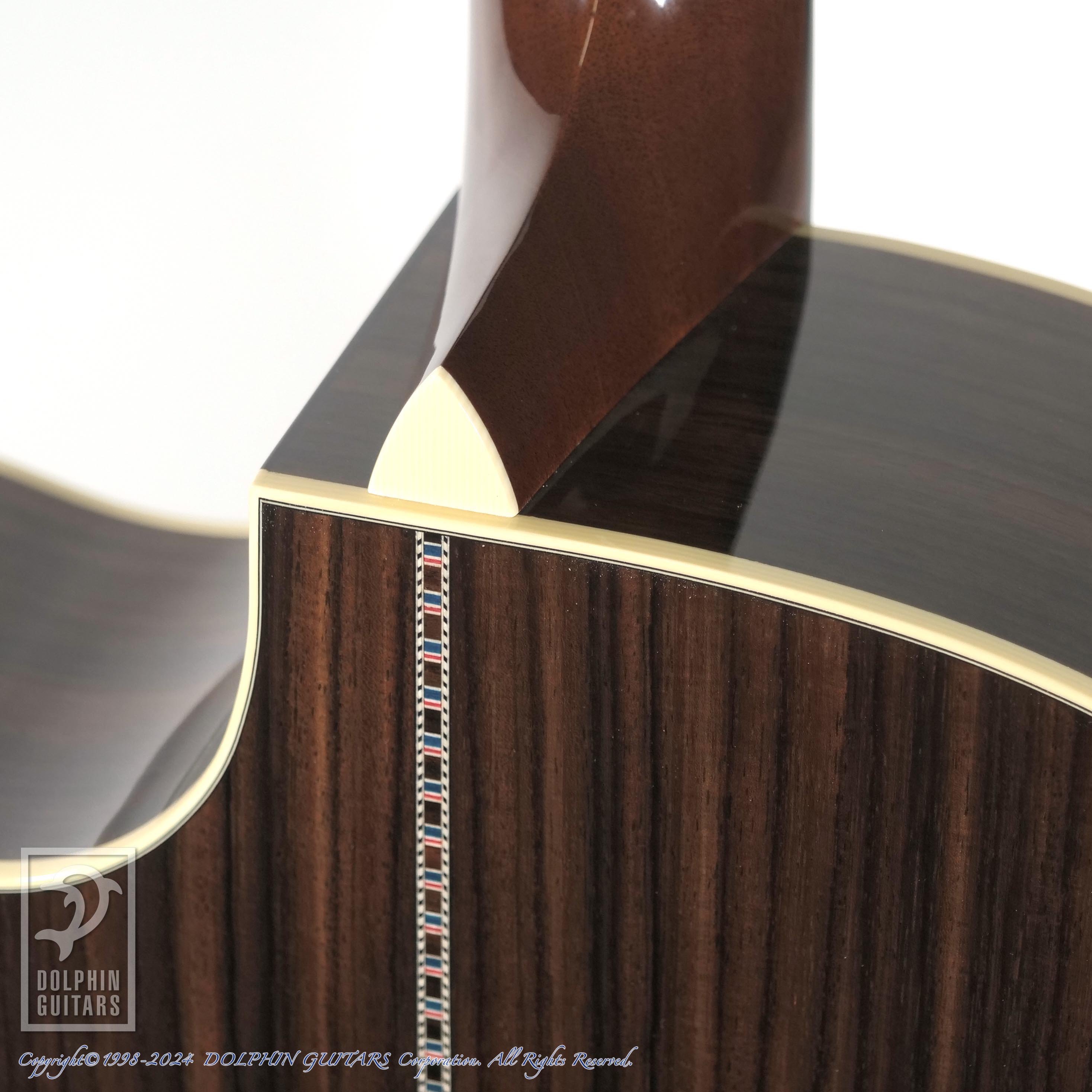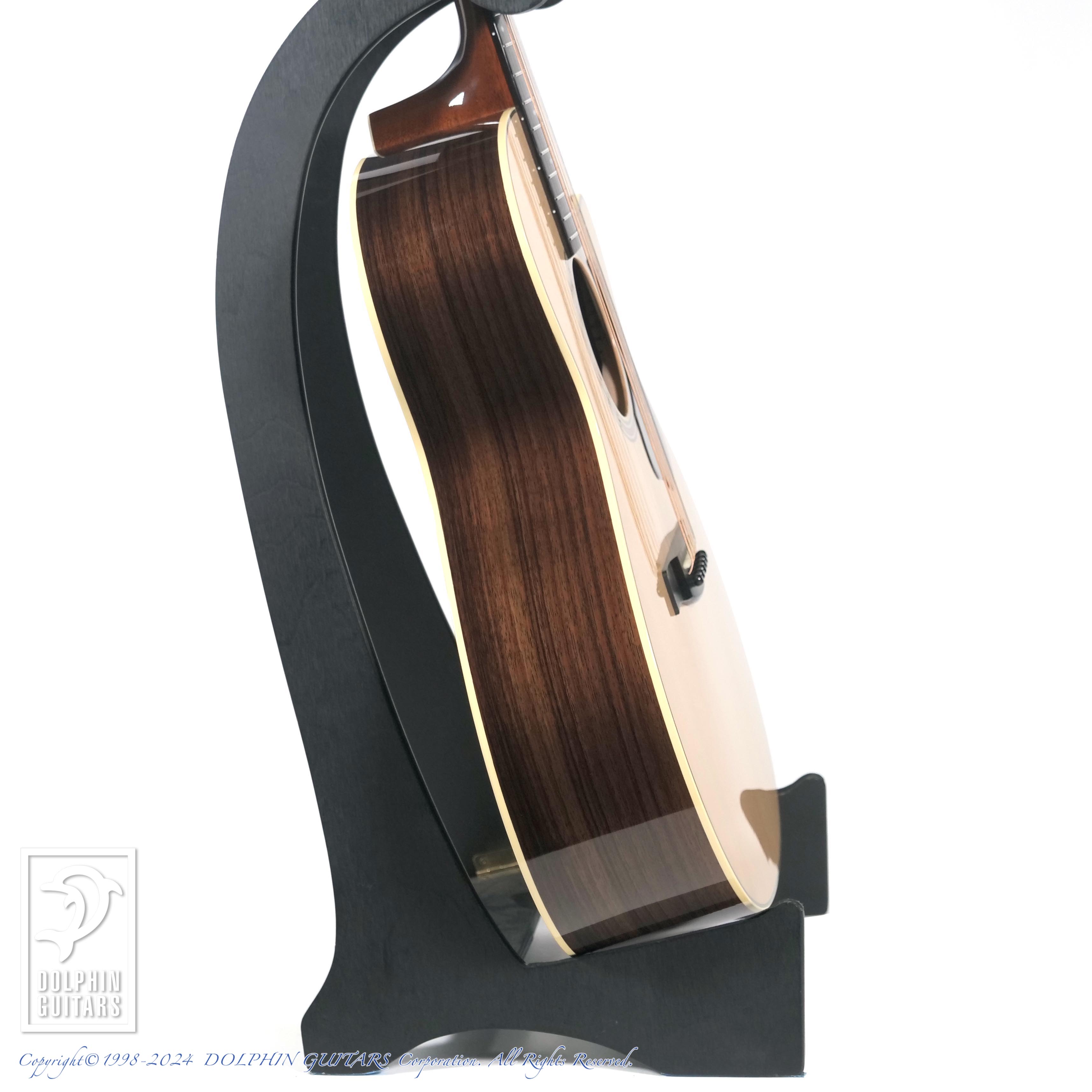 ローアクションのセッティングかつ、ソフトタッチでも十分な音圧を得られるように設計されており、抜群の操作性能を誇ります。全体的にやや甘いトーンが心地よく、その中にキラリと感じるスプルースの高音特性、インディアンローズの持つ低域の重量感もバランス良く混ざり合います。