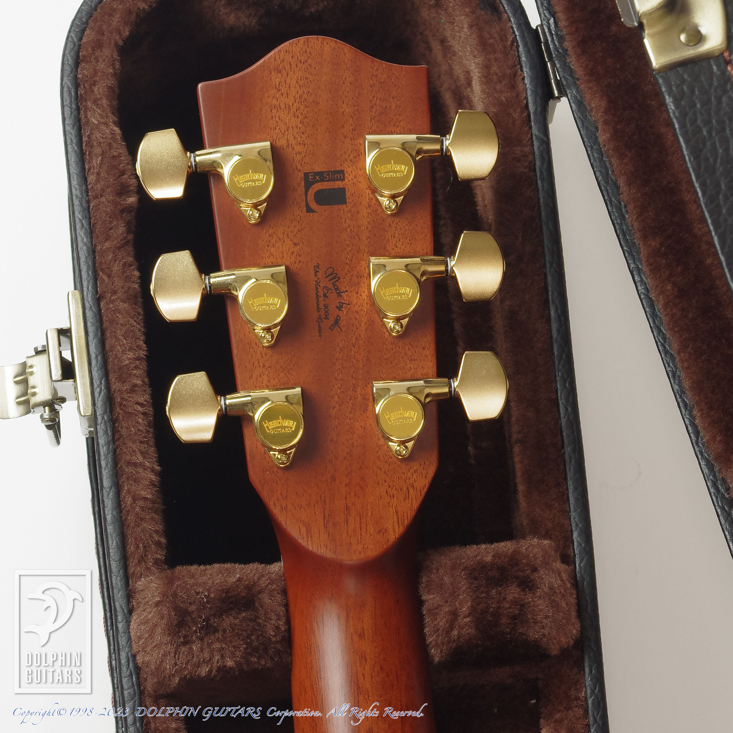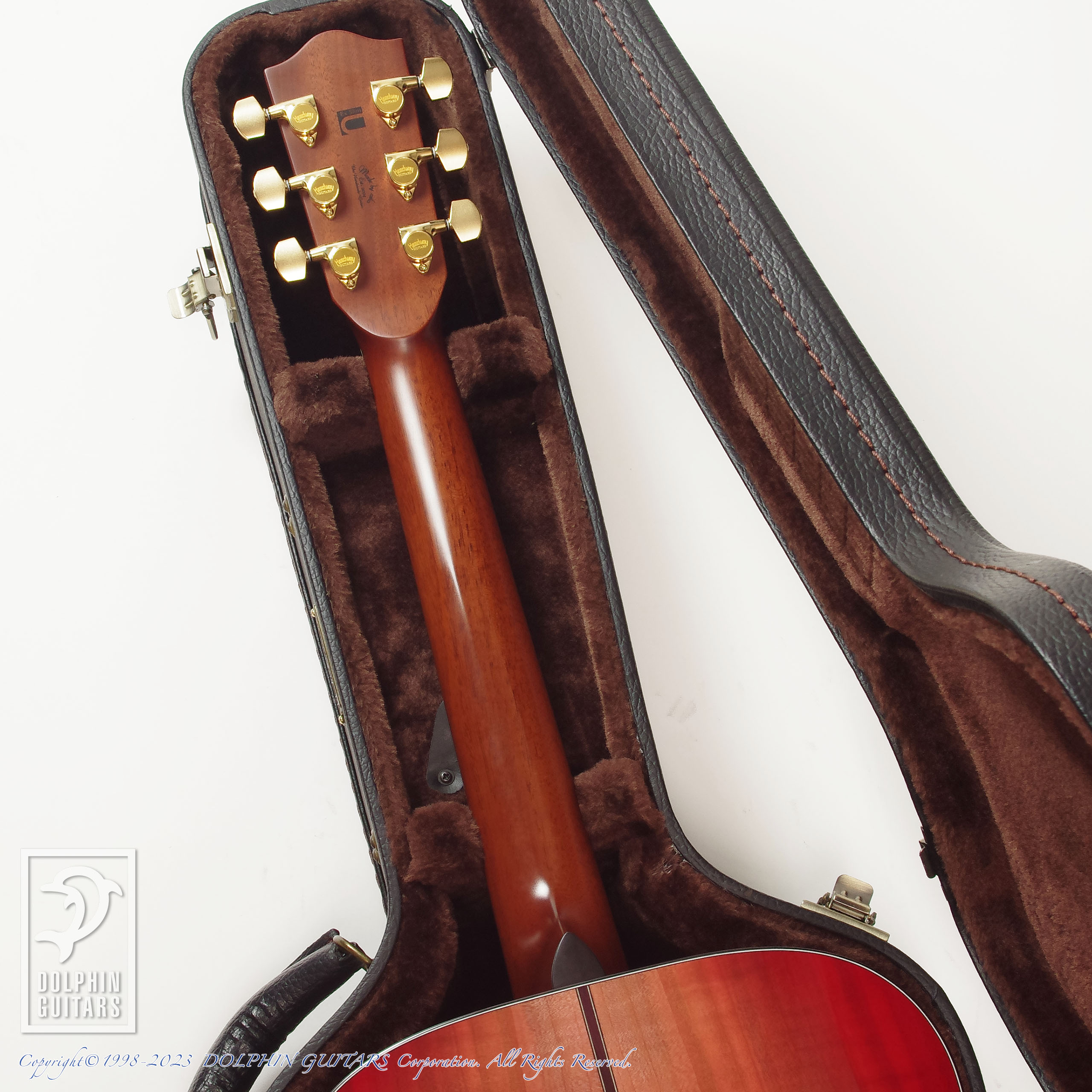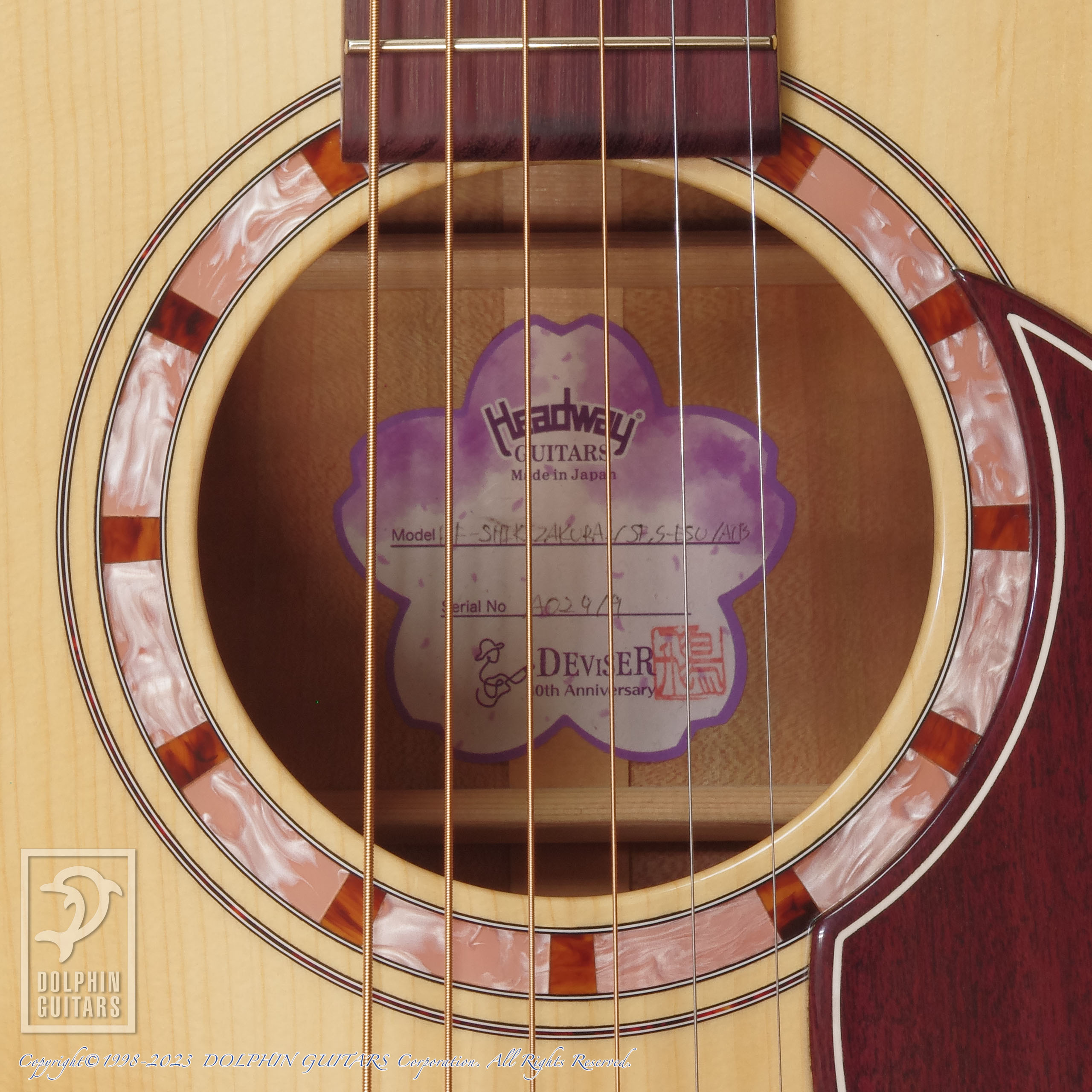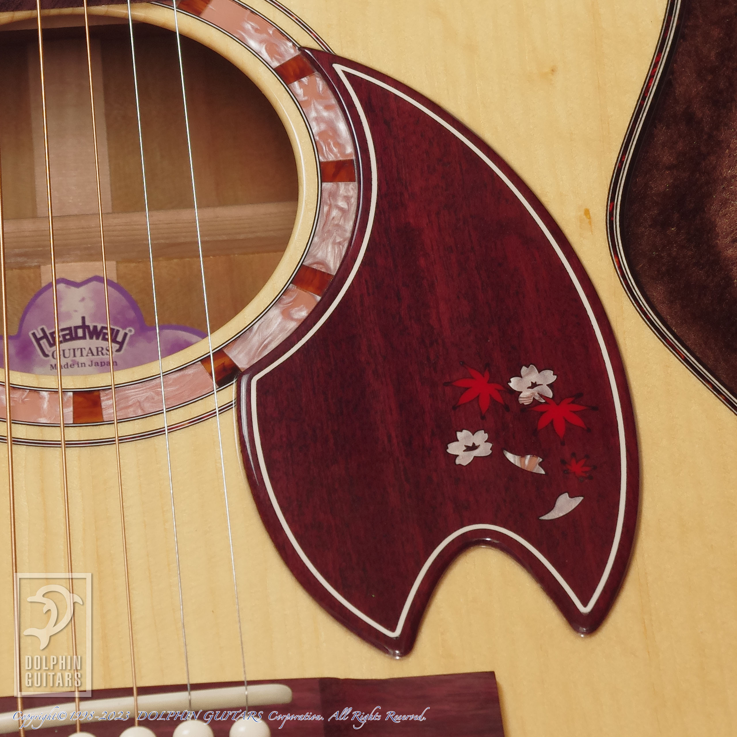 HFはトリプルオーサイズに628mmスケール仕様であり、現在 最も人気のサイズと言えます。サクラ材やインレイワークに目を奪われてしまいがちですが、トップ材にはアディロンダックスプルースを使用していることもポイントであり、ルックスのみならずサウンドメイクにも力を注いだモデルであります。