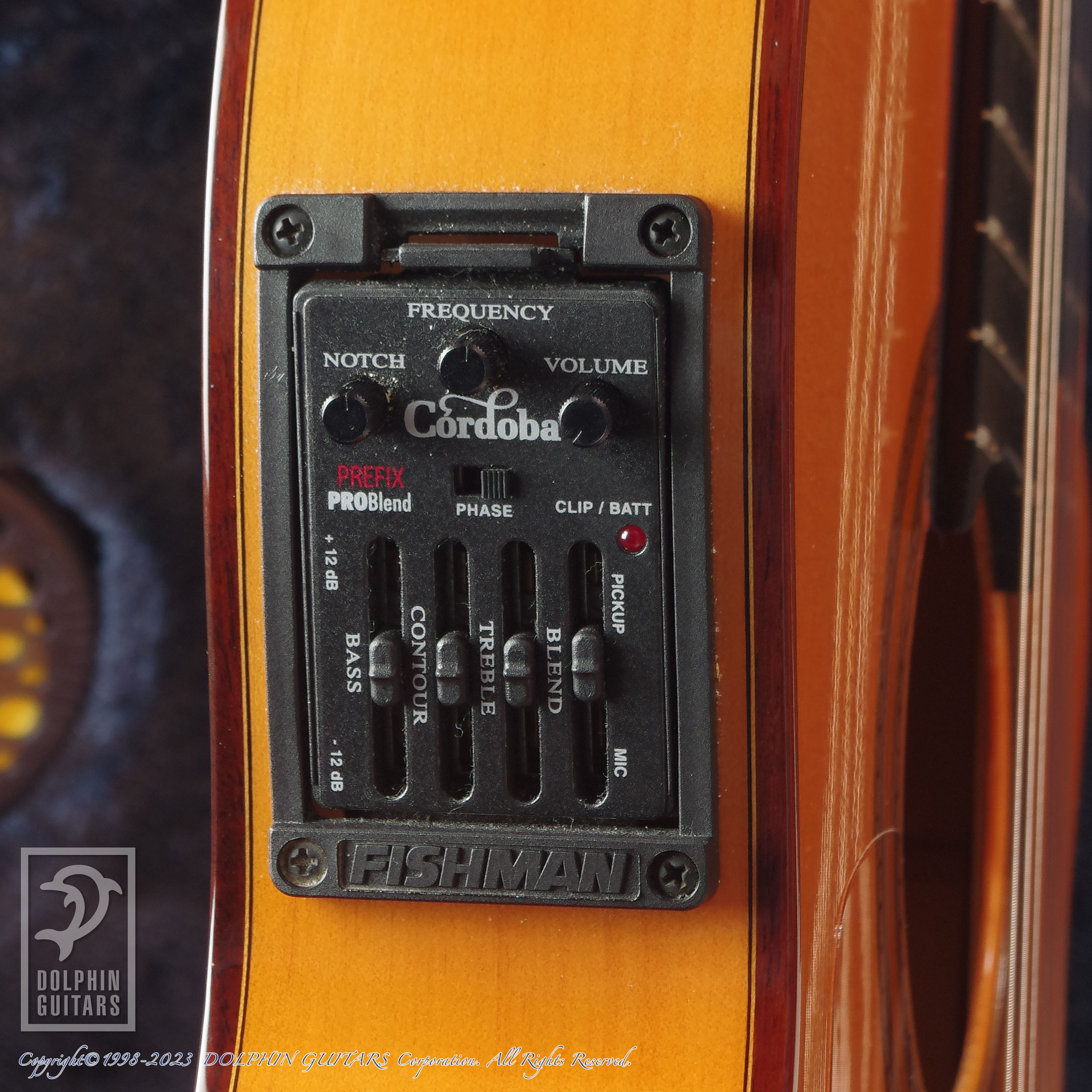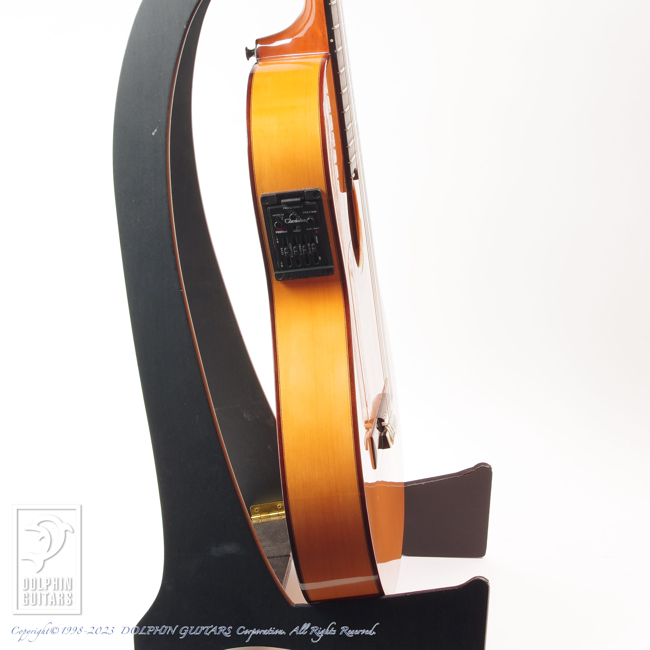 PUシステムにはFishman Prefix Pro Blendが搭載されており、アンダーサドルPUとコンデンサーマイクをブレンドする事でリアルなアコースティックサウンドをアウトプットします。取り回しの良い薄胴仕様はアンチフィードバックとしても効果的で、PUサウンドも妥協のないサウンドメイクが可能。ライブシーンで使用するナイロン弦ギターとしては間違いないでしょう。