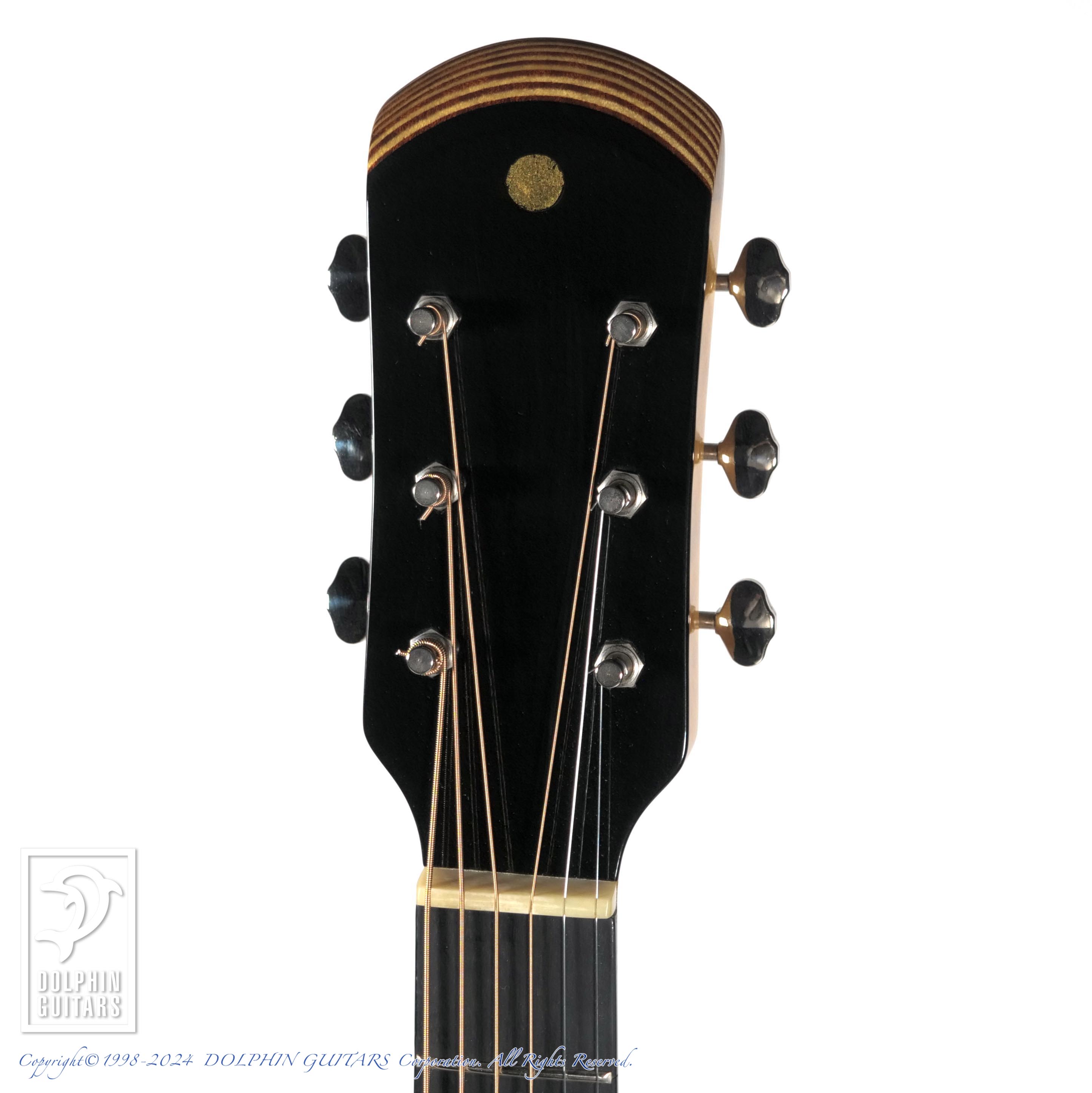 シダートップと厳選されたインディアンローズウッドのボディにネックは、フィンランド産のアスペン(ポプラ)を使用、赤いトップにヘッドやサイドマーク、ロゼッタに入れられた金箔などなど、斬新なデティールが目を惹く一本です。