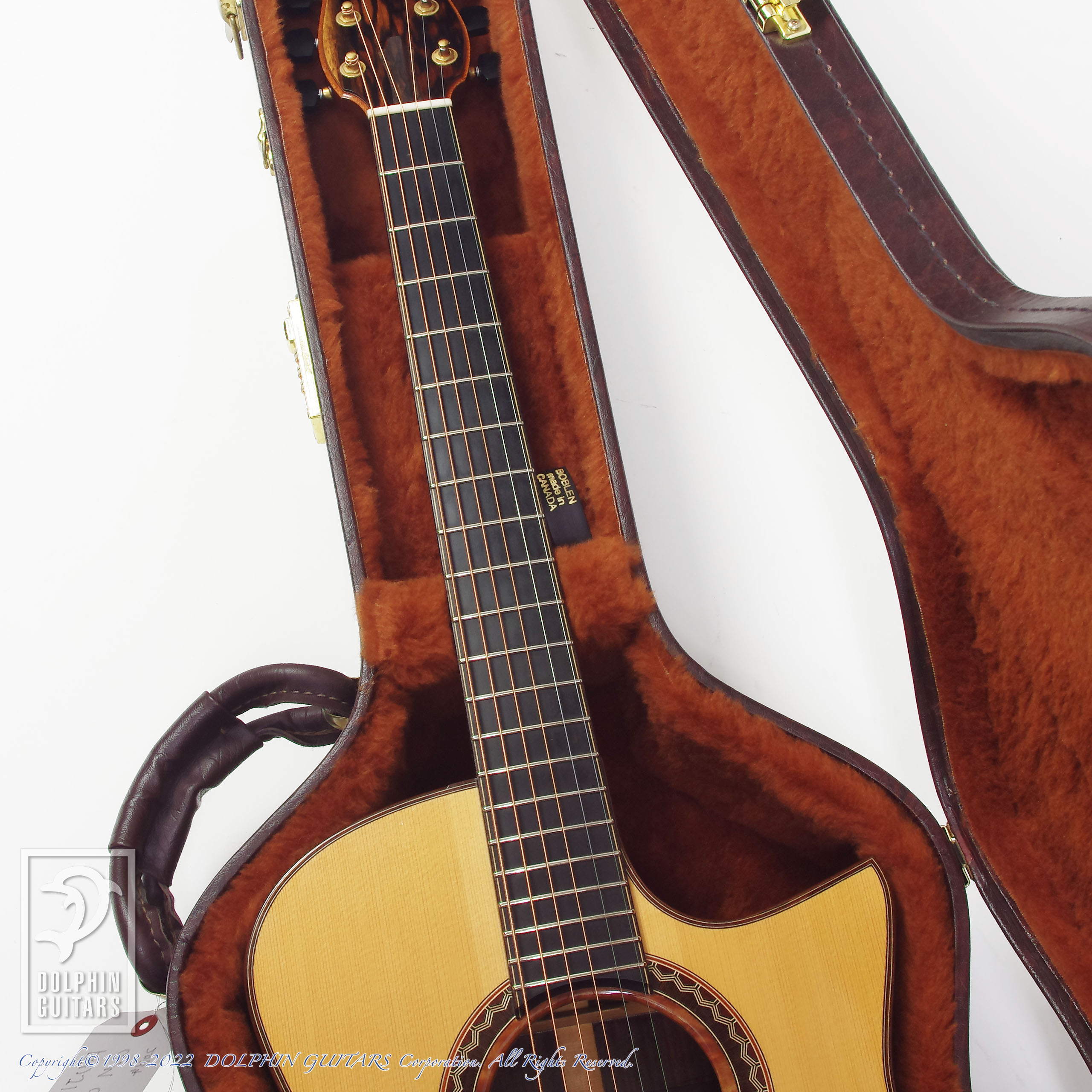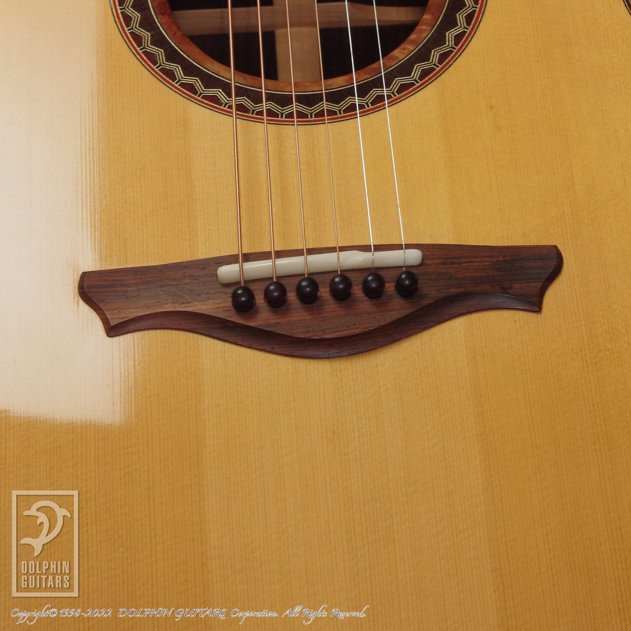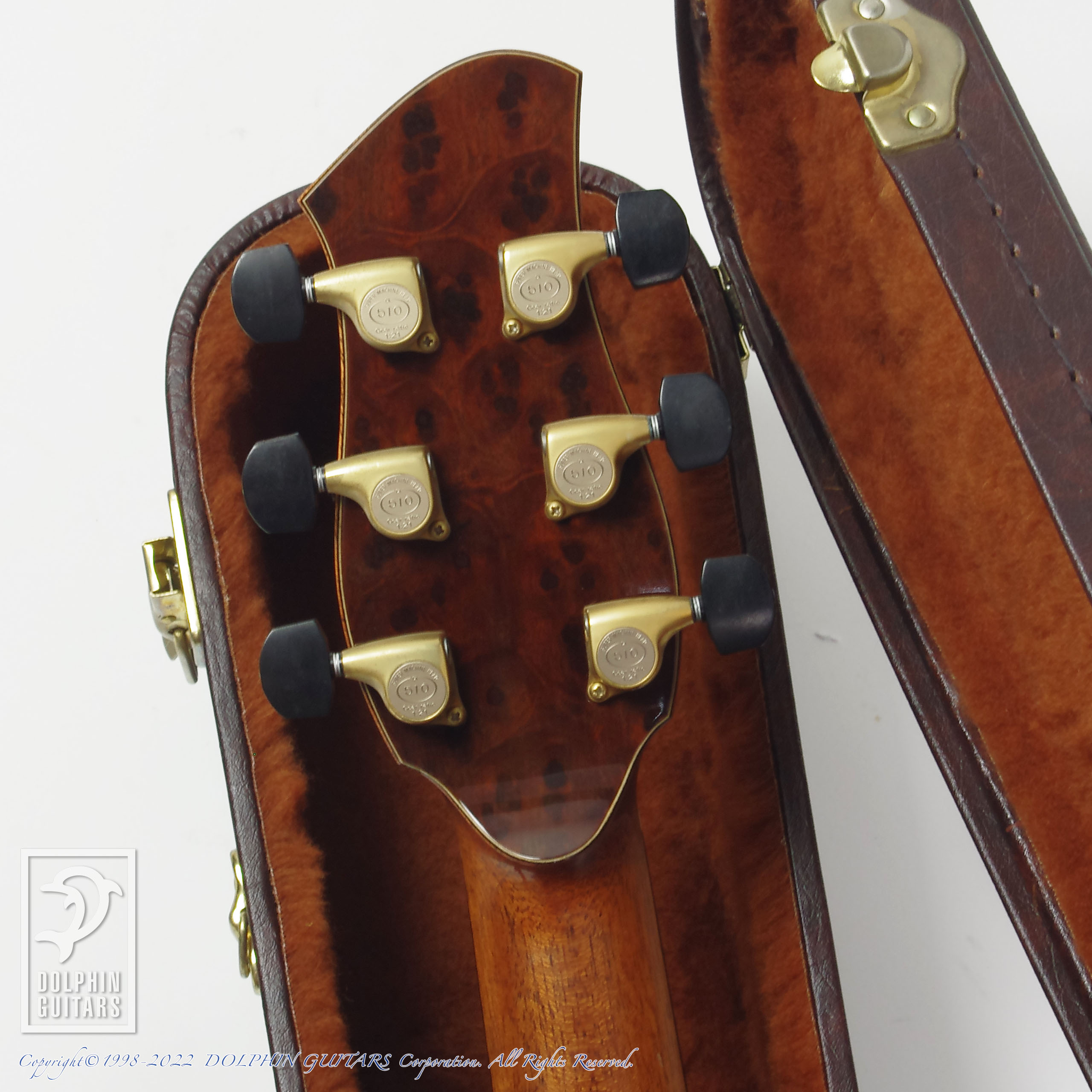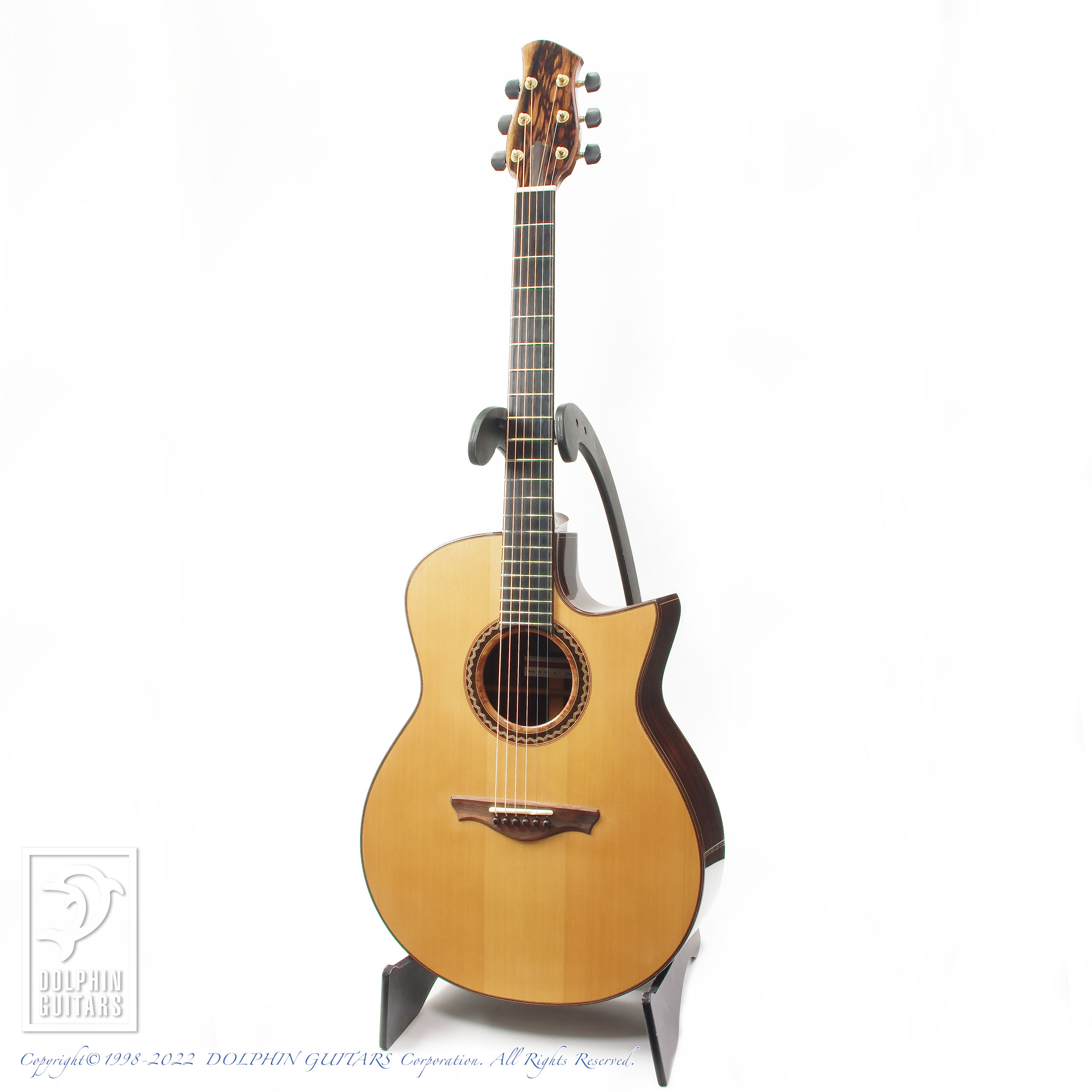 その他:44.5mmナット幅、645mmスケール、牛骨ナット・サドル、リブレスト(バックコンター)、フローレンタインカッタウェイ、ウッドロゼッタ(オリジナルデザイン)