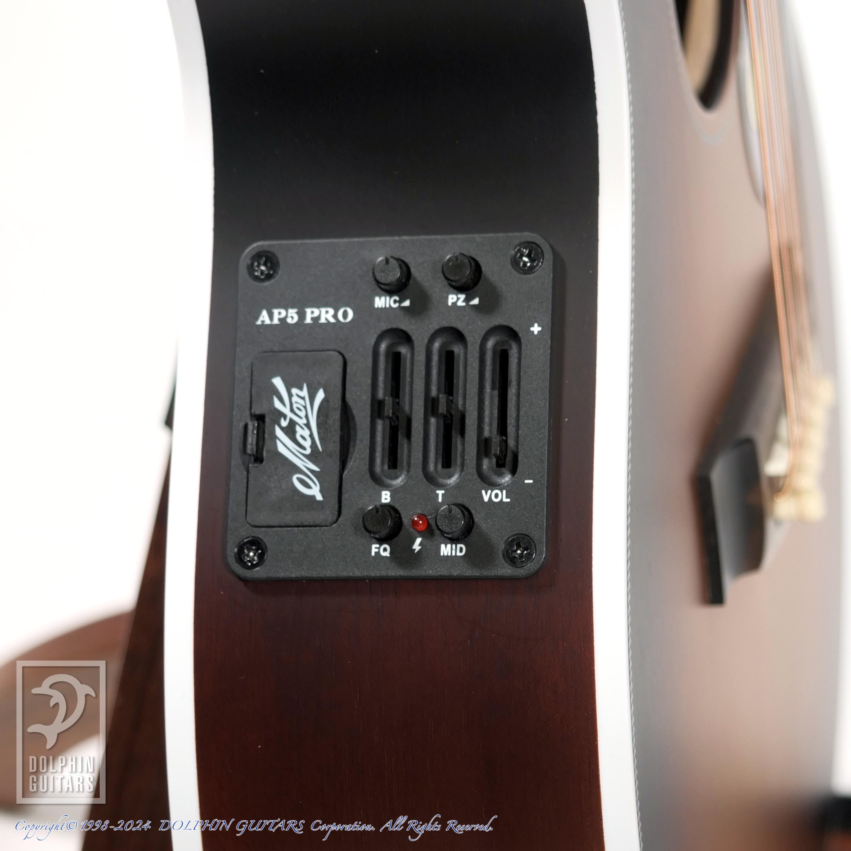 搭載されたAP5pro PUシステムは、オリジナルのアンダーサドルPUにコンデンサーマイクを併用する事により、奥行きのある音域と抜群なエアー感に加え、ボディーヒット音も余すことなくアウトプットします。また、高い出力を持つプリアンプを内蔵しておりますので、外部プリアンプ等を使用せずとも、そのままプラグインしていただければ極上のサウンドをお楽しみいただけます。PUとマイクVolは完全に独立しており、手元での出力バランス調整が可能ですのでお好みや現場に合わせてご使用下さい。
