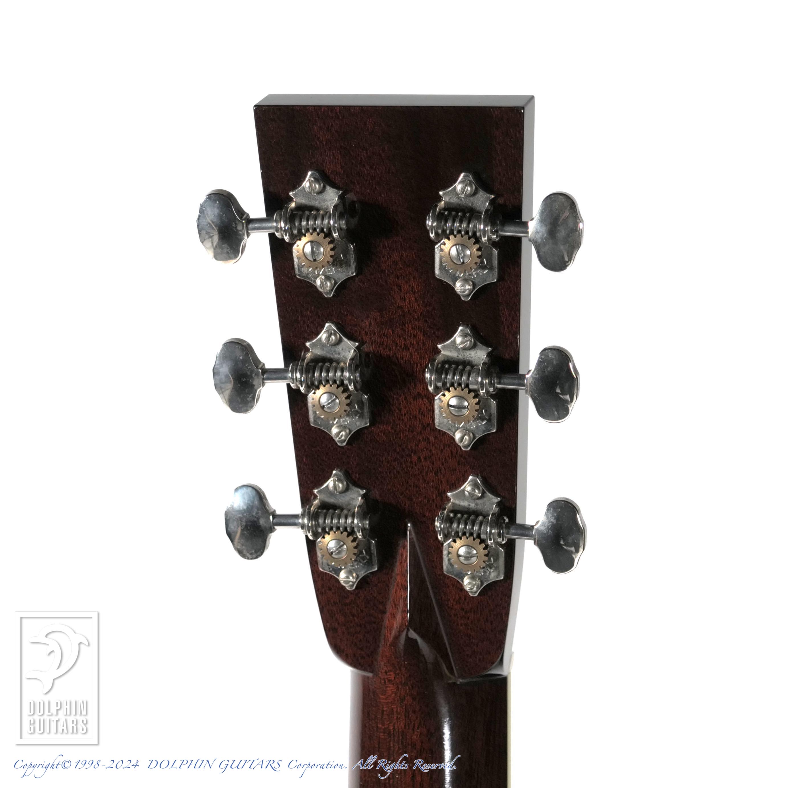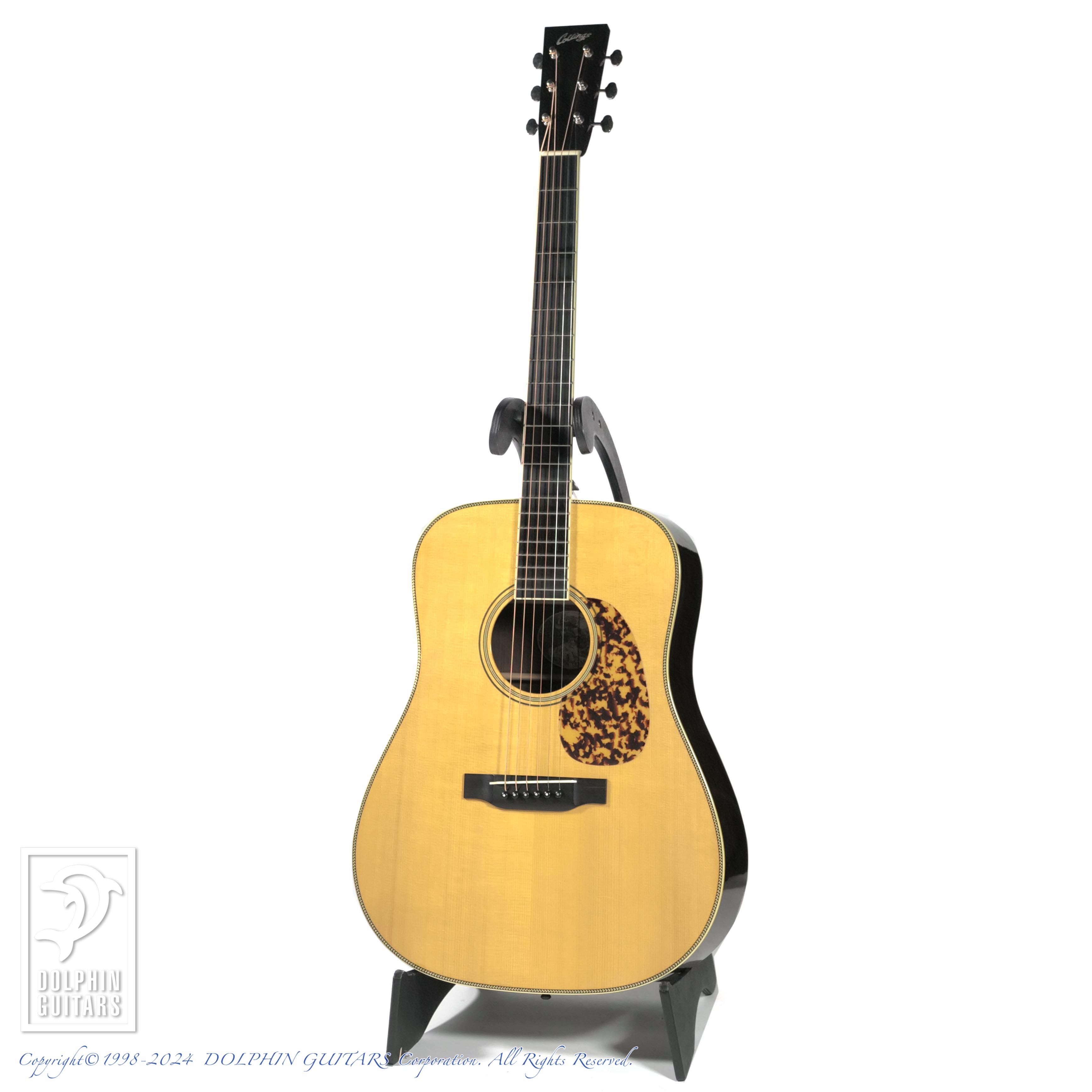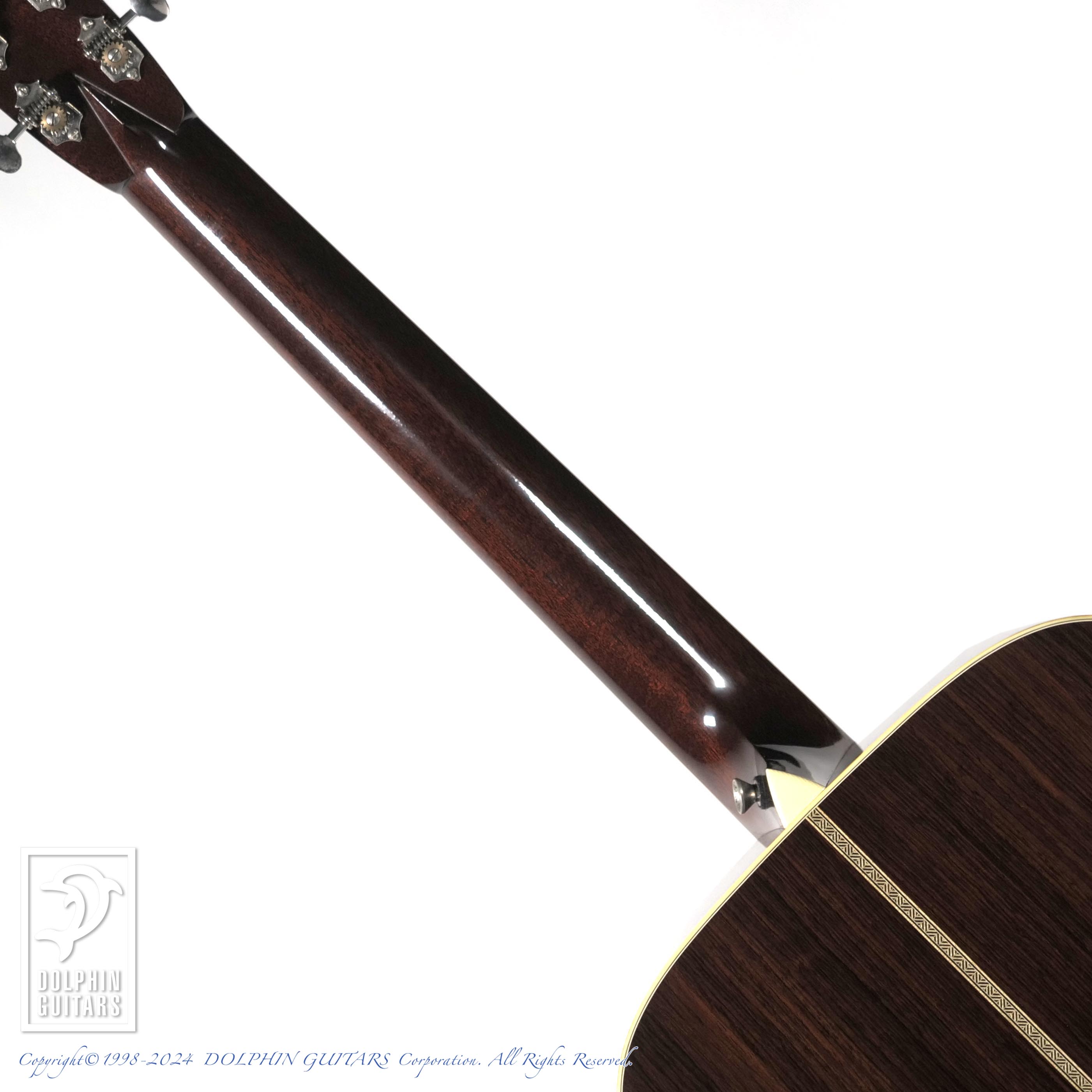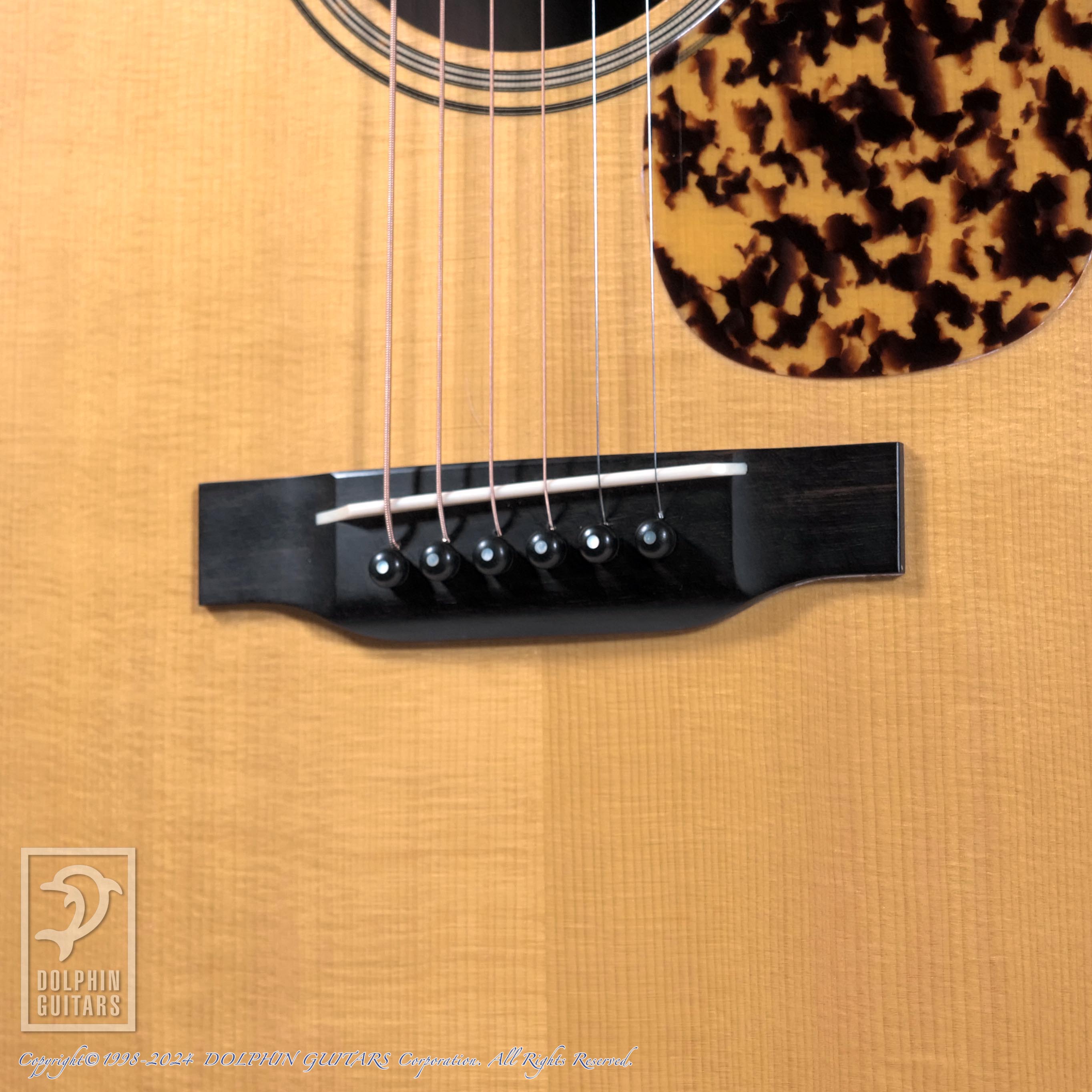ラージホールモデルは古くは、クラレンスホワイト、そしてトニーライス に引き継がれ、個性的なルックスという事もあり、各ブランドがレプリカモデルを発表しました。CWのサウンドホール直径は105mm、レギュラーモデルは100mm。これによりサウンドの広がりが異なる点も非常に興味深い点です。アディロンダックスプルース&ハカランダボディ、さらにノンタングブレイシングの組み合わせにより生み出される圧倒的な音圧、音量は他のモデルの追随を許しません。すべての音域が開放されるかのようなサウンドを持ち、湧き上がる重厚な低音に、1・2弦は図太く伸びがあり、どのポジションを鳴らしてもストレスフリーです。これは上質な材料と工作精度の高さが成せる技でしょう。またナット幅は、スタンダードモデルと比較すると微妙にやや広く(43.7mm)、これによって安心感のあるネックフィーリングを生み出しております。