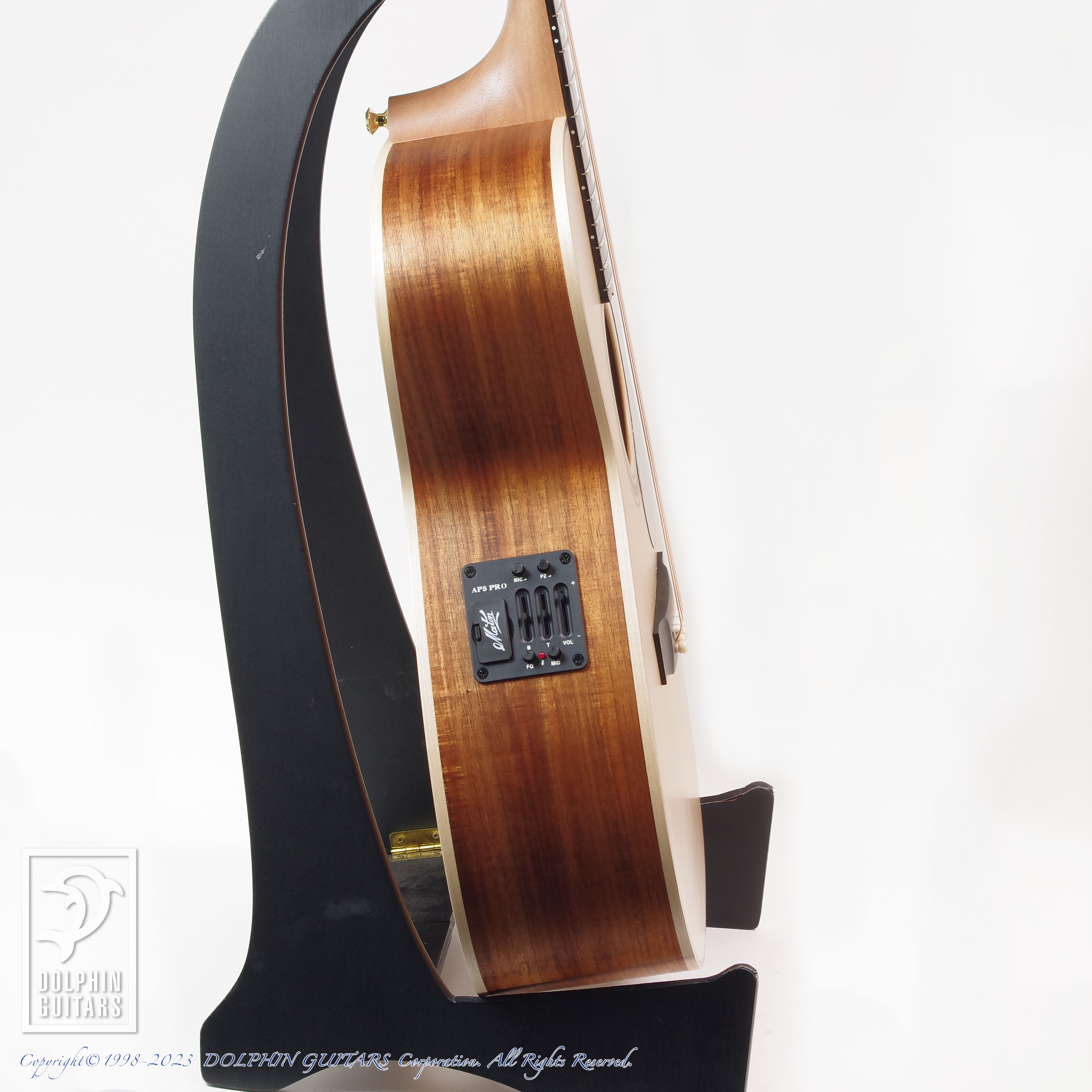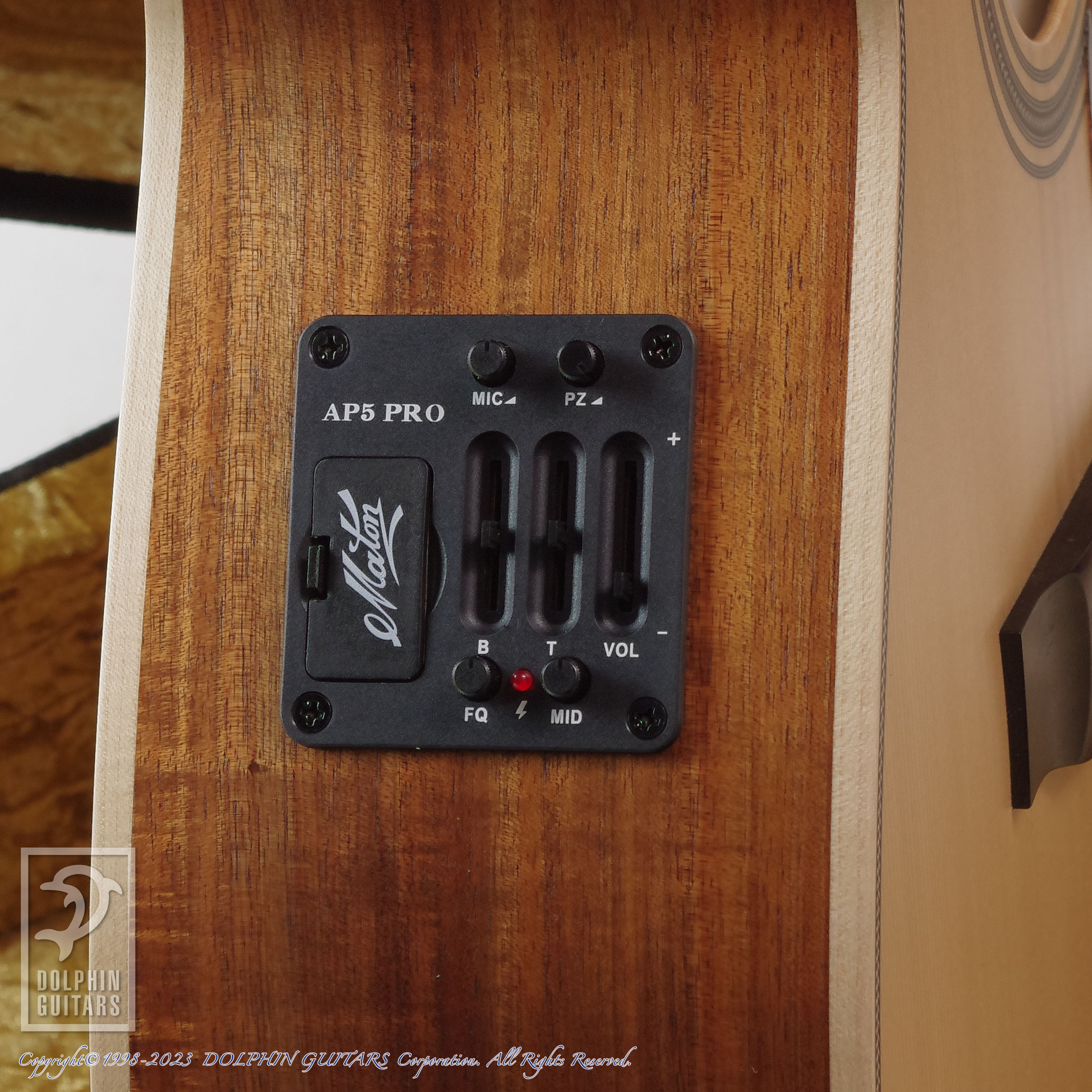 搭載されたAP5pro PUシステムは、オリジナルのアンダーサドルPUにコンデンサーマイクを併用する事により、奥行きのある音域と抜群なエアー感に加え、ボディーヒット音も余すことなくアウトプットします。また、高い出力を持つプリアンプを内蔵しておりますので、外部プリアンプ等を使用せずとも、そのままプラグインしていただければ極上のサウンドをお楽しみいただけます。PUとマイクVolは完全に独立しており、手元での出力バランス調整が可能ですのでお好みや現場に合わせてご使用下さい。