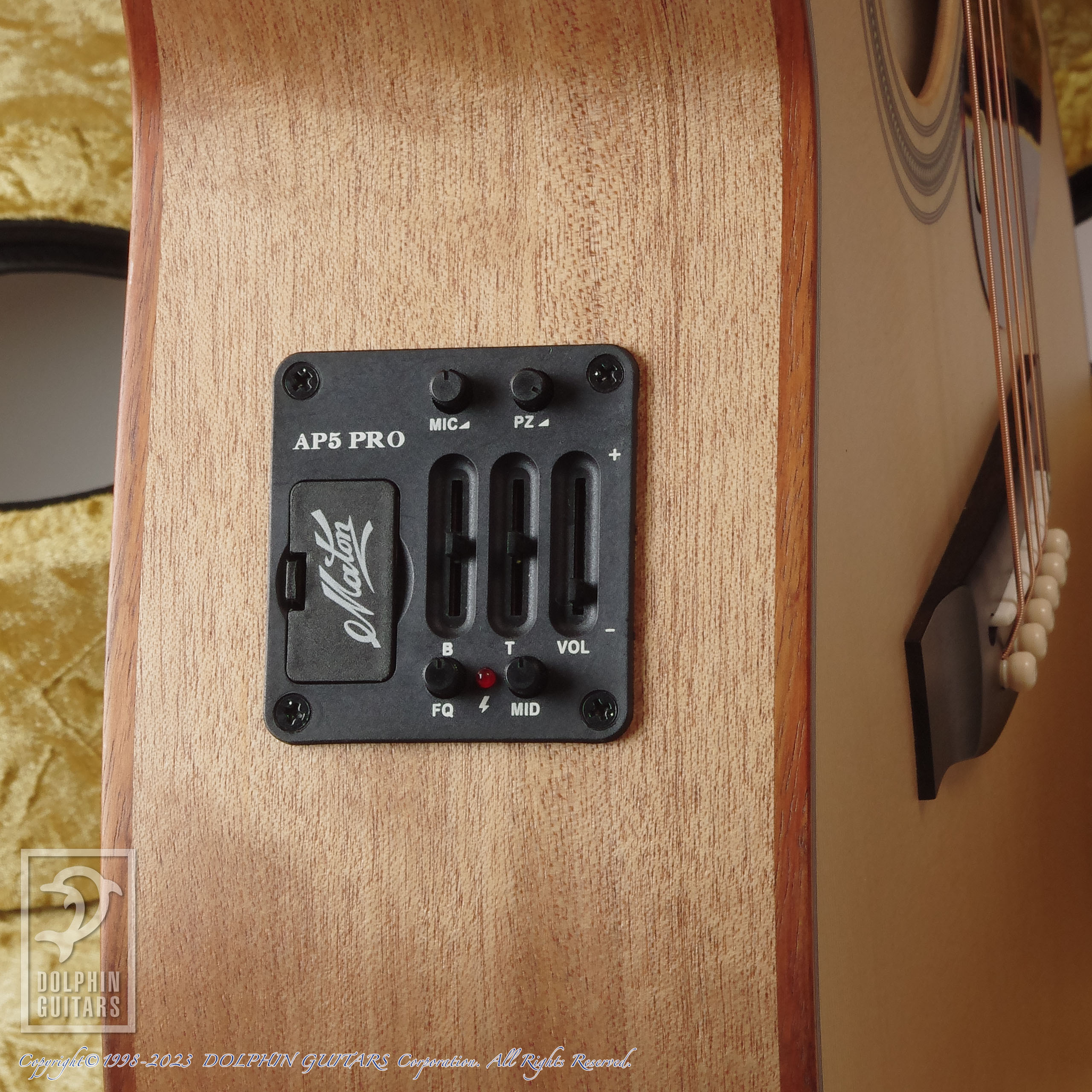 PUシステムはメイトン社オリジナルのAP5-Pro。非常にクリアで透明感のあるマイクサウンドと力強いピエゾの存在感でどんな現場でもナチュラルなアコースティックサウンドをアウトプットできます。ピエゾPUゲインとマイクゲイン、マスターボリュームを装備し出力バランス調整もより精細にスムーズに行うことが可能ですので、まさにプロフェッショナル仕様。