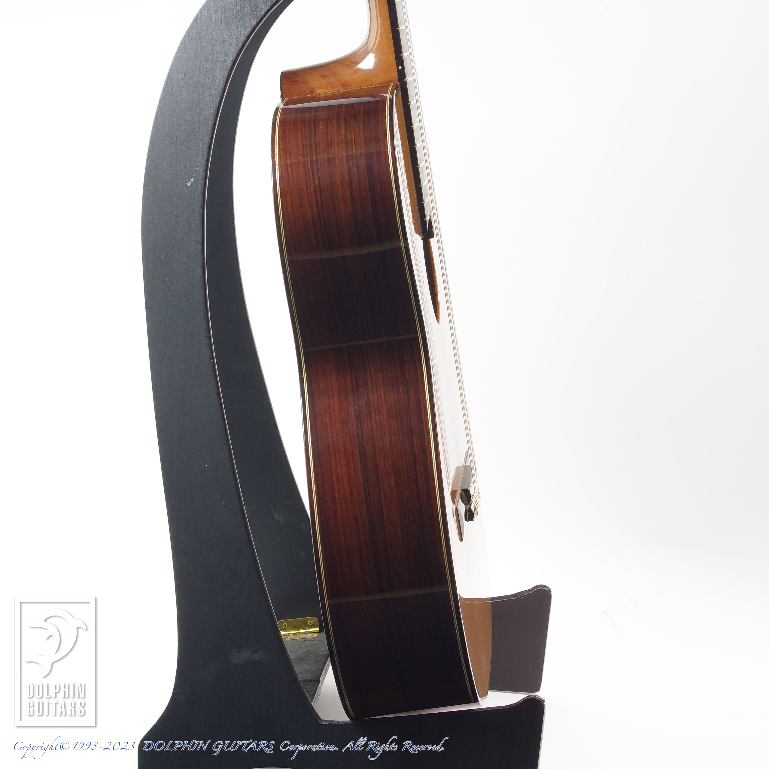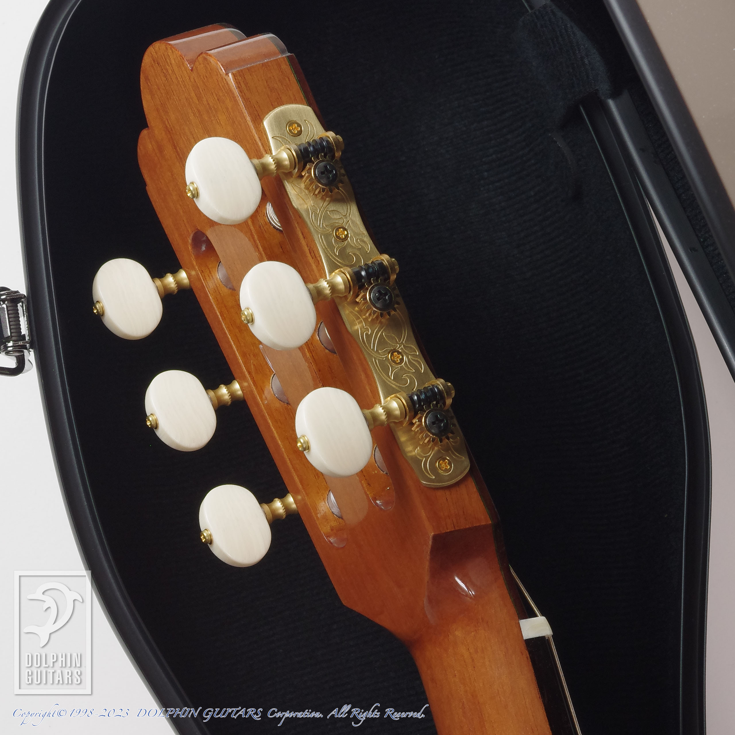 従来のナット幅は50mm仕様ですが、本器はショップカスタムとしまして特別仕様の48mmナット幅にて依頼しました。ネックシェイプは一般的なクラシックギターと同形であり、トラスロッドは入っておりませんが、ネックの強度面でも不安はありません。トラスロッド無しであるからこそ、このウッディなトーンであると言えます。