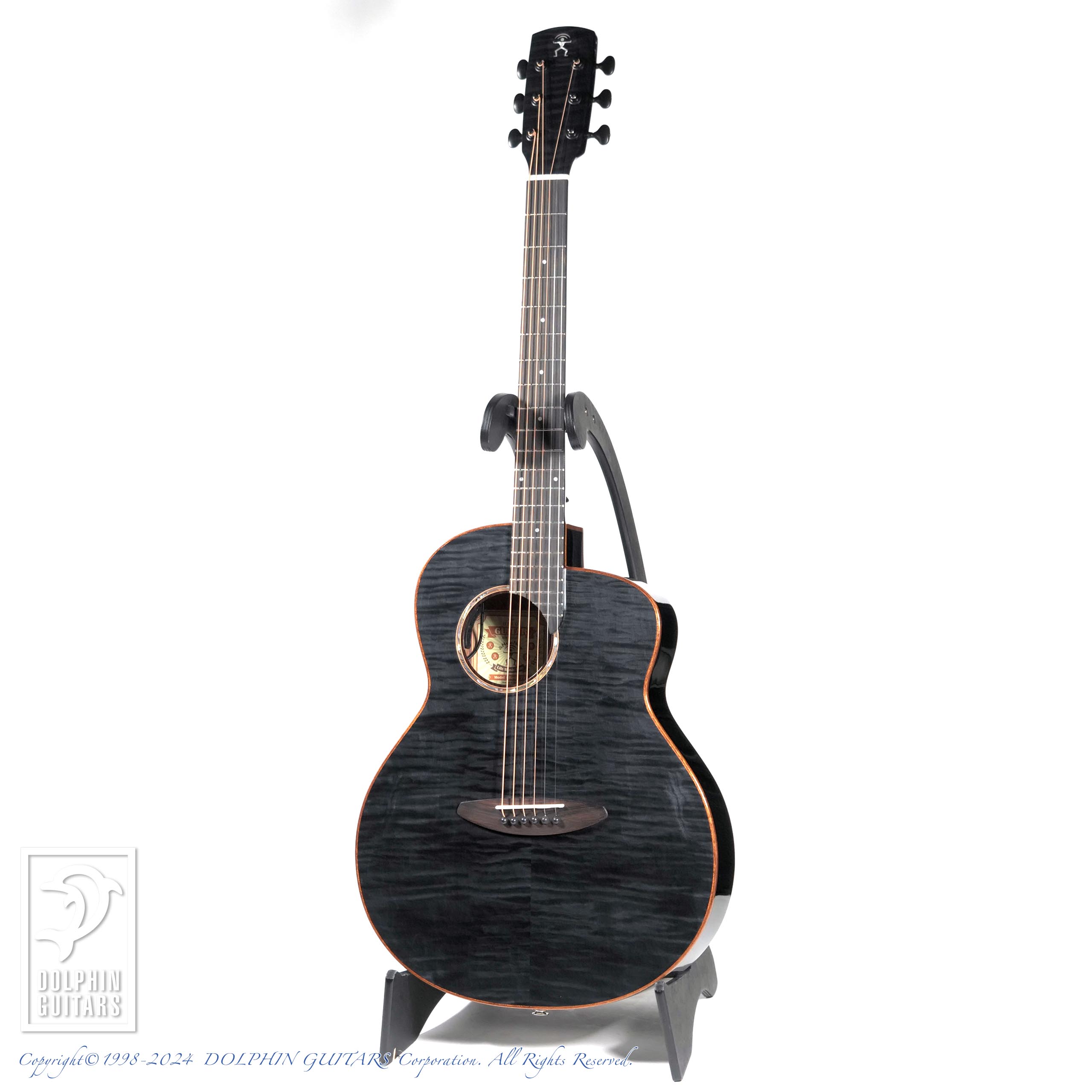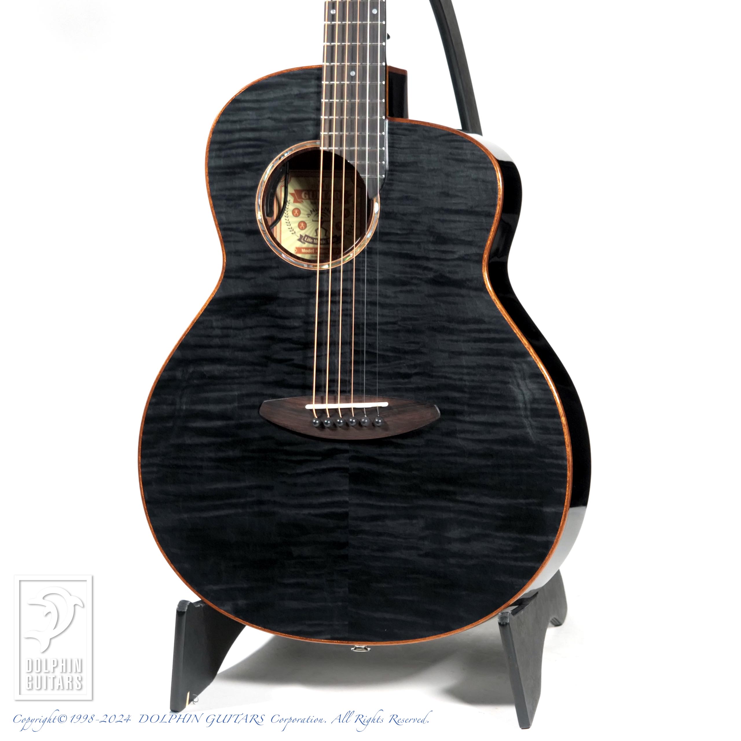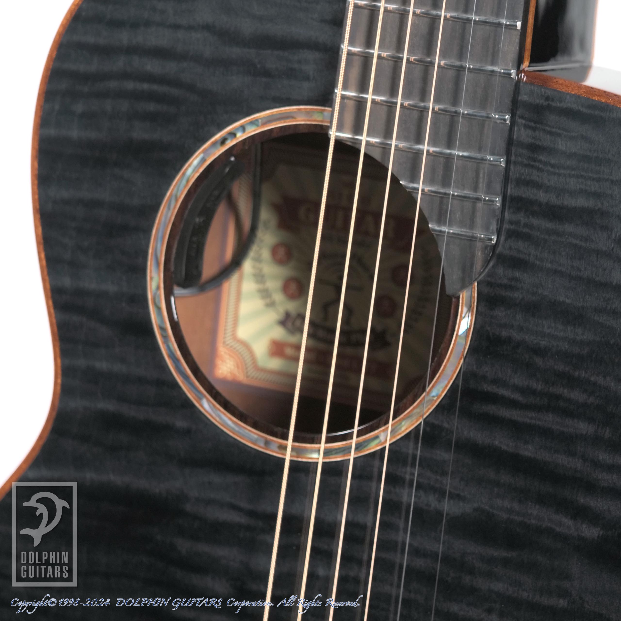 カーリーメイプルをセダー材の表面に配した美しいギター。シースルーブラック塗装により、杢目が浮かび上がるような幻想的な印象を与えます。サイド&バックはほのかにラメが輝く凝った仕様です。