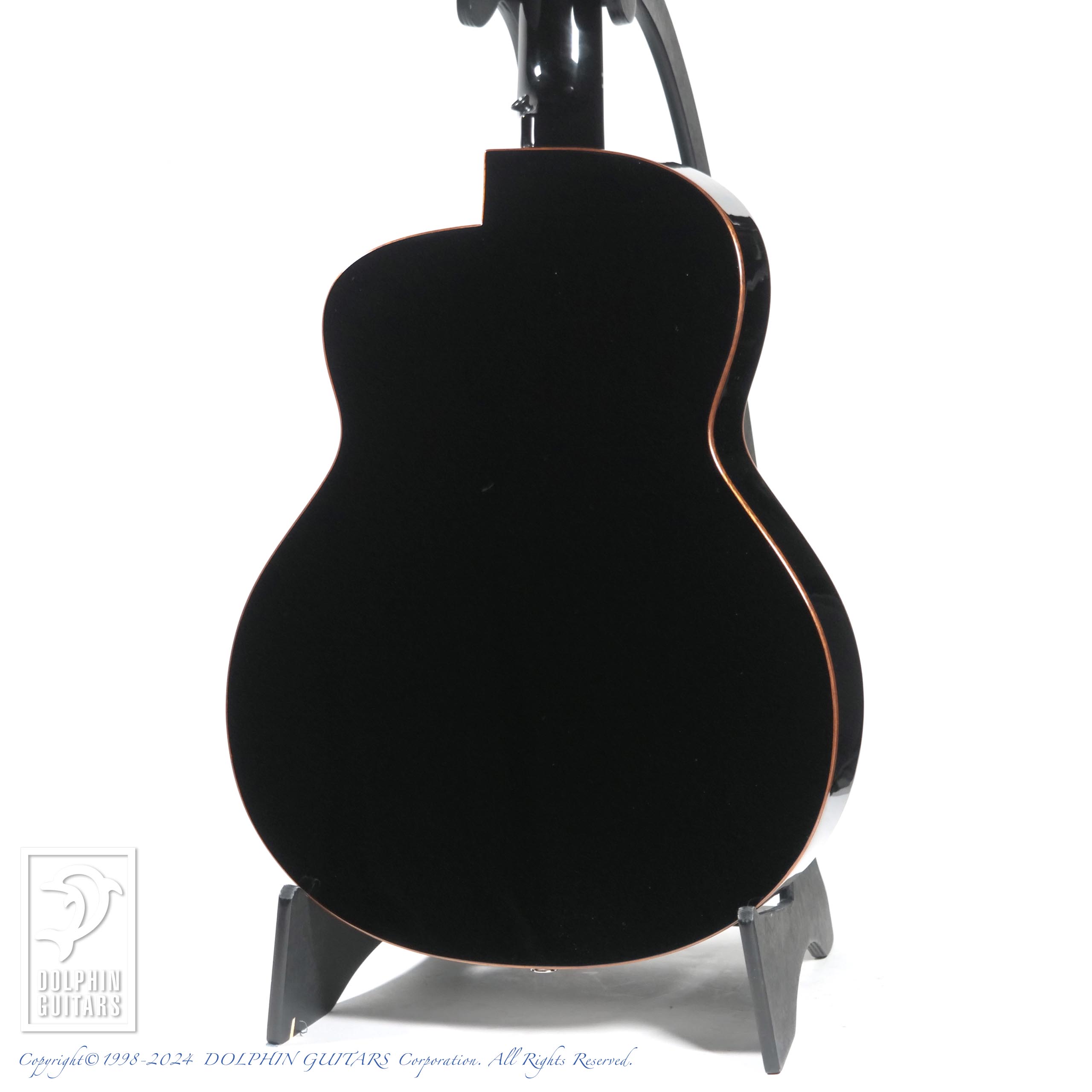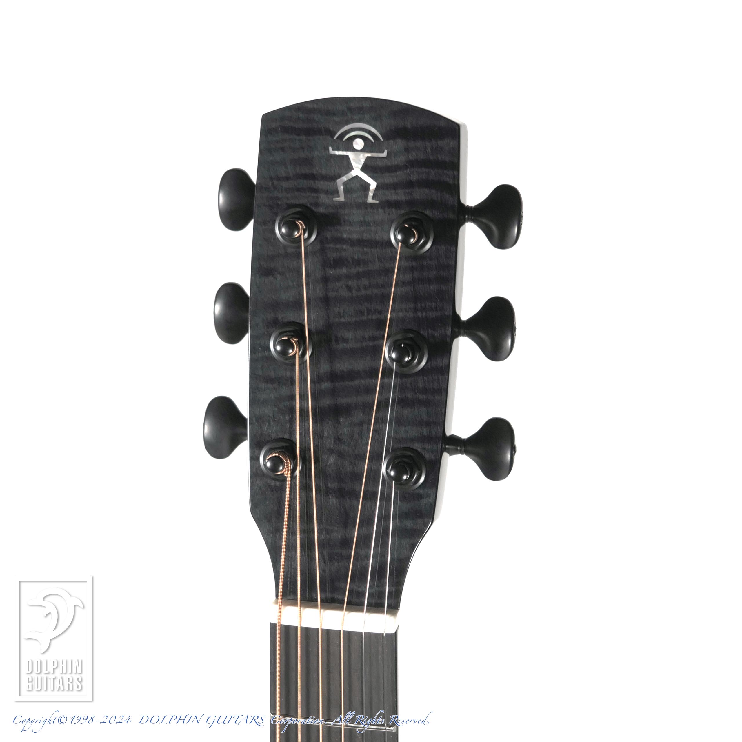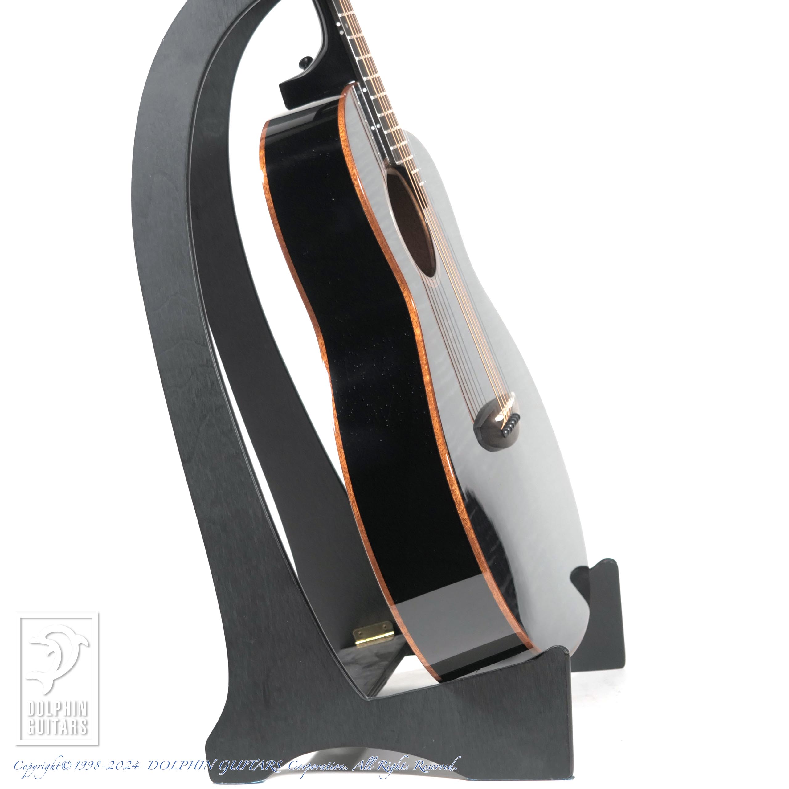 カーリーメイプルをセダー材の表面に配した美しいギター。シースルーブラック塗装により、杢目が浮かび上がるような幻想的な印象を与えます。サイド&バックはほのかにラメが輝く凝った仕様です。