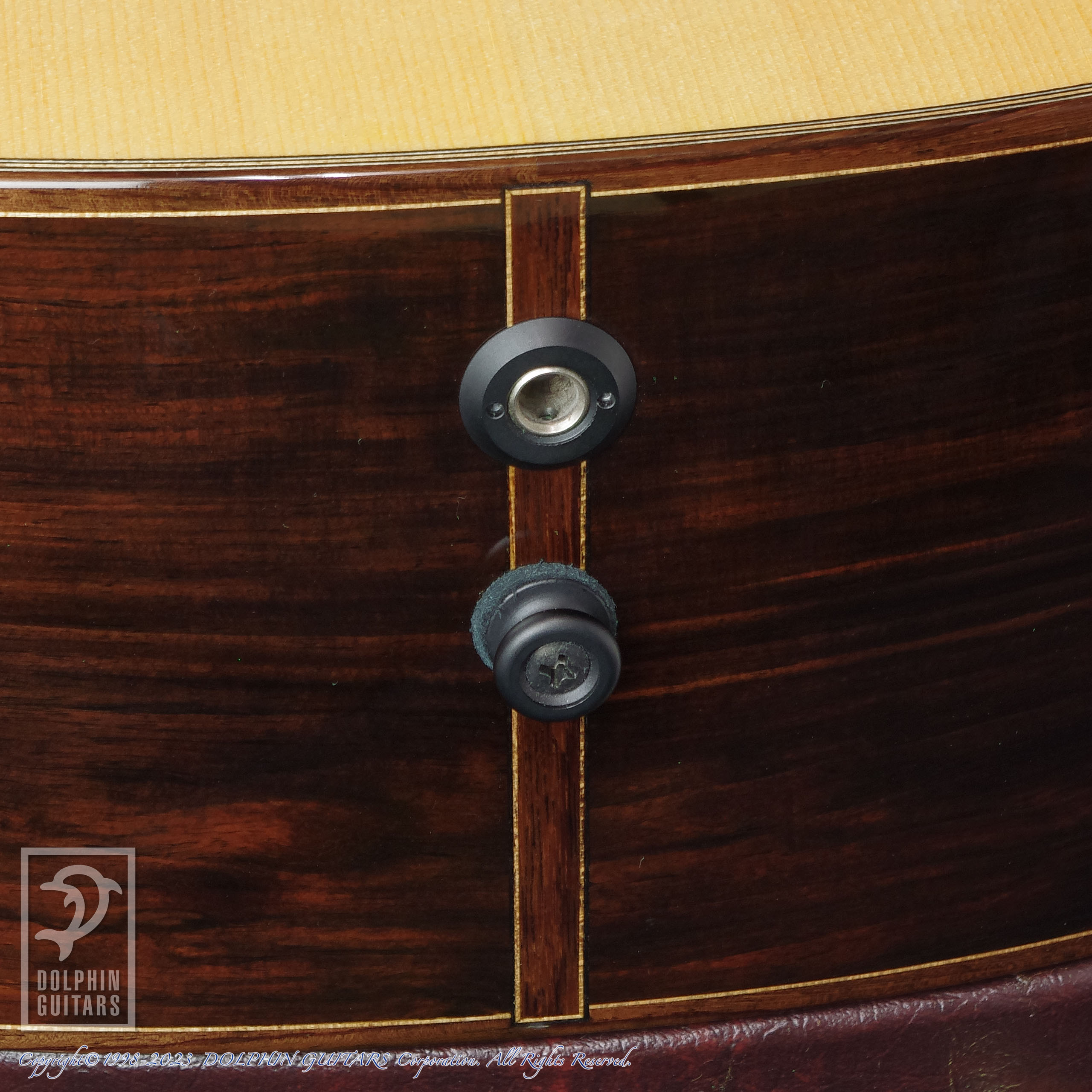 後付けにてアンフィニカスタムワークス コンタクトPUが搭載されており、エンド部にはジャックとストラップピンが装着されております。PUは2系統対応となっており、付属のサンライズ S-2 PUを接続し、デュアルシステムとして使用可能です。*ステレオシールド・2chプリアンプは付属しておりません。